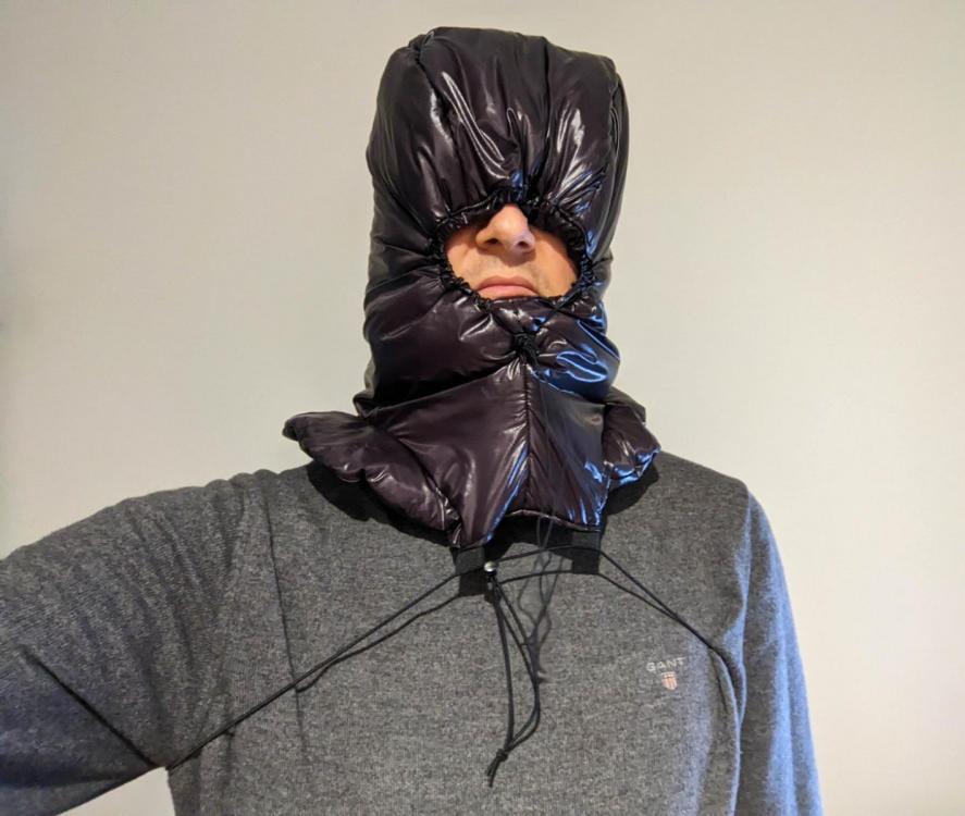 So, falls Euch das Resultat interessiert: Habe es jetzt mit Apex 133 gefüllt. Der Schnitt war fummelig, weil es einerseits so weit sein sollte, dass man noch eine Wollmütze etc. darunter ziehen kann, andererseits nur so weit, dass auch beim Zuziehen noch ein Luftloch verbleibt: Die kleinen Schulterstücke habe ich am Rand noch angenäht, weil ich hoffe, dass es dann bombensicher sitzt, wenn man den Quilt darüber zusammenzieht. Mal schauen, ob der Winter noch mal kalt genug wird, damit man es ausprobieren kann!