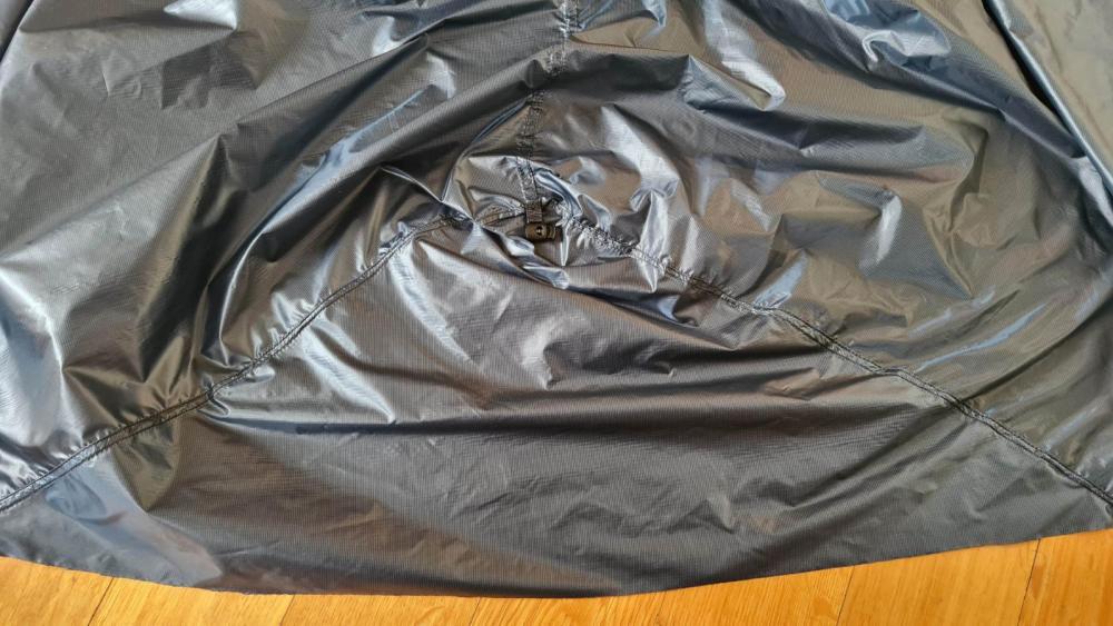 Liebe Nähfreunde, wir hatten letztes Jahr einmal diskutiert, ob man einen Windschutz-Bivy braucht und woraus man ihn nähen kann (dieser Thread). Da man den EE Recon Bivy leider nicht mehr bekommt, habe ich ihn mir nachgebaut und er hat sich seitdem bestens bewährt. Daher hier eine kleine Anleitung für Euch: 1) Der Boden besteht aus DCF mit 34 g/m2, ein Stück von 256,5 cm Länge, 121,5 cm Breite am Kopf und 101,5 cm Breite an den Füßen. Die Außenkanten werden dann 15 cm breit nach innen umgefaltet: 2) Anschließend werden die vier Ecken gefaltet, wobei die Spitze nach außen zeigt. Entlang der Senkrechten habe ich die Ecken dann mit DCF-Klebeband festgeklebt und in diese Klebefalz einen Streifen HD-PE als elastische Verstärkung mit eingeklebt. Anschließend habe ich die Spitze abgeschnitten und zwei Schlaufen aus DCF angeklebt, an denen man dann Abspannschnüre befestigen kann. Die Ecken stehen auf diese Weise schon ganz gut von allein und man kann sie zusätzlich für einen optimalen Aufbau noch mit einer durch beide Schlaufen gezogenen Schnur am Boden abspannen: 3) Die beiden Seitenteile bestehen aus Ripstop-Nylon mit 27 g/m2 (dieses hier) und Moskitonetz mit 25 g/m2 (dieses hier). Aus dem Nylon habe ich zunächst ein Dreieck und eine geschwungene Form geschnitten, aneinander genäht und dann mit Moskitonetz ergänzt: Die Maße hier sind 67 cm (linke Kante), 53 cm (rechte Kante) und 120 cm (untere Kante), jeweils ohne Nahtzugaben. Im Nachhinein würde ich den niedrigen Teil im Gesichtsbereich etwas höher schneiden, damit man weniger Wind ins Gesicht bekommt. 4) An die rechte Kante kommt dann noch je ein Viereck (53x46x75, ohne NZG). Anschließend wird im Bereich des Moskitonetzes ein Reißverschluss eingenäht (YKK 3C, Schieber auf beiden Seiten). Im Bereich der Vierecke werden diese einfach zusammen genäht. Wo der Reißverschluss endet, habe ich noch eine kleine Gurtbandschlaufe angenäht, daran kann man den Reißverschluss beim Zumachen festhalten. 5) Am Fußende wird sodann ein kleines gleichschenkliges Dreieck (kurze Seiten 46 cm, lange Seite 70 cm) eingenäht, am Kopfende ein großes Dreieck (67 cm und 90 cm). In das Fußdreieck habe ich später noch ein Loch mit Moskitonetz für bessere Belüftung eingenäht. Wo die Dreiecke die Firstnaht treffen, wird je ein Tanka mit Gurtbandbefestigung (sowas zum Beispiel) festgenäht. Durch diese Tankas habe ich dann jeweils ein Stück Gummischnur gezogen, an deren Ende ein Haken ist. Damit kann man das Bivy dann vorne und hinten abspannen. Die Verstellung der Spannung geschieht über die Tankas. 6) Zum Schluss wird das nun fertige Oberteil ringsherum an das Bodenteil angenäht. Im Einsatz sieht der Bivy dann wie folgt aus: Er hat sich sowohl letztes Jahr in Schweden als auch auf Touren hierzulande bewährt. Man hat innen ausreichend Platz, um sich wohlzufühlen (bin 1,87 m lang), fast wie in einem kleinen Innenzelt. Der Wind wird ausreichend abgehalten, sodass der Windchill deutlich reduziert wird. Mücken, Zecken und anderes Geviech werden zuverlässig ausgesperrt. Der Einstieg durch den mittigen Reißverschluss klappt problemlos dank der geringen Höhe und der flexiblen Abspannseile. Durch den hohen Moskitonetzanteil und den unbeschichteten Oberstoff hatte ich nie Kondensprobleme. Ach ja, das Wichtigste zum Schluss: 239 g.