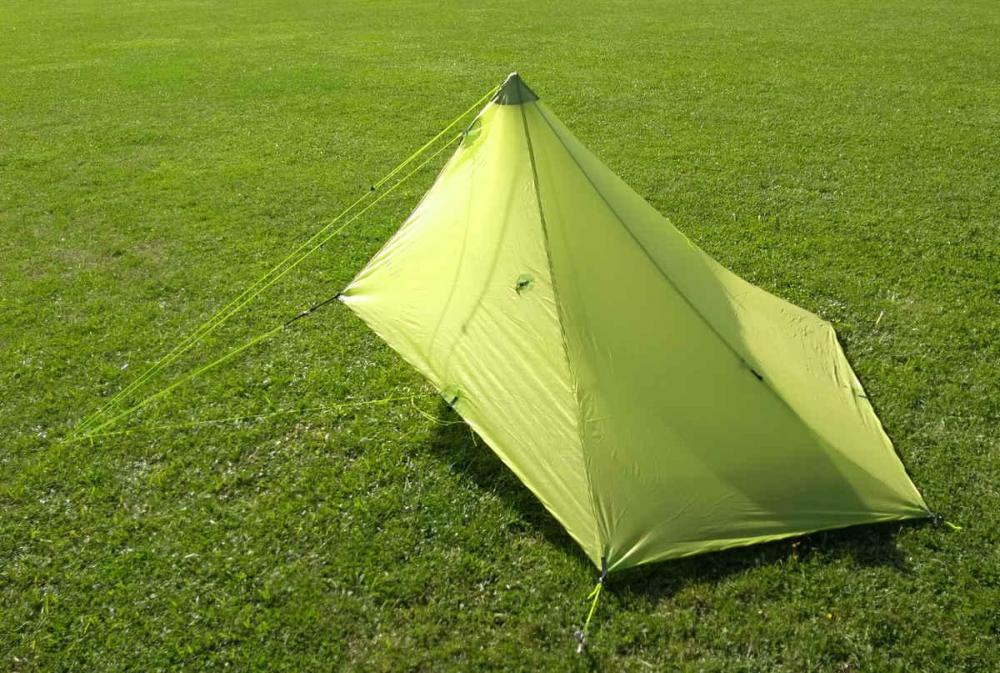 Genau. Allerdings ist das Trailstar trotz Grösse so, dass es für 2 Erwachsene und 1 Kind eng wird, ausser man kann ein Ende wirklich offen lassen (Ecke des 5-Ecks erhöht), also so: Hier der Einblick von vorne: Wenn die 5-Eck-Ecken am Boden sind und die Mitte einer Seite erhöht. wird es innen zu dritt zu eng, würde ich sagen. 1 Erwachsener + 1 Kind geht aber noch sehr gut. Ein Vorteil sollte vielleicht noch erwähnt werden: Es lässt sich sehr schnell "umkonfigurieren", ohne es abzubauen. So kann der Stock in der Mitte verlängert oder abgesenkt werden, und ein paar Heringe dann umgesteckt werden. Das ist sehr angenehm, wenn z.B. die Windrichtung dreht, oder das Wetter sich ändert und man das Tarp weiter öffnen oder stärker schliessen möchte.