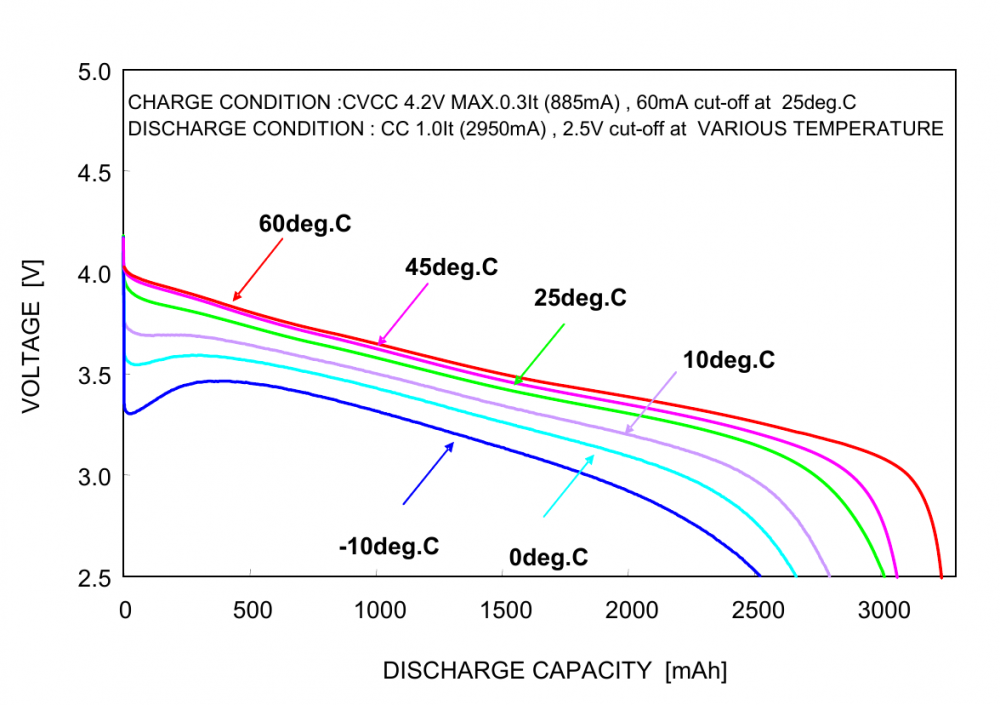 Jein, erstmal ist eine Hauptursache fuer den Unterschied auch, dass Du gegenueber der nominellen Akkukapazitaet eben den Akku auch nicht komplett leerziehen kannst, Die Ladeendspannung mag schon eine Rolle spielen, allerdings kommt es da drauf an, wie die Kapazität definiert ist. Die Spannung fällt am Ende der Entladekurve recht steil ab, so dass hier nicht mehr viel Kapazität anfällt. Aber du hast schon recht, von 3V auf 2.75V können da schon über 5% zusätzliche Kapazität anfallen, je nach Temperatur. Bei gekauften Akkus (Nitecore, Panasonic) konnte ich allerdings in Messungen die Nominalkapazität in mAh immer bestätigen, ohne dass ich bis auf 2.5V entladen hätte. Ich habe meist bei 2.8V aufgehört. Hier aus dem Datenblatt eines Panasonic 18650er-Akkus. Ich bin mir aber sicher, dass der Entnahmewirkungsgrad irgendwo um die 80-90% ist, aus den von mir genannten Gründen. Ich habe solche Akkus geladen und wieder entladen, und dabei gemessen, was rein- und rausging, und die Bilanz war so, dass die Schaltregler, wenn's gut ging, etwas über 90% Wirkungsgrad lieferten. Der Innenwiderstand des Akkus spielte auch eine erstaunlich grosse Rolle, da bei höheren Entnahmeströmen die am Reglere anliegende Spannung schon mal um ein paar Zehntel Volt abnahm. Die Einspeisung und Entnahme in mAh war genau gleich gross (Elektronen gehen also nicht "verloren"), die Leistung in mWh aber reichlich verschieden. Jedenfalls zeigen alle diese Gründe, inklusive der von dir genannten, dass die aufgedruckten Kapazitätsangaben nicht unbedingt der bei 5V entnehmbaren entspricht. Spannungsabfälle an Steckverbindungen und Kabeln spielen übrigens da auch rein, ich konnte da schon mal 0.1-0.2V Differenz messen. -