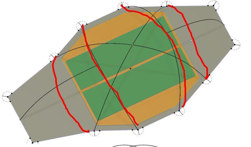 Mir ist bewusst, dass du eine geodätische Konstruktion planst. Trotzdem: wenn es aber um die Apsiden geht, hättest du wahrscheinlich mit dieser Tunnelkonstruktion (die 4 roten Linien) und 4 Stangen mehr Platz bei weniger Stangengewicht. Was die Stabilität angeht: ich hatte mal ein TNF Westwind (dieses da, mit 3 unterschiedlichen Bögen), welches durchaus wintertauglich war und extrem sturmstabil. Wo ist bei deiner Konstruktion übrigens der Eingang?
