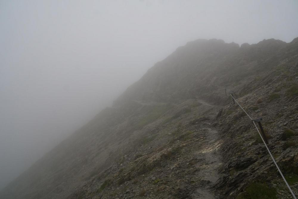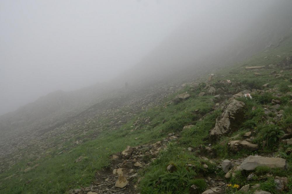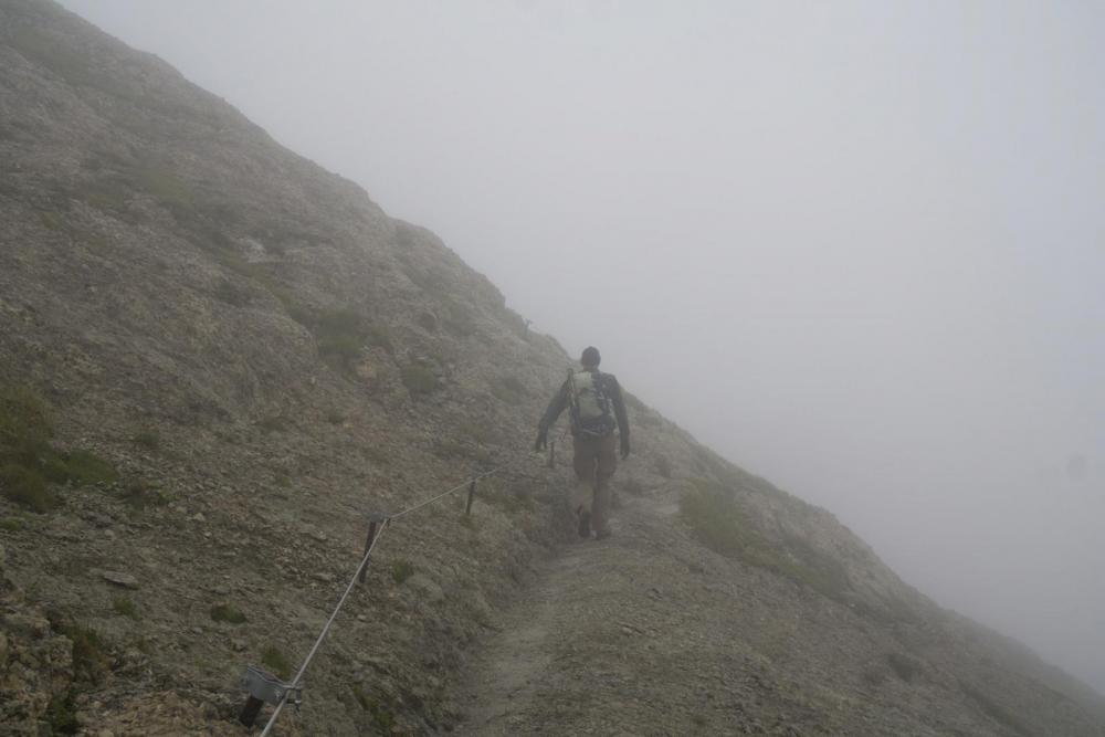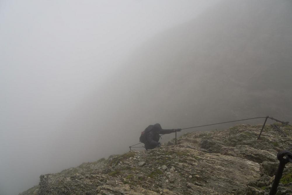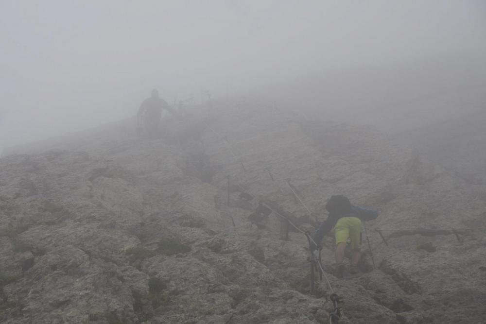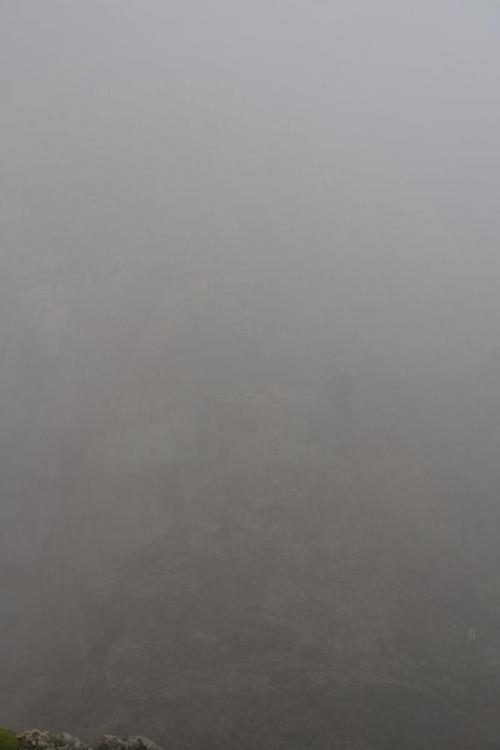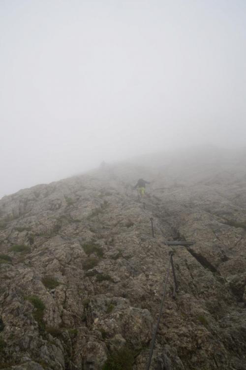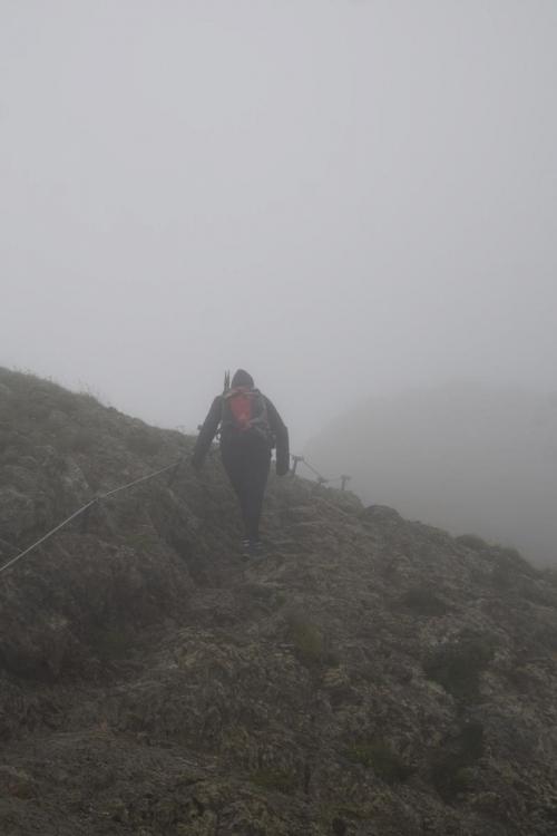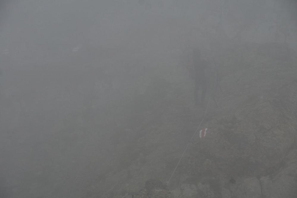 Um noch einmal das mit den Israelis aufzugreifen, sowie mein Kommentar dazu: garantiert in falschen Klamotten(farben) unterwegs, sowie der Einwurf, woher ich das wissen würde.... Gestern war für Säntis Sonne angekündigt, aber der Wolkendeckel hielt sich hartnäckig oberhalb von 2400m. Zu den 5°C am Gipfel kam Wind mit 60 km/h (Vorbote der heutigen Kaltfront, die hier am Nordrand oberhalb von 2800m etwa 25cm Neuschnee bringen wird). Aus dem 5°C werden mit Windchill, -2°C, und das Wasser des Nebels sorgt noch für einen extra Kühleffekt. So sahen die Leute aus, die mir auf dem Weg vom Säntis zum Schäffler entgegen kamen. An den eisernen Stiften unter dem Gipfel. Hier hatte es 60 km/h und die Kante lag voll im Wind. Mit kurzen Hosen sehr sportlich. Da braucht es nur eine kurze Pause im Wind, dann sind die beine ausgekühlt. der nächste kommt mir entgegen Blick auf den Wanderer aus 10m Entfernung (Schuss in den Gegenhang). und das, obwohl die Sicht an und für sich noch gar nicht wirklich übel ist. Konturen sieht man recht gut, aber eben graue Fläche auf grauem Hintergrund - das ist weg. der Nächste der Nächste und hier der nächste. wieder einer noch einer und zwei letzten zwei Gruppen Von 30 Leuten, die ich gezählt habe, bevor ich aufgehört habe, hatten gerade einmal 5 Leute Kleidung in rot, orange oder pink an. Der Rest war grau, braun, schwarz gekleidet. Von den sechs, denen ich in den Eisenstiften begegnet bin, und die sich an den Stahlseilen die Flossen abfroren, hatte keiner Handschuhe dabei (einer meinte noch beim Anblick von mir: "daran hätte ich denken sollen"). Einige kamen sportlich in kurzen Hosen daher, mit eisernen Unteschenkeln, und bei den Mädels waren Leggins als Hosen der Renner - sicher der beste Wärmeschutz im Wind. Ab 11 Uhr waren die Kollegen dann auch ständig am Herumfliegen: