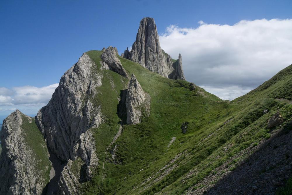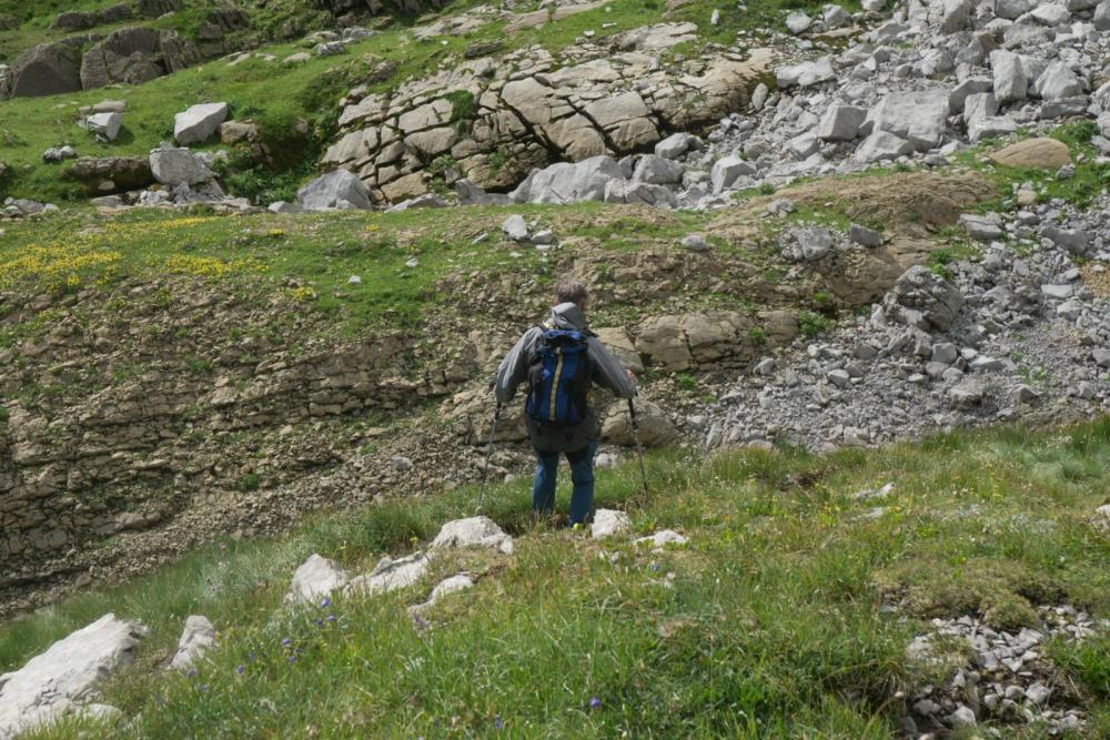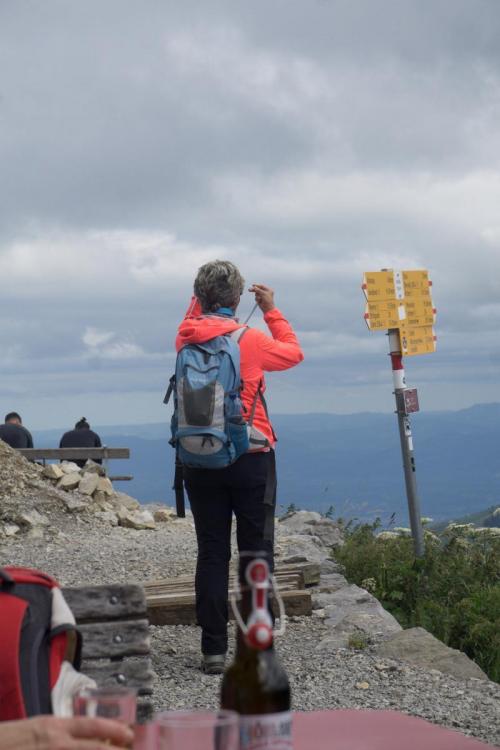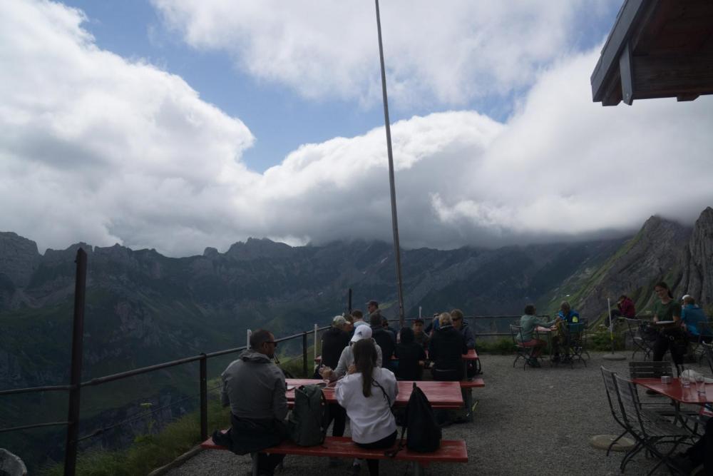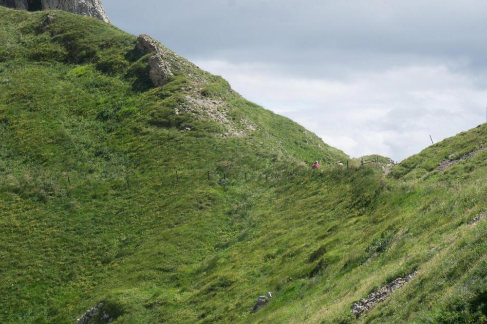 Auf dem gesamten Weg, inklusive dem harmlosen Abschnitt zwischen Ebenalp und Schäffler (wo sich wirklich alles tummelt, was Beine hat) sind mir sicher 200 Leute begegnet. leider verkleinert die Forensoftware die Bilder, denn was hier nicht sichtbar ist.... ... ist die Frau, die in der Scharte hockt. Die habe ich aufgrund der Farben auf Anhieb gesehen. Die Frau hier war eine von drei, die dank Neonfarben buchstäblich herausstach. so sieht die traurige Realität eben aus. Das Bild habe ich eigentlich wegen der herannahenden Wolkenfront geschossen, aber man sieht die Standardfarben grau, braun, schwarz, sowie maximal etwas weiss und/oder grün.