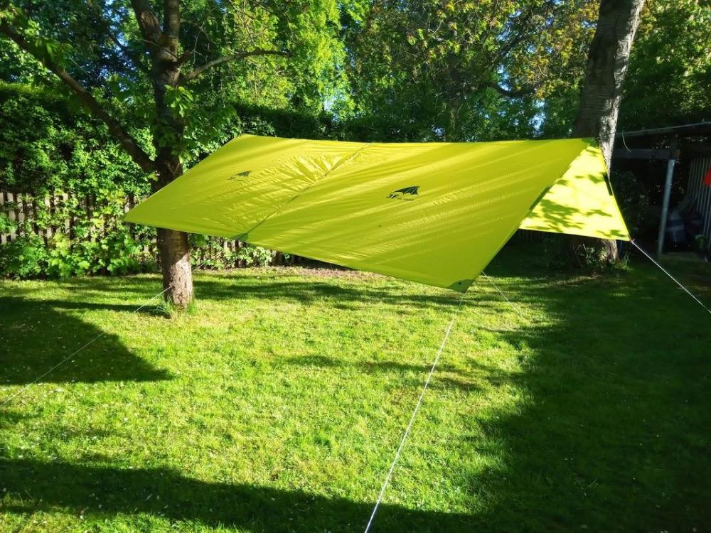 Kleines Update: Will an Himmelfahrt 4 Tage mit dem Teil im Harz nächtigen. Wird schon schief gehen. So von der Größe her erscheint es mir ausreichend, meine Hängematte zu schützen. Die Kapuzen hab ich jetzt auch noch per Druckknöpfen fixiert. Zuknoten hatte immer die Form zerstört. Gewicht mit 6 Leine und 7 Heringen + Firstleine beträgt 514g. crestfallen
