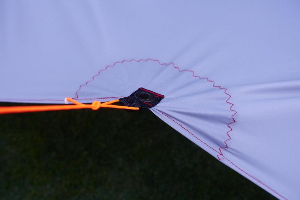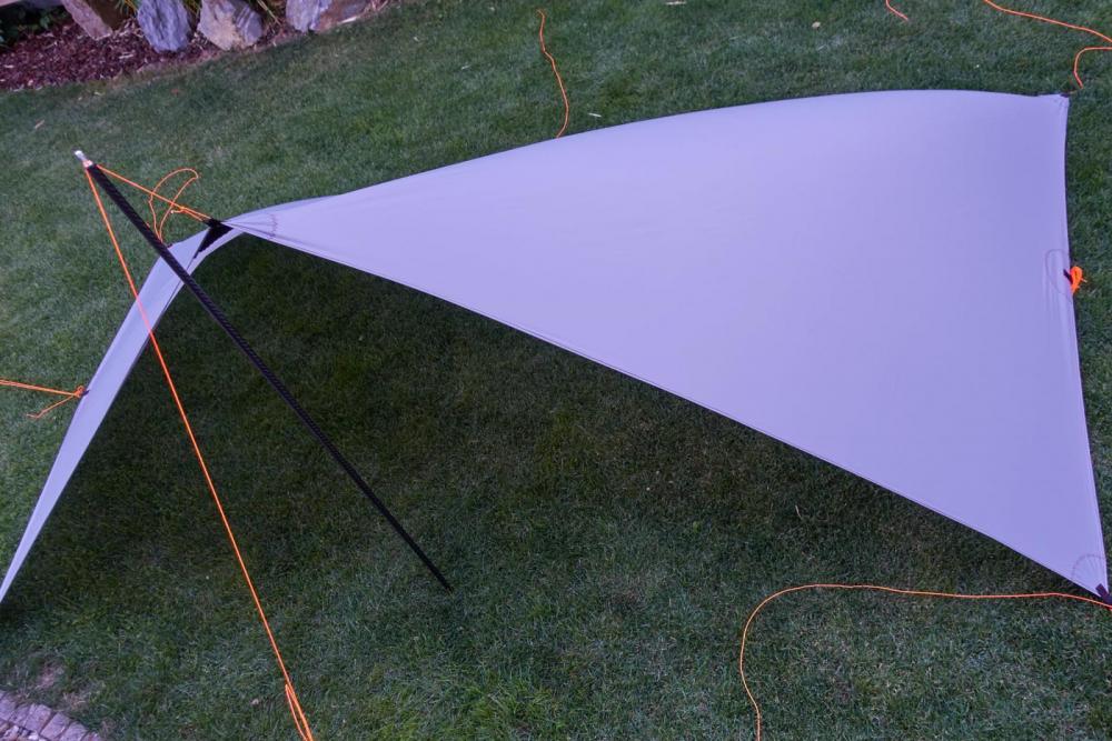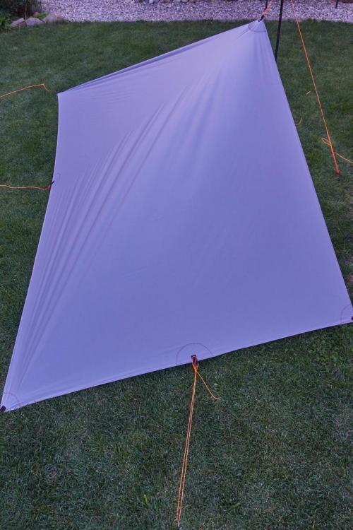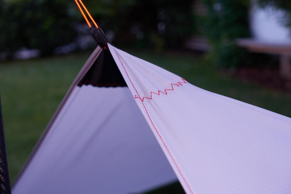 Wie bereits im Faden zu meinem kürzlich genähten UL Rucksack angekündigt, folgt hier der Bericht zu meinem MYOG Tarp. Im Vergleich zum Rucksack war das Tarp ein echtes Kinderspiel. Trotz des rutschigen SilNylons hielt sich der Nähaufwand (auch dank Obertransportfuß) in Grenzen. Die Daten: 197g incl. 8 Abspannleinen (170g nur das Tarp) 150*300cm Fläche (eine Stoffbahnbreite) 36g/qm Silnylon von ExTex Verstärkungen aus 90g Zeltbodenresten von meinem Rucksackprojekt Spannleinen 1,25mm Dyneema Kordel Der Zuschnitt war quasi nicht nötig - nur die Schnittkanten waren krumm und schief und wurden dementsprechend begradigt. Danach habe ich die Verstärkungen mit Prittstift fixiert und anschließend festgenäht. Dann nur noch die Kanten umschlagen und absteppen und fertig. Für meine Tarpstange habe ich an einem mittleren Abspannpunkt noch eine Öse angebracht. So ein Tarp ist ein absolut anfängertaugliches Projekt. Ich hätte vermutlich damit anfangen sollen sei's drum, das Ergebnis gefällt mir schonmal ganz gut. Größer muss ein Tarp für mich nicht sein. Materialtechnisch habe ich ein paar Bedenken bezüglich des 36g Silnylons. Es dehnt sich schon sehr deutlich, ich sehe es schon kommen, dass mir das auf kurz oder lang auf den Senkel gehen wird... Die Zukunft wird es zeigen. Ein bisschen Dehnung ist mir zum Aufstellen nicht ganz unrecht, aber hier ist es schon recht viel. Frage in die Runde - was wäre euer Material der Wahl für so ein Tarp - Cuben ist mir von der Bahnbreite leider einen Tick zu schmal und 6m Cuben zu verarbeiten kommt mir irgendwie wie Verschwendung vor. Stückelung wie von @Stromfahrer in einem anderen Thread thematisiert ist auch keine Option, die mir so richtig gefallen will. Wie stark dehnt sich das 55g Silnylon von ExTex im Vergleich? Gibt es andere Stoffe, die für so ein Tarp besser/ genauso gut geeignet sind wie das von mir verwendete 36g Silnylon - in der selben Gewichtsklasse versteht sich? Bei mir auf dem Schirm sind noch das 41g Chikara, von dem @Andreas K. so viel schwärmt und das 1.1oz Silpoly von RSBTR sowie das 23g SilNylon von Rockywoods. Bei ersterem habe ich Zweifel an der Wassersäule auf lange Frist gesehen - gibt es dazu einen verlässlichen Langzeitbericht? Die Suchfunktion konnte mir da leider nicht weiterhelfen. Bei dem Silpoly ist es vor allem die Reißfestigkeit, die mir Sorge macht. Auch hier konnte ich keinen verlässlichen Langzeitbericht finden? Das hauchdünne Material von Rockywoods ist mir tendenziell zu filigran, als das ich es ernsthaft verwenden möchte, aber gewichtstechnisch ist es natürlich verlockend...