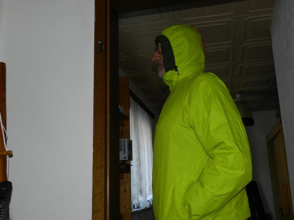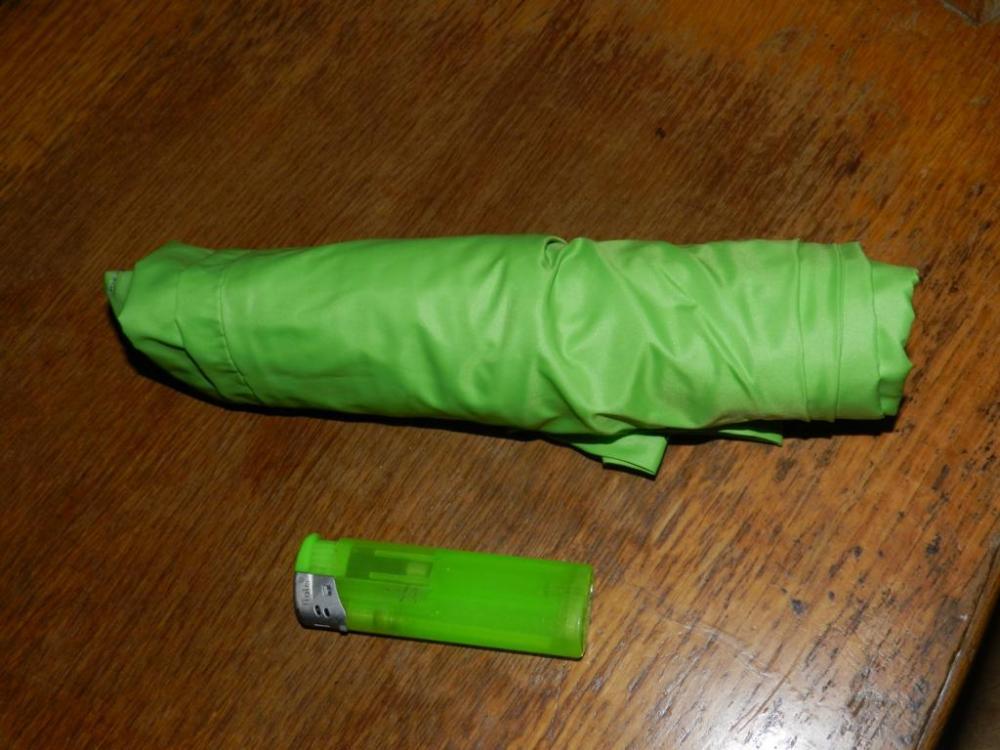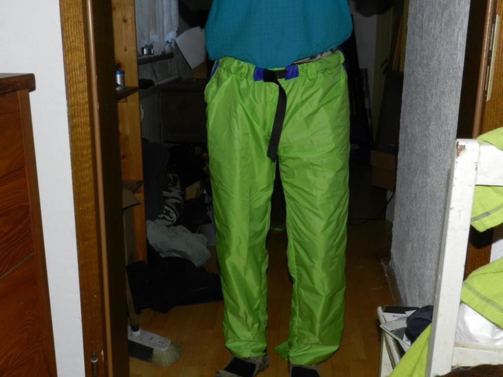 aber das ist ja gar nicht das thema. so hatte ich also den stoff übrig, taftfutter von extremtextil, 50g/m² in apfelgrün, für 3,90 eus je meter. als schnittmuster habe ich eine uralte hose von craghoppers, aus der zeit als der gründer noch die firma hatte. hüstel, das war 1893 oder so. als naht habe ich nur einfach eine seite doppelt umgeschlagen um die heissmesser-schnittkante zu verstecken. durch die grosszügige nahtzugabe geht das problemlos, die hose sollte eh ne weit geschnittene lockere hose werden. mit einmal nähen ist die naht fertig. oben am bund hatte ich vergessen, dass das original nen zusätzlichen streifen aufgenäht hatte, deshalb ist der bund etwas niedrig geworden, nächstes mal werd ich mich erinnern und einfach bissl mehr stoff zugeben. ich hätte gerne einen streifen gummizug im bund zusätzlich zum runden gummiband mit dem tanka. die taschen sind am original einfach nur innen auf die aussenhaut aufgenäht, ich wollte sie lose haben und hab deshalb doppelte taschen genäht, beweglich innen. wer keine will kann natürlich durch weglassen gewicht sparen. den gürtel hab ich wieder entfernt, einmal hat er das gewicht der hose fast verdreifacht, zum anderen war mir der bund zu knapp. die nahtlöcher sind nach dem waschen alle wieder geschlossen und verschwunden. über die gossen löcher aus denen der gürtel herauskam hab ich dem stoff der taschen eine kleine abdeckung genäht für den tanka mit gummizug. gewicht 111g für ne robuste hose. ich bin viel querfeldein im wald unterwegs, das steckt sie richtig gut weg, hätt ich nicht erwartet. auch ein einklemmen in der fahrradkette hat sie klaglos überstanden. das einzige das mich stört ist, dass sie total faltig aus der waschmaschine kommt und die falten nicht wegehen beim tragen. und die farbe. aber naja, gabs halt nur in apfelgrün. locker gerollt. vom volumen her ungefähr die hälfte der jacke, von gewicht her auch. und die jacke genäht hab ich damit. meine singer hat immer den faden nach unten durchgeschlauft und ich hatte keine lust mich auf fehlersuche zu begeben. letztendlich war dann eine falsche nadel schuld. aber meine wertheim dampframme erledigt auch solche arbeiten ohne zu murren.