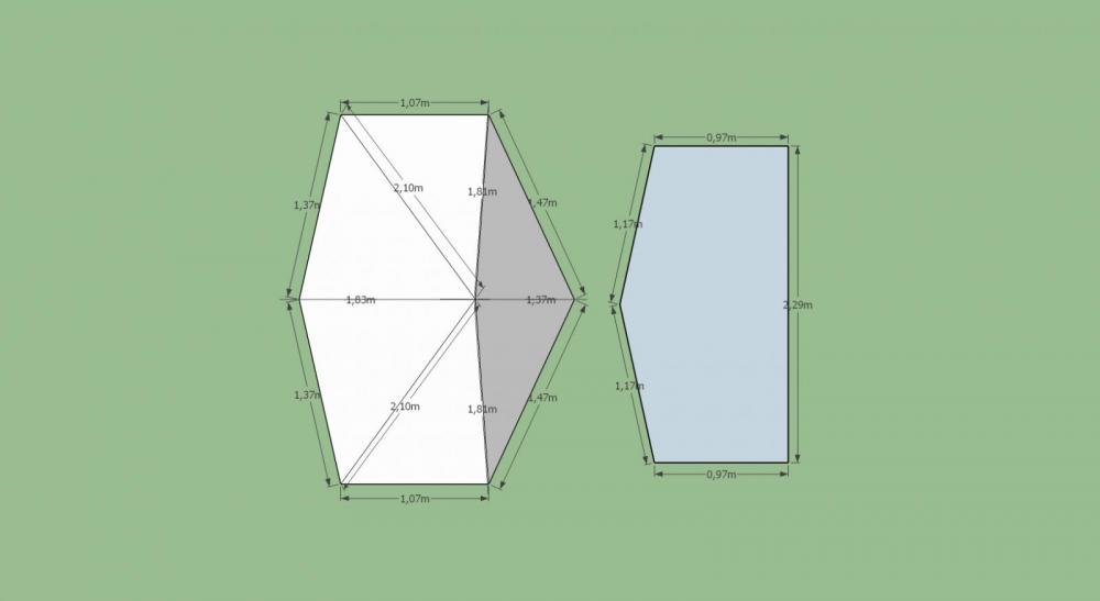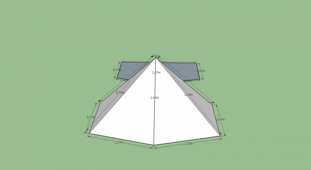 ich habe vor, mir in naher Zukunft ein Tarptent zu bauen. Ich habe dabei an eine Art Lunar Solo gedacht. Ich habe das auf dem PCT 2015 gesehen und fand es ziemlich interessant, da es eine Menge Platz bot, für ein 1-Personen-Zelt. Mehr Grundfläche finde ich persönlich wichtiger als Höhe. Die Maße habe ich mehr oder weniger von SMD und per Pythagoras errechnet. Nun habe ich mal bei Sketchup ein Modell erstellt, was meines Erachtens ganz sinnig aussieht. Nun meine Fragen: