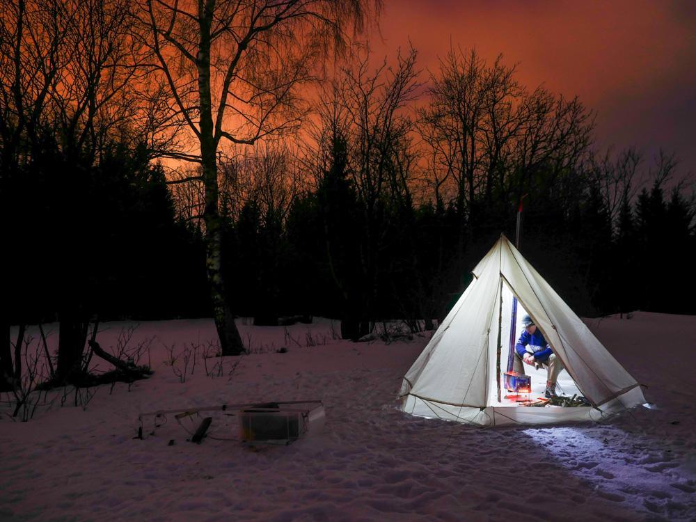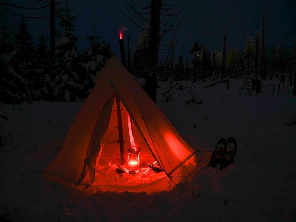 Einer der Gründe, weshalb Wintertouren potentiell anstrengender und wohl auch weniger beliebt sind als Trekkingtouren in der wärmeren Jahreszeit, ist die Kälte, der man nach dem ohnehin frühen Einbruch der Dunkelheit im Winter ausgesetzt ist. Viele hartgesottene Wintercamper verbringen deshalb notgedrungenermaßen einen erheblichen Teil der Tour im Schafsack. Auch im Zelt ist man zwar vor Niederschlag und Wind geschützt, aber eben nicht oder nur kaum gegen die Kälte. Abhilfe verspricht da nur ein Ofen im Zelt - aber der ist überlicherweise nur stationären Camps vorbehalten. Seit einigen Jahren gibt es jedoch Titanöfen, durch die die Wärmequelle im Zelt transportabel gemacht wurde. Und das eröffnet dem ambitionierten Wintercamper völlig neue Möglichkeiten, solange er sich denn in Gegenden bewegt, in denen es genügend Holz als Brennmaterial gibt. Ich habe mir vor zwei Jahren einen solchen Titanofen zugelegt, der zwar ziemlich teuer ist, mir aber eine völlig neue Outdoorerfahrung ermöglicht hat: das tagelange Unterwegssein im Winter. Der Seek Outside Titanium Woodstove ist allerdings in der Handhabung nicht unkompliziert, weil man ihn jedesmal mit Hilfe von Gewindestangen und kleinen (Zollgewinde)Muttern (die man in Deutschland nicht nachkaufen kann) zusammensetzen muss. Bei Minusgraden kann das eine echte Herausforderung sein. Einmal aufgebaut und angefeuert, entwickelt dieser Ofen jedoch eine tolle Wärmeleistung. Inzwischen gibt es auch ein europäisches Modell, aber das wiegt ein halbes Kilo mehr und wäre mir schon wieder zu schwer. Neben dem Ofen braucht man fürs Wintercamping aber auch ein Zelt - und davon besitze ich seit einigen Tagen sogar drei DIY-Modelle, die ich hier kurz zeigen will. Mein erstes Modell besteht aus einem Bauwoll-Polyester Mischgewebe, wiegt 4,5 kg und ist seit anderthalb Jahren so eine Art ständiger Begleiter bei den Wintertreffen der Berliner Hängemattenszene. Durch die Tipiform ist das Zelt relativ stabil, einfach aufzubauen und bietet (erprobtermaßen) bis zu 6 Leuten Platz, wenn man eng beieinander sitzt. Allerdings ist das Zelt für eine längere Tour viel zu schwer. Deshalb habe ich vor einigen Monaten ein Steilwandzelt angefertigt, das nur 1200 g wiegt und von den Dimensionen geradezu riesig wirkt. Hier braucht man zwei Aufstellstangen von 2 m, kann aber auch mit 1,86 m problemlos drin stehen und hat im Inneren wirklich viel Platz, der durch das Fischauge allerdings etwas verzerrt wirkt. Auch dieses Zelt wurde schon von den Berliner Hängemattisten getestet und für gut befunden. Aber es ist nicht besonders windstabil und für eine Tour wohl weniger geeignet als für mehrtägige stationäre Aufenthalte. Deshalb habe ich in Vorbereitung meiner kürzlichen Tour in die Alpen ein neues Zelt aus DCF geklebt und genäht. Und das wiegt (nach kleinen Veränderungen nach der Tour) nur 274 g und ist damit auch auf Mehrtagestouren voll transportfähig. Was die Wärmeleistung des Ofens angeht, ist man sowohl im Baumwolle-Polyesterzelt, als auch im Nylonzelt wie auch im Cuben-Zelt in kürzester Zeit von einem warmen Luftpolster umgeben - auch bei Minusgraden im Winter. Mich würde interessieren: was haltet ihr von solchen Hot Tents und wie schützt ihr euch, wenn ihr in der kühleren Jahreszeit unterwegs seid, gegen die Kälte?