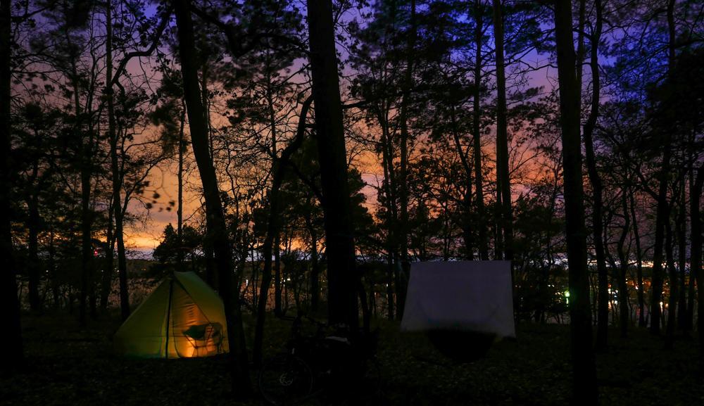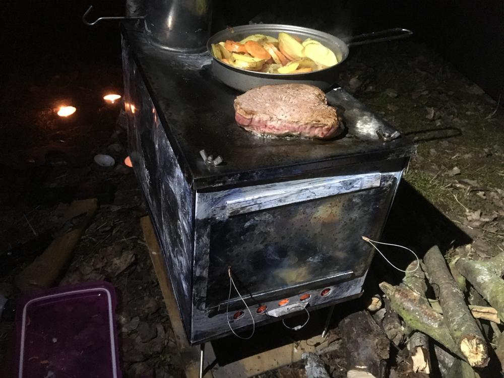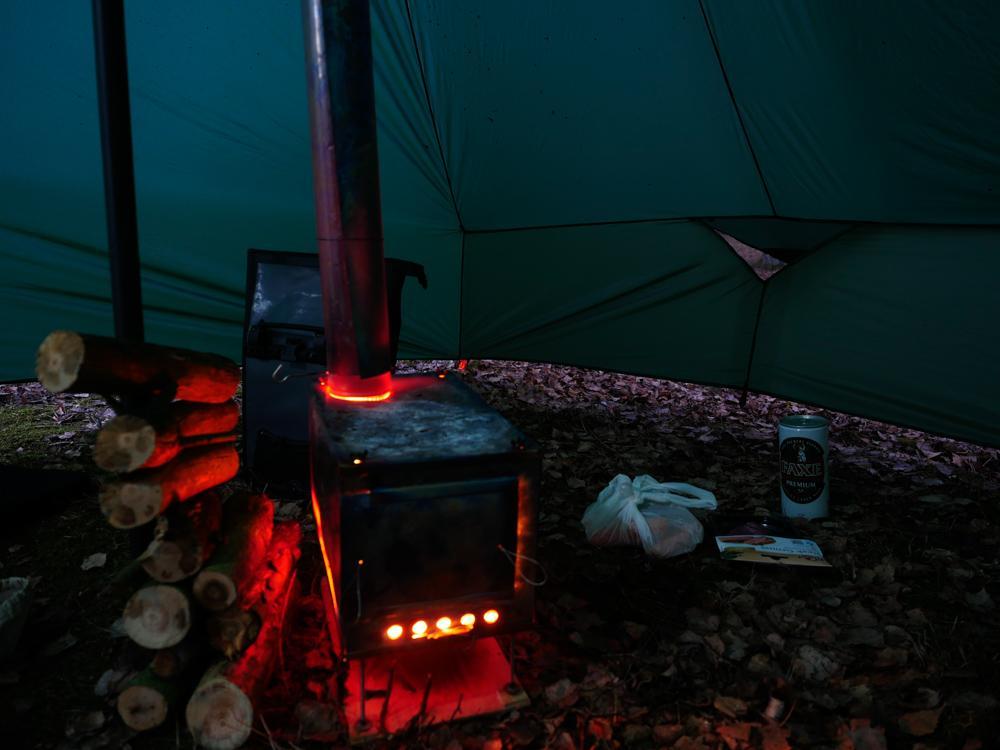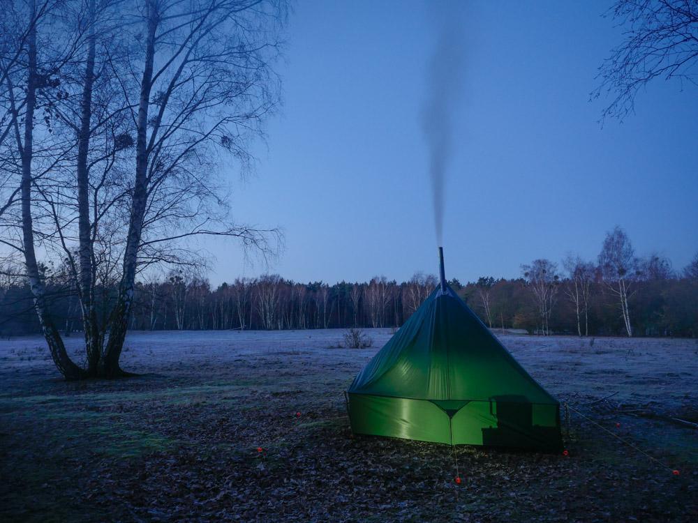 Um den Faden wieder etwas auf Titelkurs zu bringen, teile ich hier noch ein paar visuelle Eindrücke von meiner letzten Übernachtung vor drei Tagen. Ich habe wieder das DCF-Zelt gewählt, mit dem ich kürzlich in den Alpen war und habe mir darin direkt auf dem Ofen lecker was gebrutzelt. Die Nacht war mit 10°C erstaunlich warm, allerdings hat es durchgehend geregnet. Kurz Vorm Schlafengehen habe ich den Ofen noch mal bis obenhin voll Holz gestopft und, nachdem alles angebrannt war, alle Klappen dicht gemacht. Geschlafen habe ich in der Hängematte. Und siehe da: am nächsten Morgen war noch etwas Glut übrig, auf der ich direkt nachlegen konnte. Kurze Zeit später qualmte schon wieder der Schornstein. Ich glaube, diese extrem lange Wärme-Rückhaltedauer des Ofens ist eine ziemliche Ausnahme - nur möglich in einer relativ warmen Nacht. Voraussetzung ist außerdem, dass der Ofen eine gewisse Größe hat. Bei einem kleineren Modell wäre die Glut am Morgen wohl weg gewesen.