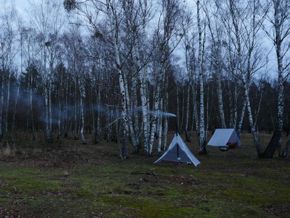 Weil es passte, bin ich letzte Nacht wieder mit dem Hot Tent rausgegangen, diesmal kam ein Freund mit. Da das DCF-Zelt zu klein gewesen wäre, habe ich diesmal das Silnylonzelt mitgenommen, in dem wir reichlich Platz hatten. Es gab einen schönen Nachthimmel - und bis Mitternacht reichlich Niederschlag. Übernachtet haben wir in der Cross Hammock - ich wieder mit dem schmalen DCF-Tarp drüber. Der Freund hat ein Cross Hammock Wintertarp verwendet. Ich habe in alter Manier abends den Ofen voll Holz gestopft. Da die Temperaturen auf 1°C runtergingen, war - anders als letzte Woche - heute Morgen nicht das kleinste Bisschen Glut mehr vorhanden. Also musste neu angefeuert werden.