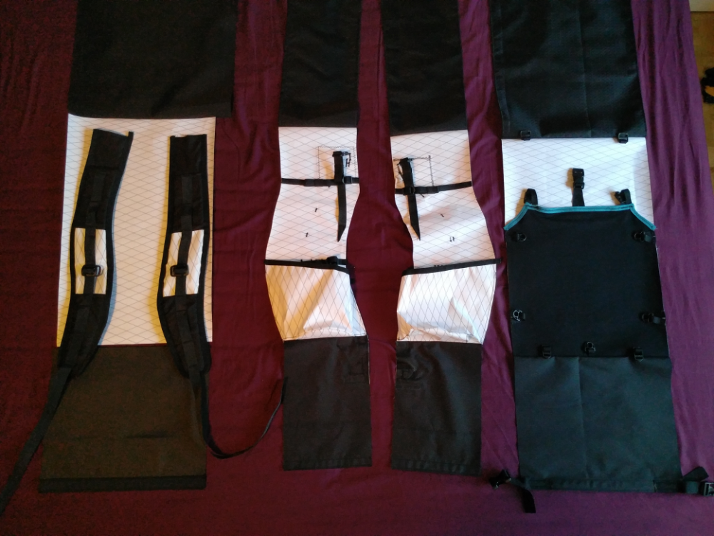 So, jetzt sind die Schultergurte und Hüftflügel fertig, zudem hab ich in das Rückenelement 4 lange Taschen für 4 Carbonstäbe eingenäht.(Liegen hinter der Sitzkissentasche, 3dMesh) Diese kann ich dann entnehmen und mir einen 120cm Tarp Pole zusammenstecken. Alle sind mit Alumuffen versehen.