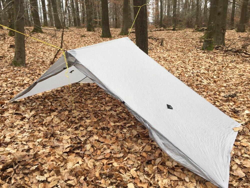 Moin! Ich nutze gerne für mich Alleine oder mit meiner Freundin zusammen auf Tour das SMD Heaven Tarptent ohne Innenzelt. Uns störten beim gemeinsamen Schlafen immer die beiden Trekkingstöcke in den Apsiden. Daher hab ich mir überlegt, ob man das Tarptent nicht einfach mit Hilfe zweier geknüpfter Slitlines inkl. Karabiner zwischen zwei Bäumen aufspannen bzw. aufbauen kann. Geknüpfte Slitlines aus DCF begeiten mich schon lange auf Touren um Tarps über Hängematten aufzuspannen bzw. aufzuhängen.. Das ganze hat ziemlich gut funktioniert und wirkt auch stabil.. natürlich muss man erst mit der Höhe der Slitlines variieren und tüfteln um die optimale Höhe für das Zelt zu finden. So sieht das ganze aus: