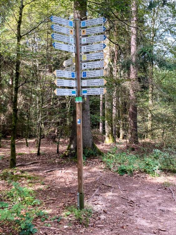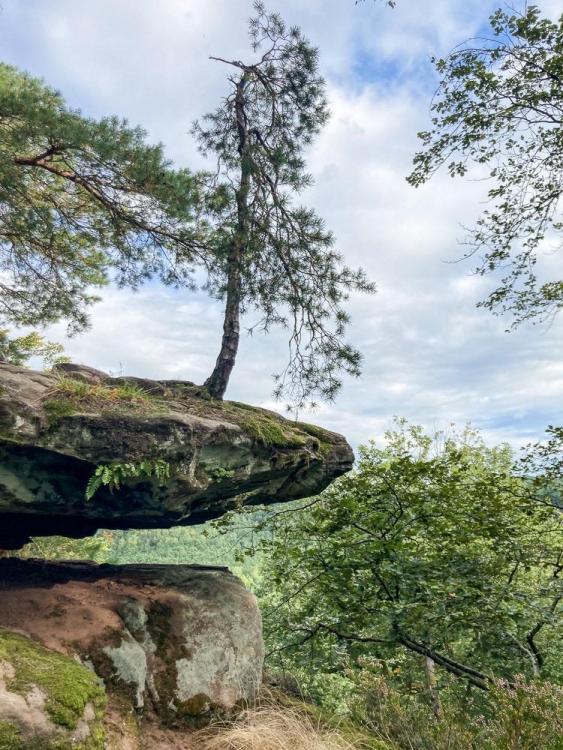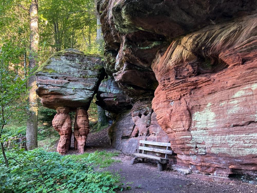 Ein paar Bilder (alle Fotos selbstgeknipst) von einer spontanen Wochenend-Tour im hinteren Pfälzerwald. Die B10 zerschneidet den Pfälzerwald, hier eine der relativ wenigen Querungsmöglichkeiten für Fußgänger: Kanzelfelsen (wenn ich mich recht erinnere): Protestantische und katholische Kirche Erlenbrunn gleich nebeneinander: Hohler Felsen: entlang der Altschlossfelsen: auf den Altschlossfelsen: Spießweiher: Abends auf dem Eulenfels: Cowboy-Camp auf dem Eselskopf: Morgennebel in den Tälern: Frühstück an der Krappenfels-Aussicht: Zigeunerfelsen: Aktives Tourismus-Marketing: Jede mögliche Wanderrunde im Dahner Felsenland hat ihren eigenen Namen und Symbol bekommen. Und alle Wege führen zur PWV-Hütte: