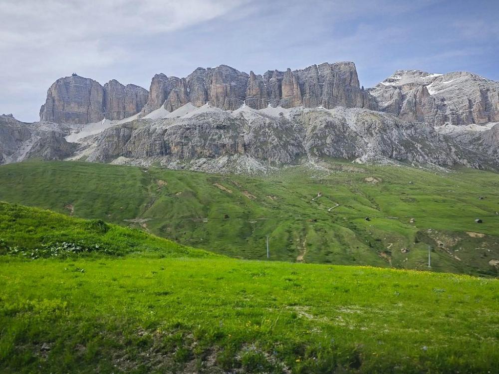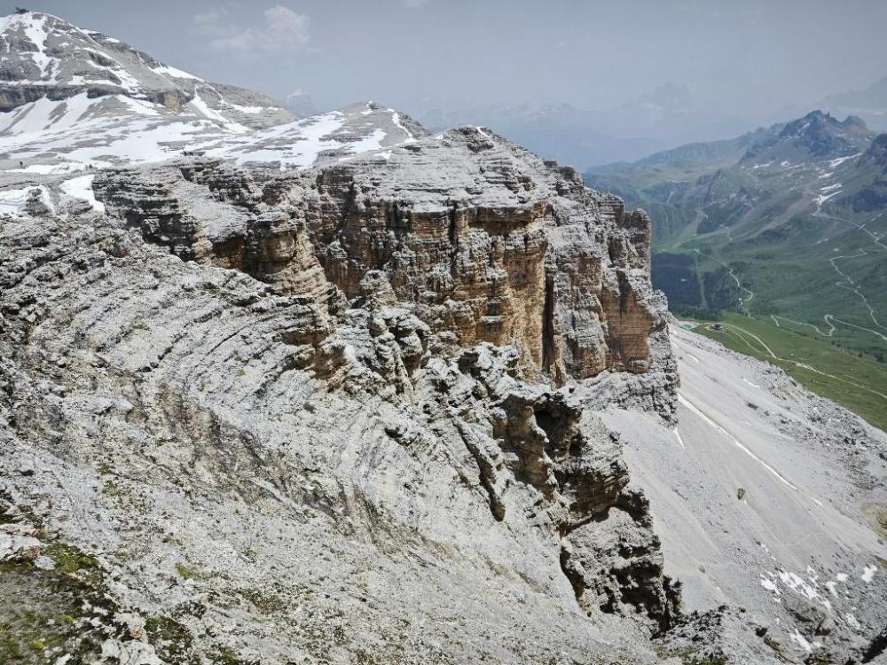 Nach ein bisschen Sightseeing mit Bussen und kleineren Wanderungen kam ich über das Sellajoch zum Pordoijoch, das mit seinen 2239m der höchste asphaltierte Pass in den Dolomiten ist. Dort nahm ich die Seilbahn zum Sass Pordoi 2950m hoch und konnte die Pläne, da oben ein paar Tage zu verbringen wegen zuviel Schnee und einem angekündigten starken Gewitter am Abend gleich begraben: das war mir zu heikel! Sicht zum Piz Boè Die Ausblicke waren trotzdem toll!