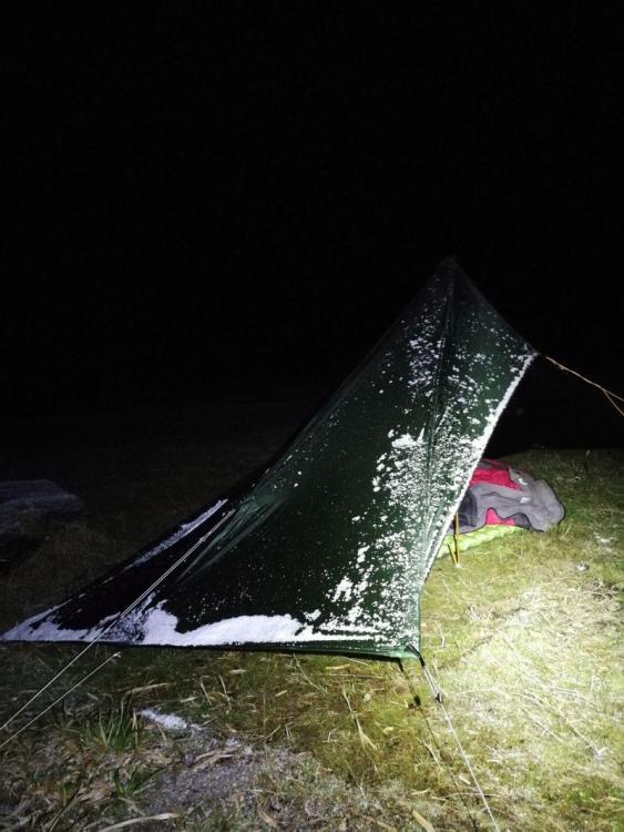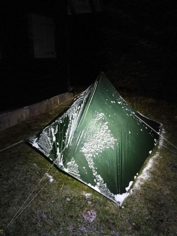 Ich habe leider noch keine besseren Fotos parat. Hier die Eckdaten: 291g Tarp (inkl. Schnüre, Line-Loks) 61g Stange (inkl. Korken gegen Einsinken) 115g 8 Heringe (gem. Sortiment, bin noch am Evaluieren) 6g Packsack Gewicht komplett: 473g Der Stoff ist SilNylon 40g/m². Mein Ziel war es beim Tarpstoff unter der Hälfte des DD Tarps zu bleiben, das bei 460g liegt und für zwei Personen reicht. Das ging nicht ganz auf. Die Tarpstange kürze ich noch um das kleine Segment, das man auf den Fotos sieht, dann müsste sie bei 120 cm sein. Das Aufstellen ging extrem leicht und schnell von der Hand, das bin ich vom Rechtecktarp nicht gewöhnt. In der Nacht musste ich vier Mal aufstehen und war dann sehr froh, dass man aus dem Querschläfer so viel besser heraus kommt, als aus einem DD Tarp als A-Frame aufgespannt. Wir haben direkt einen Rekord aufgestellt und 11 Stunden geschlafen! Die Matte, die man auf dem Foto sieht ist eine "Sea to Summit Comfort Light Insulated Mat Large". Ich bin 1,96 groß und habe super rein gepasst. Zur hinteren Wand ist noch sehr viel Platz. Ich habe keine Ahnung wie ihr eure Schnittmuster macht, ich habe es so zusammengepfuscht: Basis ich eine Stoffbahn 390x150 cm. Die Dreieck wurden herausgeschnitten und unten (grau) angenäht. Das Beak ist beim Prototyp zu flach und beim finalen Produkt zu steil geraten. Die drei Abspannpunkte in der Mitte des Stoff sitzen leider auch nicht richtig. -