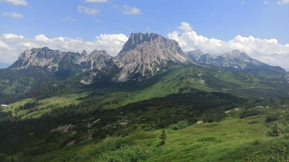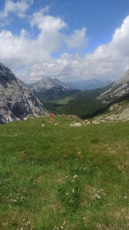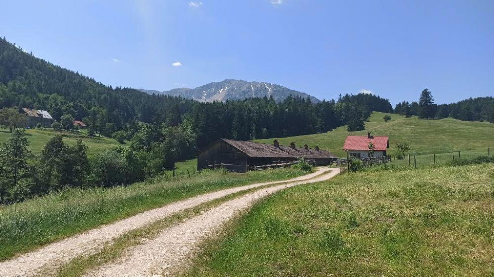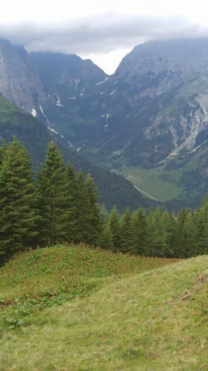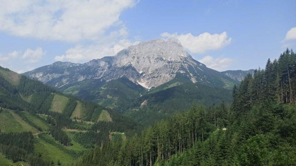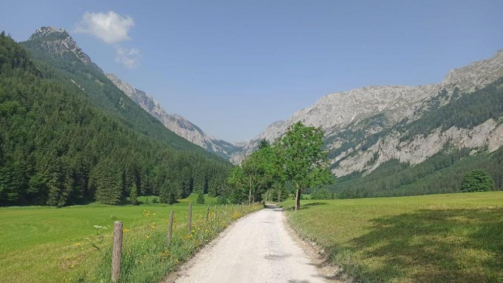 Tag 9 (23.06.) Eisenerz bis Hartelsgraben Jagdhütte, 28 km (1.900 hm auf) Von Eisenerz führte der Weg weiter nach Radmer an der Stube. Nur total langweilige Forstwege, die Wanderwege hatte man wieder zuwachsen lassen – das war der bisher mit Abstand unattraktivste Wegabschnitt. Einzig lohnenswert war die Aussicht auf den Lugauer. Auch Radmer an der Stube fand ich nicht besonders attraktiv, so dass ich dort nur eine längere Mittagspause im Schatten einlegte (immerhin gab es einen Bach, in dem man die Füße kühlen konnte), bevor ich mich an den nächsten Aufstieg über eine Flanke des Lugauer machte. Eine völlig unzutreffende Wegbeschreibung bei outdooractive („Forststraße bis zum Schoderkreuz“) hatte mich zu der Annahme veranlasst, dass der Weg nach oben praktisch ein Spaziergang werden würde (schon ein genauerer Blick auf die Karte hätte mich eines besseren belehrt). Den Wegabschnitt, der dann kam, habe ich ziemlich verflucht, es ging nämlich über völlig zugewachsene Pfade durch Wald und Wiesen. Im untersten Abschnitt zog ich in Anbetracht zahlreicher Brennesseln und Brombeerbüsche trotz der Hitze meine Regenhose an, die mir als das kleinere Übel erschien. Oberhalb der Baumgrenze ging es dann durch Fels und Geröll weiter und stellenweise wurde es ordentlich steil. „Forststraße“, sehr witzig, kann ich da nur sagen (oder komisches Verständnis davon, was eine Forststraße ist). Als ich oben ankam, war ich ziemlich erledigt. Das war der letzte Teil der "Forststraße" (wie steil es nach oben ging ist leider nicht zu erkennen): Dort oben konnte ich aber nicht bleiben (kein Wasser, kein Zeltplatz – zumal es in den Nationalpark Gesäuse ging), so dass ich wohl oder übel den Abstieg querfeldein über eine Wiese begann. Dort legte ich, weil ich aus Erschöpfung/Unkonzentriertheit ein Loch in der Wiese übersehen hatte, meinen zweiten Sturz hin, der aber zum Glück ebenfalls keine schlimmeren Folgen hatte. Auch der weitere Wegverlauf war nicht geeignet, meine Begeisterung für diesen Wegabschnitt zu wecken. In zahlreichen Kehren ging es eine Forststraße hinunter, die man zwar laut Wanderkarte abkürzen konnte. Die Einstiege waren aber so zugewachsen, dass mir unklar war, ob dieser Wanderweg überhaupt noch existiert. Ob meiner Verfassung wählte ich lieber den sichereren (aber längereren) Weg. Aufgrund des Zustandes der Wege hatte ich irgendwie das Gefühl, dass Wanderer hier unerwünscht sind. Da ziemlich klar war, dass ich es an diesem Tag nicht mehr bis zur nächsten Hütte (das wäre die Hess-Hütte gewesen) schaffen würde, begann ich mich nach einer Übernachtungsgelegenheit umzusehen. Ich hatte dabei zwar nicht das allerbeste Gefühl, entschied mich dann aber - auch in Ermangelung besserer Optionen - bei der Hartelsgraben Jagdhütte zu bleiben. Gegenüber der Hütte gab es einen Picknicktisch mit Brunnen und in der Nähe auch einen Bach, indem man sich waschen konnte (ist das schon #glamping?). Nachdem ich mich dort längere Zeit herumgetrieben und gewaschen und gegessen hatte, ohne dass sich auch nur eine Menschenseele hatte blicken lassen, entschied ich mich, auf der überdachten Veranda der Hütte zu schlafen und mein Zelt nicht aufzubauen – einerseits war ich dazu zu faul, andererseits dachte ich, dass ich so weniger auffalle und mich schneller aus dem Staub machen kann (ich wurde unterwegs ständig gefragt, ob ich so alleine nicht Angst habe – meine größte Angst ist tatsächlich, irgendwann mal morgens, von einem Jäger mit der Flinte in der Hand geweckt zu werden ). Nachts lernte ich dann, solche Entscheidungen in Zukunft besser zu überdenken... Über die Jagdhütte zog ein nicht angekündigtes Gewitter her, geweckt wurde ich vom Regen, der unter das Verandadach geweht wurde und bei genauerer Betrachtung war ich mir nicht sicher, wie dicht das Dach wohl ist. Zum Glück regnete es nur wenig, so dass ich nochmal mit einem blauen Auge davon kam. Tag 10 (24.06.) Hartelsgraben Jagdhütte bis Oberst-Klinke-Hütte, 24 km Nach dieser wenig erholsamen Nacht lief ich morgens schon mit müden Beinen los. Es folgte ein längerer Aufstieg durch die Sulzkaralm (700 hm, die ich zu diesem Zeitpunkt als „ordentlichen Aufstieg“ bezeichnete – worüber ich zwei Monate später nur müde lächeln konnte und mich wunderte, was für ein Weichei ich zu dieser Zeit noch war ), vorbei an einer beeindruckenden Felswand, die noch im morgendlichen Nebel hing. Ich traf auf einen Senn, der erzählte, dass er gerade alles für die Kühe fertig mache, die am nächsten Wochenende auf die Alm getrieben werden sollten. Das letzte Stück bis zum Sulzkarhund ging es ordentlich steil nach oben und schon um 8:00 Uhr lief der Schweiß in Strömen. Dafür wurde ich allerdings durch eine Gruppe Gemsen, die mit ihren Jungen unterwegs war, entschädigt. Alles was ich hoch gelaufen war, ging es dann auf der anderen Seite wieder runter. Im Tal wartete allerdings erstmal eine Naturkneippanlage auf mich, bei der ich länger rastete. Der Versuchung, in Johnsbach gleich die nächste Pause einzulegen, widerstand ich und machte mich an den nächsten Aufstieg zur Mödlinger Hütte (750 hm). Die Hütte fand ich irgendwie wenig einladend. Wenn ich noch bis zur Oberst-Klinke-Hütte weiterliefe, wäre außerdem der nächste Tag, an dem es bis Rottenmann gehen sollte, schön kurz. Daher legte ich nur ein kleines Päuschen ein, das sich zudem wenig gemütlich gestaltete, da ein starker Wind aufkam und unklar war, ob das Wetter hält. So brach ich schneller als gedacht zum letzten Stück Weg (nochmal 300 hm ab und dann wieder 300 hm auf) vor beeindruckender Felskulisse (müsste der Admonter Kalbling gewesen sein) zur Oberst-Klinke-Hütte auf. Die Kässpätzle dort kann ich nur wärmstens empfehlen und nachts schlief ich wie ein Stein. Tag 11 (25.06.) Oberst-Klinke-Hütte bis Rottenmann, 16 km Richtung Rottenmann lief ich die letzten Kilometer auf dem Nordalpenweg, den ich nach gut 260 km schon wieder v