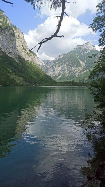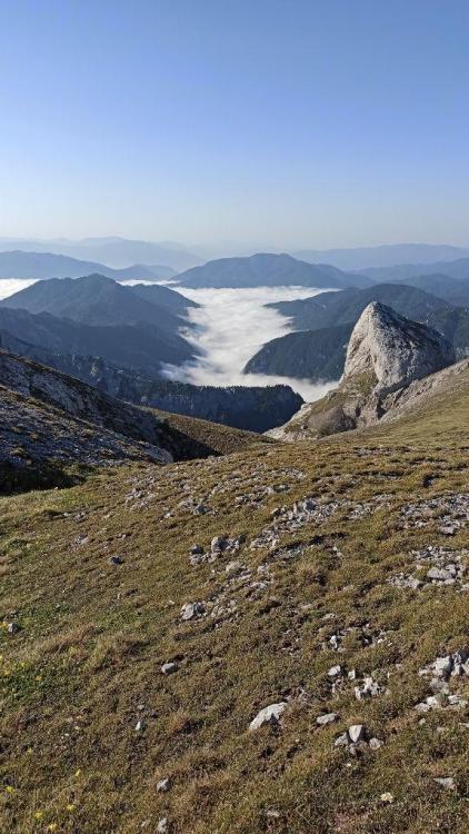 Tag 6 (20.06) Neuberg an der Mürz bis Turnauer Alm, 28 km Nachdem ich in Neuberg an der Mürz nicht nur eingekauft, sondern auch meine Klamotten gewaschen hatte (das wäre generell ein Tipp: in Pensionen und Gasthäusern – insbesondere in von Frauen geführten - einfach nachfragen, ob man dort waschen kann; die meisten haben meine stinkenden Klamotten direkt in die Waschmaschine geschmissen und manche wollten nicht mal Geld dafür), folgte am nächsten Tag der nächste Aufstieg, bei dem es ziemlich durchs Gemüse ging. Der Nordalpenweg macht hier einen größeren Schlenker über Krampen, dessen Schönheit sich mir nicht erschlossen hat. Das nächste Mal würde ich daher direkt über den Wanderweg 481 aus Neuberg aufsteigen und dann wieder auf den Nordalpenweg einschwenken. Oben angekommen ging es erfreulicherweise nicht gleich wieder runter, sondern ein längeres Stück mit nur mäßigem Auf und Ab in der Höhe entlang. Und da der Gipfel praktisch auf dem Weg lag, machte ich noch einen kurzen Abstecher auf die Hohe Veitsch. Von der Hohen Veitsch ging es mit schöner Aussicht am Graf Meran Haus vorbei weiter bis zur Turnauer Alm, bei der ich das Gefühl hatte, dass es für diesen Tag genug ist mit wandern. Eigentlich ist die Turnauer Alm nur von Donnerstag bis Sonntag geöffnet, aber die beiden sehr netten Pächterinnen Manuela und Ute (die am nächsten Tag auch noch einen Geburtstag zu feiern hatten), erlaubten mir netterweise, mein Zelt dort aufzustellen. Und auch die Verpflegung auf der Turnauer Alm kann ich nur wärmstens empfehlen :-). Tag 7 (21.06.) Turnaueralm bis Schiestlhaus, 22 km An Tag 7 startete ich früh, da ich mir ein größeres Stück Weg vorgenommen hatte (und außerdem wurde es eh so früh hell). Es sollte in die Hochschwabgruppe gehen und ich wollte schauen, ob ich an diesem Tag noch über den Gipfel komme. Bis Seewiesen ging es recht unspektakulär weiter. Dort hatte jemand netterweise für durstige Wanderer Getränke im Brunnen kaltgestellt, nebst eines Kässchens für den entsprechenden Obolus. Und dann ging es Richtung Hochschwab, zuerst noch relativ langgezogen durchs Tal, dann folgte ein erster Aufstieg zur Voisthaler Hütte. Unterwegs fing es leicht an zu nieseln, hörte dann aber wieder auf. Dabei hatte ich in Seewiesen extra noch kurz die Wettervorhersage gecheckt, die gutes Wetter ankündigte. Und von dort ging es weiter nach oben Richtung Schiestlhaus. Es galt zahlreiche Schneefelder zu queren und ich war froh, nicht früher im Jahr gestartet zu sein und durch noch mehr Schnee stapfen zu müssen. Dem Schmelzwasser sei Dank konnte ich dafür meine Wasserflasche nochmals auffüllen – eigentlich gibt es dort überhaupt kein Wasser (auch das Schistlhaus hat keine Quelle). Gegen 15 Uhr kam ich im Schiestlhaus (etwa 30 min vor dem Gipfel) an. Eigentlich hatte ich geplant, dort ein längeres Päuschen einzulegen und noch am selben Tag über den Hochschwab wieder auf der anderen Seite abzusteigen und zu zelten. Dann bekam ich aber eine Lektion in Sachen Unberechenbarkeit des Wetters in den Bergen erteilt. Plötzlich nahm der Wind zu, es wurde immer dunkler, erste Hagelkörner fielen, in sekundenschnelle war der Nebel da (und nach kurzer Zeit auch wieder weg), dann fing es richtig an zu hageln und zu regnen. Nichts davon hatte der Wetterbericht vorhergesagt. Ich entschied mich spontan, die Nacht im Schiestlhaus zu verbringen... Hier würde ich mir das nächste Mal übrigens überlegen, statt auf dem Nordalpenweg über die Aflenzer Staritzen zum Schiestlhaus zu laufen (habe mehrfach gehört, dass dieser Weg angepriesen wurde). An diesem Tag war ich aber froh, nicht an einer ausgesetzten Stelle in das Unwetter gekommen zu sein. Tag 8 (22.06.) Schiestlhaus bis Eisenerz, 32 km (+ 2 Bonus-km für nicht auf die Karte schauen ) Morgens ging es bei klarem Himmel und Sonnenschein (und ordentlichem Wind) die letzten Meter auf den Hochschwab (2.277 m), den bisher höchsten Gipfel mit toller Sicht. Dann folgte eine wunderschöner, langgezogener und weitgehend knieschonender Abstieg Richtung Eisenerz. Päuschen am See. Hier traf ich eine Bäurin, die auf der Suche nach zwei Kühen waren und meinte, die seien neu hier und würden sich noch nicht so gut auskennen :-). Nur durch die Klamm ging es ganz schön steil runter. Als ich am Leopoldsteiner See ankam, war ich ziemlich kaputt, legte eine längere Pause ein und kühlte meine Füße im See. Ohne auf die Karte zu schauen lief ich nach der Pause entlang des Seeufers weiter – sehr schön, aber leider die falsche Richtung :-(. Und nicht nur, dass ich umdrehen und zurücklaufen musste, nein, nach Eisenerz musste ich auch noch einen kleineren Aufstieg hinter mich bringen, aber was blieb mir anderes übrig? Die letzten Kilometer nach Eisenerz zogen sich ziemlich, dort wurde ich dafür aber mit einer wunderbaren Dusche und einem gemütlichen Bett entschädigt und meine Wäsche wurde schon zum zweiten Mal gewaschen. An diesem Tag passierte ich zudem die imaginäre 200 km Marke. Damit waren schon gute 10% des Weges geschafft. Das ging schnell! -