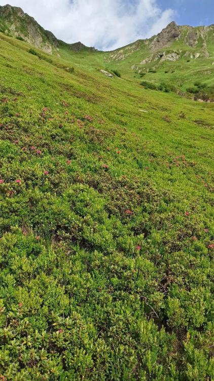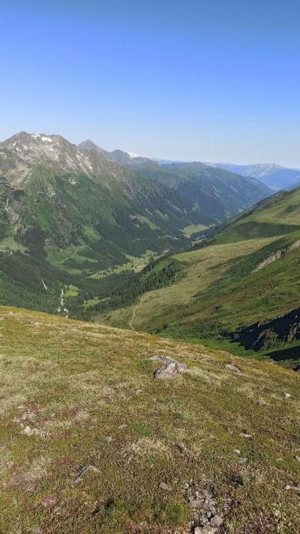 Tag 12 (26.06.) Rottenmann bis Michelirlingalm, 32 km (1.900 hm auf) Erholt und mit frischen Beinen ging es aus Rottenmann raus. An den Tag hatte ich keine allzu hohen Erwartungen, da ich die Etappe im Wesentlichen als kurze und schnelle Verbindung zwischen Nordalpenweg und Salzsteigweg geplant hatte. Die ersten 2 ½ Stunden ging es dann auch wenig ansprechend entlang von Straßen den Berg hoch und es wurde Zeit für den ersten Podcast. Entlang der Straße wurden mir mehrfach Mitfahrgelegenheiten angeboten und es wäre bestimmt kein Problem, zumindest ein Stück des Weges per Anhalter zu fahren – ich wollte ja aber von Wien bis Nizza laufen (und zwar jeden Meter). Dann entwickelte sich der Tag aber zu einem der schönsten Wandertage, an die ich mich erinnern kann und die 2 ½ Stunden an der Straße schrumpelten in meiner Erinnerung zu einer unbedeutenden Randnotiz zusammen. Zuerst führte der Wanderweg zu einem Bergsee (Riednersee), an dem ich eine erste Pause einlegte. Danach ging es weiter auf die Seekoppe mit toller Aussicht, u.a. auf den Dachstein. Am Abend zuvor hatte es geregnet und nachdem es zuvor meist ziemlich diesig war, hatte ich an diesem Tag eine wunderbare Fernsicht. Von dort ging es wunderschön am Kamm entlang auf den Hochrettelstein. Der war dann eigentlich auch schon wieder eine Pause wert, ebenfalls mit toller Aussicht. Weiter ging es am Kamm entlang und zwar zum nächsten sehr lohnenden Blick auf Plannersee und Planneralm (gestört nur durch zwei nervige Instagramer mit Drohne, die vor den letzten kleinen Schneefeldern posierten). Am Plannersee schwenkte ich dann auf den Salzsteigweg 09 ein. Da der Tag so schön war und ich auch unbedingt mal wieder zelten wollte, ging ich von der Planneralm weiter, fand im selben Tal aber keine Stelle, die meinen hohen Ansprüchen an einen Zeltplatz genügte ;-). Daher ging es über die Karlspitze übers Grat weiter auf die andere Seite, wo ich erfreulicherweise einen Senn antraf, der gerade die erste Woche mit den Kühen auf der Alm war und Besuch von der Familie hatte. Den fragte ich, ob ich auf einem flachen Stück Rasen vor der Scheune mein Zelt aufbauen könne und wurde erstmal zu einem Bier eingeladen. Mein Vorhaben, von Wien bis Nizza zu wandern, wurde mit einer Mischung aus Kopfschütteln, Unverständnis und Bewunderung zur Kenntnis genommen. Zur Stärkung bekam ich Kuchen und Brot geschenkt . Ich weiß nicht, ob man sagen kann, dass den Kühen auf der Alm langweilig ist. Aber ich hatte durchaus den Eindruck, dass sie sich über Abwechslung freuen. Jedenfalls kamen die Kühe sehr neugierig zum Zaun, als ich mein Zelt aufbaute. Der einzige Wermutstropfen an diesem Tag war leider, dass nachts schon wieder ein Gewitter über mich herzog. Nach der Erfahrung am Hochschwab war ich allerdings so beschäftigt zu hoffen, dass es nicht hagelt (was es zum Glück nicht tat), dass ich gar nicht auf die Idee kam, mich vor dem Gewitter und den Blitzen um mich herum zu fürchten. Tag 13 (27.06.) Michelirlingalm bis Erzherzog-Johann-Hütte, 28 km Wenig erholt startete ich in den nächsten Tag und fand irgendwie den ganzen Tag über keinen ordentlichen Laufrythmus. Zudem war ich von diesem Wegabschnitt auch nicht besonders angetan. Zuerst ging es durch ziemlich zugewachsene Wege, die natürlich total nass waren und mir feuchte Füße bescherten, den Berg hinunter. Dann ging es einen Forstweg und die Straße entlang Richtung Donnersbachwald. Auch den nächsten Aufstieg fand ich wenig ansprechend, muss allerdings einräumen, dass der darauffolgende Abstieg ganz nett war. Aber dann kam das eigentliche Elend: in der größten Mittagshitze ging es wieder Forstwege und dann sogar um die 6 km an der Landstraße entlang und zwar durch das ziemlich viel befahrene Sölktal. Diese Wegführung empfand ich wirklich als Unverschämtheit. Das Tal wäre ohne die Straße bestimmt schön - ich würde allerdings empfehlen, das Sölktal nur motorisiert zu durchqueren. Immerhin kam ich abends zu einer sehr netten Hütte mit leckerem Essen (Erzherzog Johann Hütte), wo ich übernachten durfte, obwohl am nächsten Tag Ruhetag war. Tag 14 (28.06.) Erzherzog-Johann-Hütte bis St. Peter am Kammersberg, 20 km Ich ging den Tag relativ entspannt an, da ich als Ziel nur St. Peter/Kbg anpeilte. Zu diesem Zeitpunkt erschien es mir zu ambitioniert, bis Murau durchzulaufen. Wer seine Etappen anders aufteilen kann oder ein stärkerer Läufer ist, dem würde ich allerdings unbedingt empfehlen, es irgendwie bis Murau zu schaffen. St. Peter/Kbg ist (abgesehen vom dortigen Supermarkt) definitiv keine Reise wert. Direkt hinter der Erzherzog-Johann-Hütte begann der Aufstieg zur Haseneckscharte. Dort legte ich bereits eine erste Pause ein und unterhielt mich ausgiebig mit einem Wanderer, der mir beim Abstieg entgegenkam. In beide Täler hatte man vom Grat eine wunderschöne Sicht. Es ging weiter durch idyllische Landschaft und endlich blühten auch die Alpenröschen . Außerdem begegnete ich mehr neugierigen Kühen. Nach dieser vielen Zeit in den Alpen meine ich, durchaus Mentalitätsunterschiede zwischen österreichischen, schweizerischen und italienischen Kühen festgestellt zu haben . Man wurde dann aber leider wieder gnadenlos entlang von Schotterwegen, asphaltierten Wegen und Straßen geschickt. Ausgerechnet an so einer blöden Straße bog ich dann auch noch irgendwo falsch ab und drehte eine Ehrenrunde. In Sankt Peter/Kbg hatte ich dann aber schon wieder großes Glück und traf auf eine sehr nette Wirtin, die mich trotz Ruhetags in ihrem Gasthof (dem einzigen in St. Peter/Kbg verbliebenen, die anderen Unterkünfte, die ich zuvor im Internet gefunden zu haben meinte, waren geschlossen) übernachten ließ – und dazu noch meine Wäsche wusch (habe mich ja kaum getraut zu fragen, aber mein Odeur sprach wohl für sich ;-)). Tag 15 (29.06.) St. Peter/Kbg bis Troghütte, 27 km Mein erstes Etappenziel von St. Peter/Kbg aus war Murau, ein wirklich nettes Städtchen, mit schönen Ca