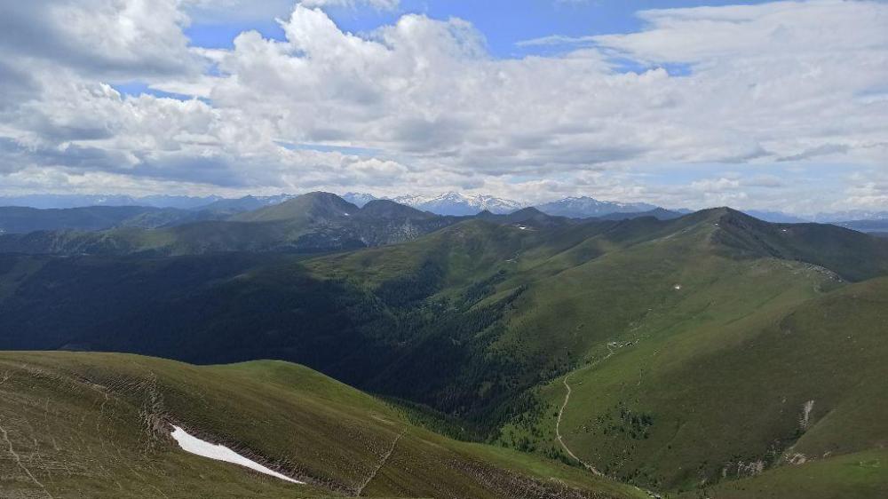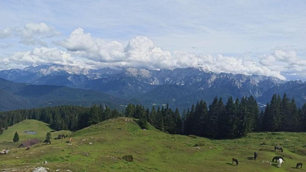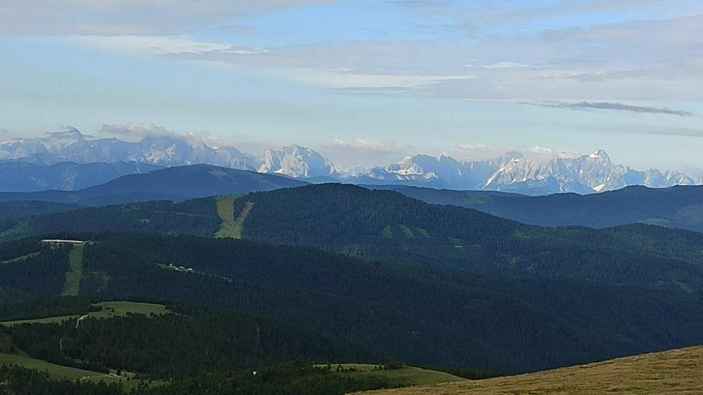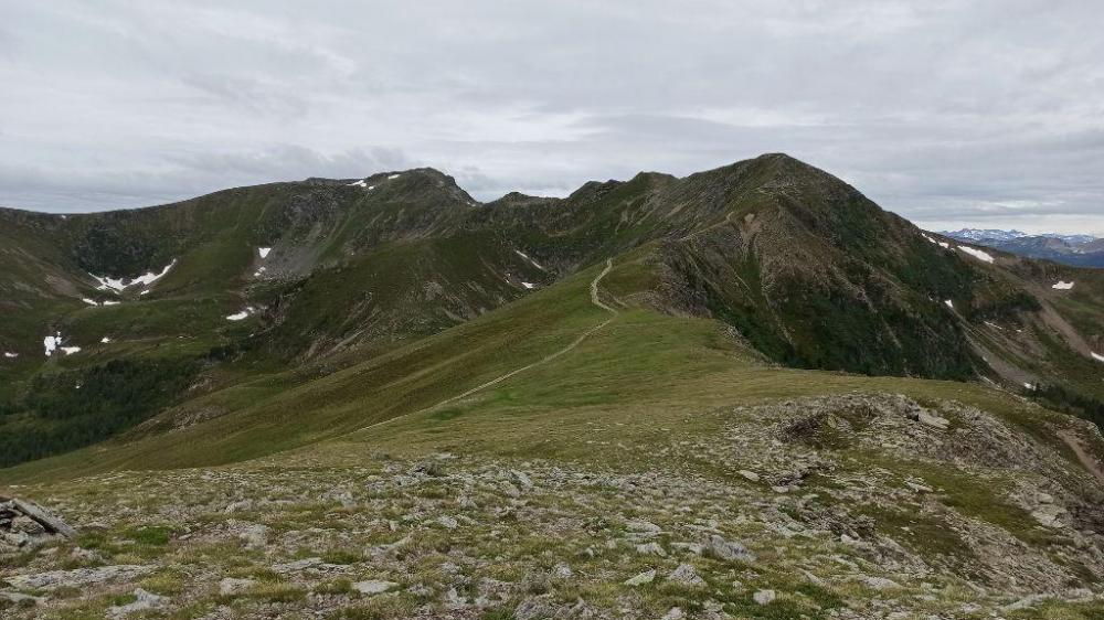 Tag 17 (01.07.) Flattnitz bis Turracher Höhe, 19 km Auch für diesen Tag war Regen angesagt, so etwa ab 14 Uhr, und ich startete wieder früh. Irgendwie fühlte ich mich leider immer noch ein bisschen schlapp. Der Weg führte erst sehr einfach durch den Wald und dann über ein paar Hügel. Dort hatte ich auf einmal, womit ich überhaupt nicht gerechnet hatte, eine ganz unglaubliche Fernsicht auf die Karawanken, die plötzlich vor mir standen. Dann passierte ich eine Schafherde, die sich formierte und geschlossen auf mich zukam - mir war zunächst nicht klar, ob in friedlicher Absicht oder um mich von der Weide zu schubsen. Zum Glück waren die Schafe aber sehr freundlich und wollten nur ein bisschen an mir schnuppern (und manche auch knabbern). Da ich wohl nicht ihren Geschmack traf zogen sie bald wieder von dannen. Das Wetter zog allmählich zu, leider schon bevor ich an der Lattersteighöhe den Kammweg erreichte. In der dortigen Schutzhütte machte ich windgeschützt noch ein kurzes Päuschen und hoffte, von dem angekündigten Regen noch ein Weilchen verschont zu bleiben. Der setzte dann aber bedauerlicherweise schon deutlich früher ein als vorhergesagt und es wurde zum ersten Mal Zeit, meine Regenjacke anzuziehen. Windig und neblig wurde es auch noch. Ich trottete im Tran weiter und dann passierte mir etwas echt Blödes: ich stieg von der Gruft in die falsche Richtung ab. Nach ungefähr 400 hm fiel mir mein Missgeschick auf. Der eine oder andere kennt vielleicht das Gefühl, wenn man nach längerer Zeit mal wieder auf GPS/Handy schaut und feststellt, dass der eigene Standort ganz wo anders ist, als die geplante Route . Aber ich hatte nochmal Glück im Unglück. Da ich mich mitten in einem Wandergebiet mit total vielen Wegen befand, führte zum Glück ein Schotterweg mehr oder weniger auf meiner Höhe um den Berg herum zur Turracher Höhe, so dass ich nur mit 20 bis 30 min extra Fußmarsch bezahlen und nicht wieder alles aufsteigen musste. Dies verstand ich als ultimatives Zeichen, dass ich auch an diesem Tag keine neuen Streckenrekorde aufstellen sollte, sondern mietete mich auf der Turracher Höhe in einem sehr netten Hotel (Nockalm) ein und sattelte auf Wellness-Urlaub um. Nach zwei Saunagängen fühlte ich mich wie neugeboren. Tag 18 (02.07.) Turracher Höhe bis Wiedweg, 26 km Da auf der Nockalm gut gekocht wird, wollte ich mir das Frühstücksbuffet auf keinen Fall entgehen lassen – das allerdings erst um 8:00 Uhr losging und so legte ich den spätesten Wanderstart aller Zeiten hin. Bei gutem Wetter ging es durch die Nockberge, durch wunderschöne Hänge mit Alpenröschen und auch mal ein kurzes Stück an der Straße entlang (war aber noch okay). Nach einiger Zeit begegnete ich der ersten unfreundlichen Kuh, die, kaum dass ich einen Fuß auf ihre Weide gesetzt hatte, aufstand und mir schnaubend entgegen kam. Da mir das Ganze nicht nach einem freundlichen Empfang aussah, wollte ich die Kühe in einem Bogen umgehen. Leider durchschaute die Herde (darunter auch ein einjähriger Stier) meine Absicht und wollte mir den Weg abschneiden. Ich machte daher einen noch größeren Bogen und stieg durch Büsche und Steine etwas weiter nach oben auf - und entweder betrachteten die Kühe diesen Teil nicht mehr als ihr Territorium oder sie waren zu faul mir zu folgen, jedenfalls kam ich so unbeschadet weiter. Ich machte mich auf die Suche nach meinem Weg und folgte dem langgezogenen Aufstieg auf den Falkert, von dem aus man eine tolle Sicht auf die Nockberge hatte. Der Weg nach oben war zwar ganz nett, aber auch ein bisschen langweilig. Nockberge: Blick Richtung Großglockner oder Ankogel(?): Vom Falkert ging es weiter auf den Rödresnock, dann folgte ein strammer Abstieg Richtung Wiedweg, mehr oder weniger geradeaus den Berg runter. Im Wald wurde der Abstieg irgendwann ziemlich ätzend, da der Weg von schweren Waldarbeitermaschinen vollkommen zerstört war. Blick zurück zum Falkert: Als ich in Wiedweg ankam war es aufgrund meines späten Starts schon fast 18 Uhr. Eigentlich hätte ich an dem Tag gerne mal wieder gezeltet, aber dafür hätte ich noch einen ziemlich ordentlichen Aufstieg hinter mich bringen müssen, weshalb ich mich notgedrungen im einzigen Gasthaus vor Ort einquartieren wollte. Dort klappte mir fast die Kinnlade herunter: das Gasthaus war allen Ernstes ausgebucht! Ich war sonst meist der einzige Gast und musste gelegentlich erst den Rost aus den Rohren laufen lassen, weil schon so lange keiner da gewesen war. Ich hatte den Eindruck, dass auch die Wirtin nicht so recht wusste, wie ihr geschah. Aber die Österreicher sind einfach ein nettes Völkchen. Auf meine Frage, ob es irgendwo einen Bauern gibt, den ich fragen kann, ob ich bei ihm auf der Wiese mein Zelt aufstellen darf, schlug mir die Wirtin vor, einfach bei ihr im Garten zu zelten . Tag 19 (03.07.) Wiedweg bis Steinwender Hütte, 34 km Da ich gerne aus dem Garten verschwunden sein wollte, bevor die anderen Gäste aufstehen, ging es früh los und nach gut drei Stunden Aufstieg stand ich zunächst auf der Kaiserburg und dann auf dem Wöllaner Nock. Die Karawanken waren nun schon deutlich näher, allerdings war die Sicht nicht mehr ganz so gut. Großglockner? Ankogel? Über zielführende Hinweise wäre ich dankbar. Jedenfalls aber eine schöne Aussicht: Vom Wöllaner Nock stieg ich zügig nach Arriach ab. Dort kam ich gerade noch rechtzeitig an, bevor der Supermarkt zur Mittagszeit schloss – immer eine hervorragende Motivation für mich. Ich legte eine längere Pause ein und vertilgte mein frisch erstandenes Essen. Rund 24 km hatte ich schon auf dem Tacho, um den Tag schon zu beenden war es aber etwas früh. Ich lief daher drauf los, ohne genau zu wissen, wo ich einen Zeltplatz und Wasser finden würde, aber der Tag war ja noch lang. Der weitere Weg hinter Arriach war dann aber leider alles andere als ein Vergnügen. Zuerst ging es eine Stunde auf Asphalt und dann eine Stunde auf Schotterwegen den Berg hoch. Es gab zwar