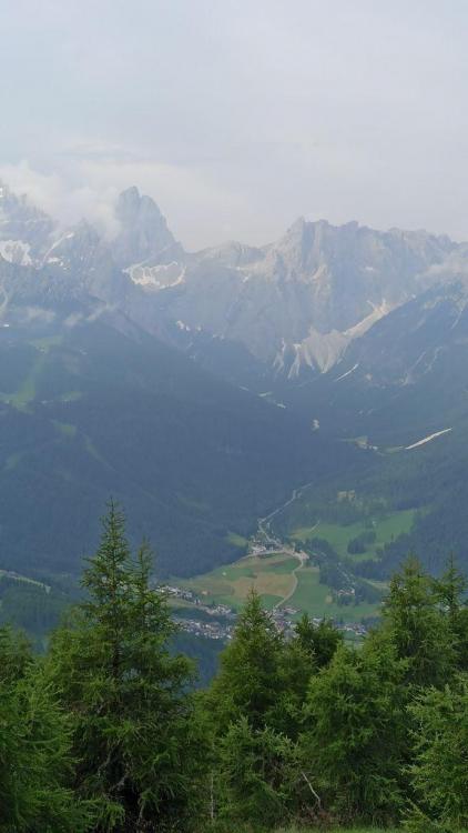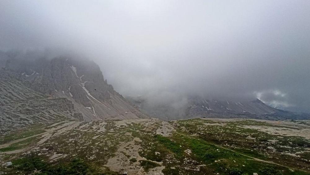 Tag 27 (11.07.) Sillianer Hütte bis Rifugio Fonda Savio, 29 km Auf der Sillianer Hütte gab es ein tolles Frühstücksbuffet, das (wenn ich mich recht erinnere) schon um 5:30 Uhr startete. Es gab wunderbares, selbst gebackenes Brot, dem ich auf dem weiteren Weg in Italien noch oft hinterher trauern sollte. Frisch gestärkt stieg ich zügig ins Tal nach Sexten ab und war damit schon am Ende des Karnischen Höhenwegs angekommen (eigentlich steigt man auf die österreichische Seite nach Sillian ab). Zu diesem Zeitpunkt gab es zumindest noch ein bisschen Sicht: Leider kam ich schon wieder an einem Sonntag in einen Ort, so dass Supermarkt und Bäcker geschlossen waren. Da es bis Cortina d'Ampezzo aber nicht weit war und ich davon ausging, dass man in den Dolomiten nicht verhungert, beschloss ich, ohne frischen Proviant weiterzugehen. Auf in die Dolomiten! Von Sexten aus machte ich mich auf den Weg in Richtung der Drei Zinnen, erst durchs Tal, dann den Berg hoch. Unterwegs wurde das Wetter immer schlechter, es fing an zu regnen, die Wolken hingen immer tiefer, der Nebel stieg immer höher aus dem Tal auf. Als ich am Fuß der Drei Zinnen ankam regnete es zwar nicht mehr, ich hatte aber mit Abstand die schlechteste Sicht, die ich auf der bisherigen Wanderung gehabt hatte. Von den Drei Zinnen sah ich nämlich ganz genau gar nichts. Ich blieb etwa eine halbe Stunde vor der Drei-Zinnen-Hütte, die auf Massenbetrieb ausgelegt und wenig einladend war, sitzen. Mehr als das bekam ich von der Nordseite der Drei Zinnen nicht zu sehen: Über einen breiten Spazierweg, auf dem Volkswandertag herrschte, lief ich an den Drei Zinnen und dann erst an einer (Lavaredo) und dann der nächsten Hütte (Auronzo) vorbei. Dort wurde mir auch klar, warum an den Drei Zinnen so ein Betrieb herrscht: bis zur Auronzohütte kann man mit dem Auto fahren und dann fast ohne Höhendifferenz zu den Drei Zinnen spazieren. Eigentlich hatte ich bei der Auronzohütte bleiben wollen, aber der Trubel dort war mir zu viel. Ich fühlte mich irgendwie deplatziert und ausserdem war es erst 14 Uhr, so dass ich entschied weiterlaufen. Es ging auf den Bonacossa-Weg, der eher anspruchsvoll sein sollte (ausgesetzt, mit vielen seilversicherten Stellen). Daher hatte ich eigentlich geplant, den Weg erst am nächsten Morgen mit ausgeruhten Beinen zu gehen. Mit angemessenem Respekt (man könnte auch sagen, mit vollen Hosen) wanderte ich weiter. Kaum war ich von der Auronzohütte in Richtung Bonacossa-Weg und Fonda-Savio-Hütte abgebogen, herrschte wieder Ruhe und ich hatte die Berge fast für mich alleine. Der Weg schlängelte sich an den Felsen entlang bzw. war teilweise in den Fels gehauen und hatte es tatsächlich auch in sich. Bei Nässe würde ich den Weg unter keinen Umständen gehen (jedenfalls nicht ohne Klettersteigset). Über zahlreiche seilversicherte Stellen und Leitern ging es in eine Rinne. Mir wurde immer schleierhafter, wo die Fonda-Savio-Hütte sein sollte, die laut Karte nicht mehr weit war. Irgendwann traf ich auf drei Belgier, die mir einen Tipp gaben (oben, an dem rechten Felsen sieht man eine Fahne wehen...). Es ging nochmal durch ein Schneefeld und dann durch seilversicherte Stellen ordentlich den Fels hinauf. Irgendwann kam ich tatsächlich an. Das war – jedenfalls von dieser Seite – der abgefahrenste Hüttenzustieg, den ich je hatte. Auf der sehr netten, kleinen Hütte, stellte mich die durchaus sympathische, aber äußerst resolute Hüttenwirtin erstmal in den Senkel, weil ich nicht reserviert hatte (ich hatte auch tatsächlich gelesen, dass die Hütte häufig sehr voll ist, aber an diesem Abend hatte ich das Lager für mich). Das war übrigens das Lager: Von dem Bonacossa-Weg war ich ziemlich geflasht. Der Weg hatte für mich von der Schwierigkeit her genau das richtige Maß, ich war durchaus gefordert, aber nicht überfordert (so was ist ja aber höchst individuell). Als ich auf der Hütte ankam, war ich voller Adrenalin und Endorphine. Die fehlende Sicht auf die Drei Zinnen war vollkommen vergessen. Zudem zog das Wetter wieder auf und ich konnte mit einer netten Truppe aus Österreich noch vor der Hütte in der Sonne sitzen und die Aussicht genießen. Dort bekam ich die Drei Zinnen dann immerhin noch von der Südseite zu sehen. Tag 28 (12.07.) Rifugio Fonda Savio bis Cortina d'Ampezzo, 18 km Tag 28 sollte mal wieder ein kurzer Tag werden, an dem ich nur bis Cortina d'Ampezzo laufen wollte. Zwar hatte ich mich am Tag zuvor vor lauter Euphorie total gut gefühlt, aber eine echte Erholung hatte der Tag nicht gebracht, da am Ende doch fast 30 km zusammen gekommen waren. Morgens ging es am Lago Misurina vorbei. Dann folgte ein kurzer, zum Glück nicht allzu anstrengender Aufstieg und dann der lange Abstieg nach Cortina d'Ampezzo mit Blick auf die Tofanes. Punkt 12 lief ich in Cortina d'Ampezzo ein und schaffte es, noch vor Beginn der Siesta um 13 Uhr (da macht wirklich alles dicht) neue Meindl-Einlegesohlen für meine La Sportiva-Schuhe und neue Leki-Spitzen für meine Black Diamond-Stöcke zu kaufen, da das Material in der Zwischenzeit doch etwas gelitten hatte. Dann suchte ich mir ein Hotel. Für den Mittag stand noch essen, schlafen, neuen Proviant kaufen und Wäsche waschen auf dem Programm. Irgendwie war ich nach den letzten Wochen aber doch etwas müde und hatte das Gefühl, dass ich mehr Erholung brauchte. Damit war die Zeit für den ersten Pausentag gekommen. Dass die Wettervorhersage für den nächsten Tag nicht besonders toll war, erleichterte die Entscheidung. Mit Cortina d'Ampezzo hatte ich mir zwar nicht gerade den günstigsten Ort für eine Pause ausgesucht, aber meine Beine haben eben einen exklusiven Geschmack. Tag 29 (13.07.) Pausentag -