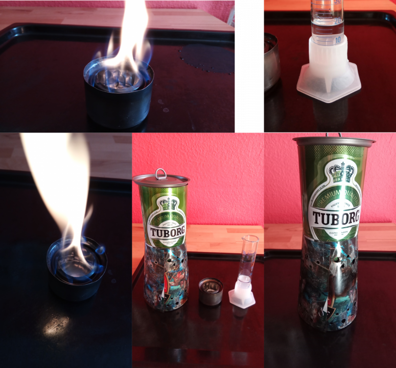 Hm d.h. entweder eine größere Fläche erhitzen (was mit dieser Art Setup schwierig wird), oder einen kleineren Kocher nehmen. Also den CHS eher für größere Töpfe oder Pfannen. Fand das System nur so cool, deshalb hatte ich das mal probiert. Hatte irgendwie gehofft, dass der gebogene Dosenboden (der ja die Fläche der Wärmeübertragung stark erhöht) einen positiven Einfluss hat. Soweit man das hört kocht der Spiritus bei dieser Konfiguration schon... gespritzt hat es allerdings nicht merklich. Danke für die Tipps! Ich werde dann berichten wenn ich wieder Zeit zum basteln hatte -