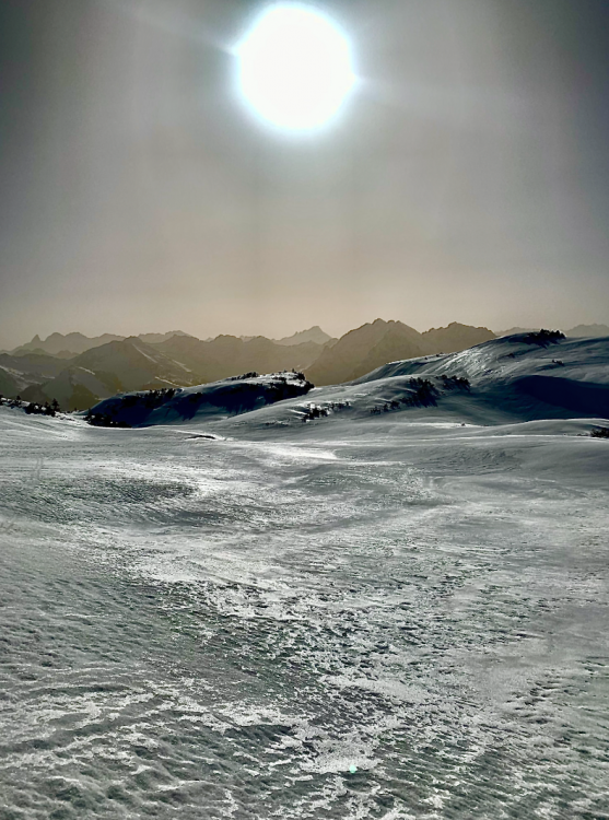 Wider Erwarten ging es doch nochmal in die geliebten Berge zum Krafttanken, zwischen Arlberg und Montafon, mit den Skiern. So schön, nur gut: Das Gelbe ist übrigens Saharastaub. Wieviele Tausende von Tonnen müssen das gewesen sein?