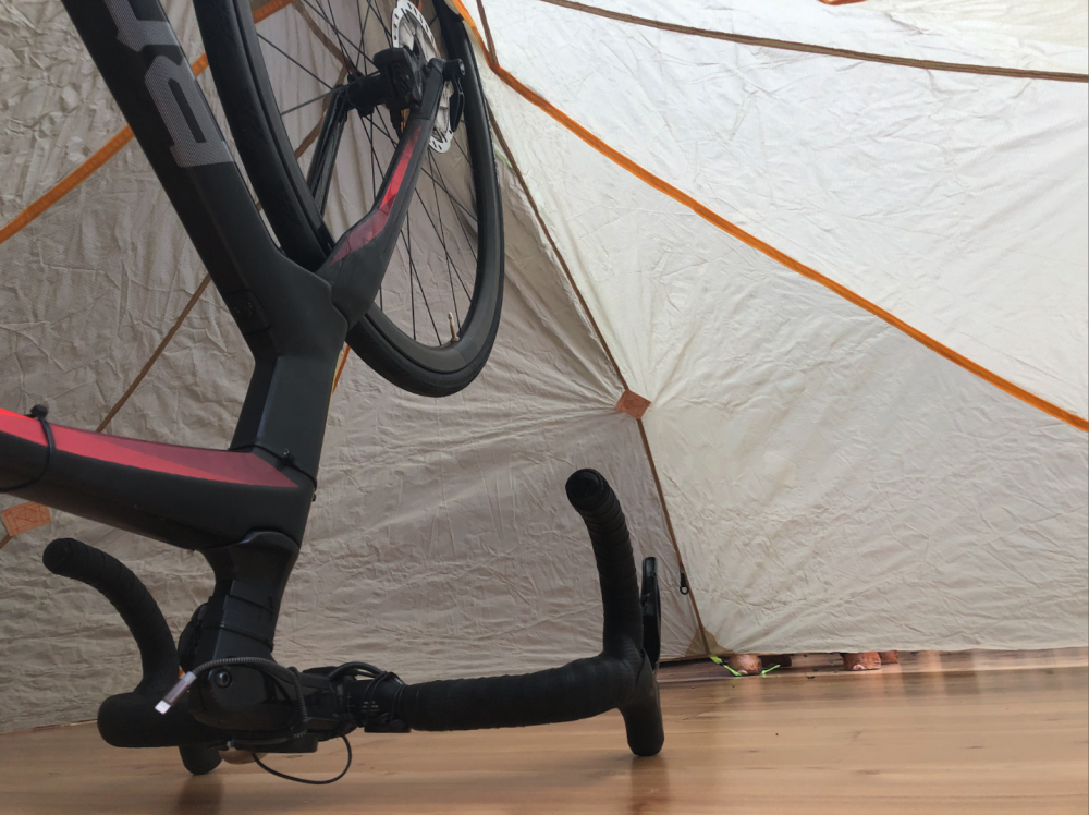 Nach den vielen Vorübergegangen und hilfreichen Inputs möchte ich euch noch kurz Rückmelden, wie sich meine Lösung entwickelt habe: Ich habe für 56€ das bestellt: https://de.aliexpress.com/item/32913182175.html?spm=a2g0s.9042311.0.0.29d64c4dTZHVxs ... und wollte schaun, ob man etwas für das Rad als Ersatztreckingstock basteln kann, bzw. hätte den Stoff im worst case zum Umnähen genutzt. Aber ich hab Glück gehabt: Dem Vorderrad fehlen zwar 15 cm an Höhe aber es ist ausreichend viel Kopfhöhe vorhanden (insbesondere dann, wenn man richtig abspannen kann) und auch Platz für die Isomatte. Ggf. kommt noch der Helm oder Steine unter den Lenker. Ich nähe nur noch als "Zeltboden" ein Moskitonetz rein und fertig is es. Inwieweit die Reifenkontaktfläche an der Zeltbahn durchnässt (da, wo das Entlüftungsdacherl drauf ist) wird sich zeigen. Wenn ich das Hinterrad unters Zelt nehme, hätte ich sogar noch mehr Liegefläche, müsste halt beim Aufbau höllisch aufpassen nicht mit dem dünnen Stoff ans Kettenblatt zu kommen. Nochmals danke für euren Input, aber erstmal versuch ich es so, ohne MYOG. -