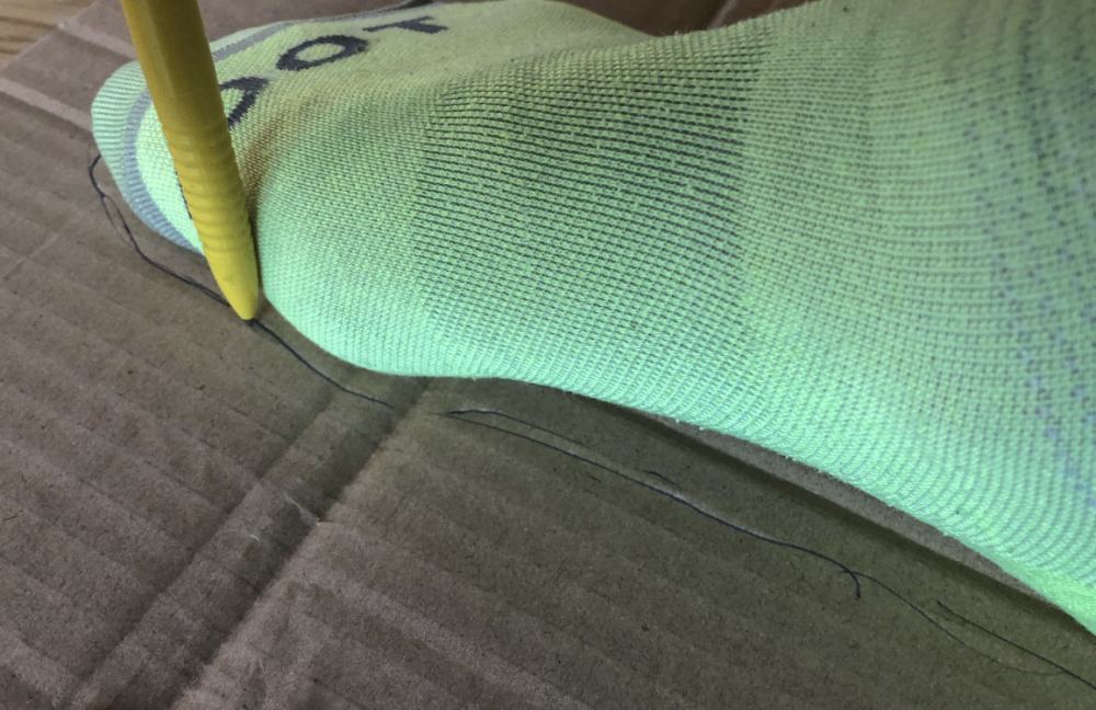 Wasserdichte Übersocken 23gr Jahrelang habe ich Gefrierbeutel zwischen Socken und Schuhen (Rad, Trailrun) getragen, wenn es naß wurde. Ein regendichter Socken ist aber ganz leicht zu nähen. Verwendet wurde Regenstoff von Funfabrik mit 60 gr/m2. Vorbereitend schneidet man eine Sohle aus Karton oder nimmt eine Einlegesohle aus einem Schuh. Am leichtesten hält der Übersocken am Fuß, wenn man ihn bis über die Wade gehen lässt und mit einem leichten Gummizug fixiert. Das gibt das Maß Ferse-oberer Abschluß Da das Material unelastisch ist und damit man trotzdem den Socken gut anziehen kann, wird es auf den "halben Wadenumfang + Nahtzugabe" zugeschnitten. Der Faltenwurf lässt sich bei dem dünnen Material verkraften und führt zu keinen Druckstellen. Die Sohle wird unter 45 Grad von Ferse bis zur Zehenspitze mittig aufgelegt und die Kontur auf den Stoff übertragen. Damit liegt die Lage für die Naht fest. Am leichtesten lässt sich die Naht von der Zehenspitze zur Wade mit der Overlock nähen. Natürlich geht es auch mit Geradestich und versäumen. Oben wird der Übersocken mit einem Saum für das Gummiband abgeschlossen. Die zwei Socken wiegen 23 Gramm und könne sich auch als Packsäcke verwenden lassen.