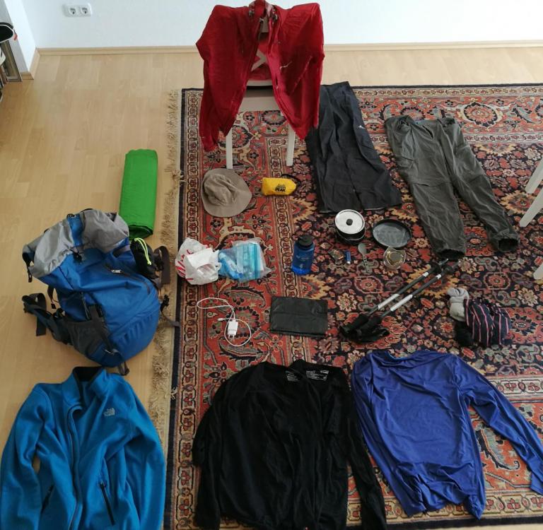 13. Hallo und danke für eure Anregungen! Ich habe mir jetzt das Buch The HRP high-level trail von Tom Martens bestellt. Damit sollte ich ohne weitere Karten / GPS klarkommen. Das Smartphone nehme ich mit Karten trotzdem für Notfälle mit, allerdings ohne Powerbank oder Solarpanel. Könnt ihr mir noch eine Einschätzung über meine Ausrüstung geben? Meine Packliste: Zelt und Schlafsack sind schon verstaut im Rucksack Auf dem Bild fehlen noch: - Wanderführer The HRP high-level trail von Tom Martens - Trillerpfeife - Trangia Griffzange für die Pfanne - 2. Feuerzeug - Ethanol - Smartphone Ich bin 1,83 groß und wiege 76 kg.