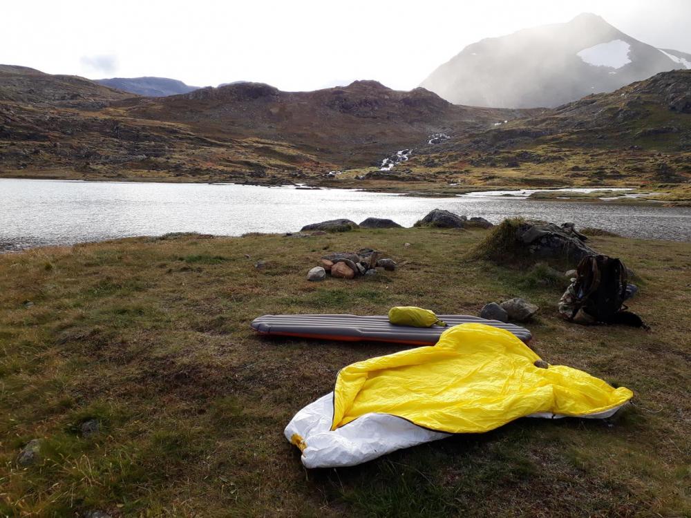 Hallo Leute, ich möchte euch einen MYOG-Prototypen vorstellen. Ich habe das Ding Space-Quilt getauft und mittlerweile relativ umfangreich getestet. Nach einem Bivy-Projekt ist es mein zweites MYOG-Ergebnis. Kleine Vorgeschichte: auf einer Tour auf dem GR11, noch vor meiner Ultralight-Infektion, hatte ich einen nicht ganz ausreichenden Daunenschlafsack dabei und darüber hinaus, als Notfallausrüstung, eine klassische Mylar-Silber-Gold-Folie. Des Nachts frierend versuchte ich mir mit der Rettungsdecke über dem Schlafsack zu behelfen. Aha, das wärmt ja doch ganz gut, dachte ich. Des morgens: Aha, mein Schlafsack ist durch die zwangsläufige Kondensbildung unter der Folie ziemlich klamm bis nass geworden. Nicht nochmal! Ein paar Jahre später habe ich nochmal über die Kombination aus Schlafsack/Quilt und Rettungsfolie nachgedacht und überlegt ob beides nicht doch kombinierbar ist. Die Qualitäten von hauchdünnen Metallic-Folien sind ja spätestens seit der Thermarest X-lite bekannt. Das vorläufige Ergebnis: der Space-Quilt. Das Prinzip ist denkbar einfach. Der normale Quilt besteht aus Außenstoff, Isolation und Innenstoff. Beim Space-Quilt legt sich zwischen Außenstoff und Isolation noch eine weitere Schicht, die besagte Goldfolie (2Euro Rettungsdecke). Um die Dampfdichtheit zu unterbinden ist diese allerdings perforiert. Die Isolation bleibt so (recht gut) erhalten, gleichzeitig bleibt der Quilt (recht gut) atmungsaktiv. Der von mir konzipierte Quilt sollte noch ein weiteres Material und seine Eigenschaften nutzbar machen: das weithin bekannte Tyvek softstructure. Das Tyvek als Außenmaterial (mit dem ich im Bivy-Bereich gute Erfahrungen gemacht hatte) sollte dem Quilt noch ein paar Bivy-Fähigkeiten spendieren: absolute Winddichtigkeit und sehr gute Spritzwasser bzw. feuchte Zelt/Tarpwand-Festigkeit. (Man muss dazu sagen dass ich eine Art Tyvek-Fetish entwickelt habe ich finde das Material einfach genial...) Also die Materialien in dieser Reihenfolge beginnend außen: Tyvek, perforierte Goldfolie, 100gr Apex, 20d Ripstop-Nylon (plus Reißverschluss, Bungeecord, Elastikband, Camsnaps). Ich hatte mir erhofft mit diesem Prinzip eine deutliche Isloations-Steigerung zu erreichen (5 bis 8Grad, oder anders gesagt: mit einer 100er Apexfüllung die Werte einer 167er zu erreichen) und das bei minimalem Gewichtszuwachs gegenüber einem Standard-Quilt. Das Ergebnis: es scheint recht gut zu funktionieren. Der erste Test fand in der Eifel statt. Abends in den Quilt gestiegen und sofort ein wohliges Wärmegefühl gespürt (mehr als gewohnt). Nachts runter auf 7 Grad und ziemlich hohe Luftfeuchtigkeit. Geschlafen in T-Shirt und Daunen-Schühchen (bei allem unter 15 Grad brauche ich Schlafschuhe – kalte Füße-Syndrom). Ich muss dazu sagen: ich bin das was man „cold sleeper“ nennt. Auf angegebene Komforttemperaturen muss ich konsequent 5 Grad drauf rechnen. Angenommen eine 100er Apex Füllung ist Komfort 8-10 Grad (vergleiche As Tucas, Gramxpert), so bedeutet ein 100er Apex für mich vielleicht 12-15 Grad Komforttemperatur. In diesem Sinne ging der Space-Quilt für mich auf, die Goldfolie hat sicher 5 Grad rausgeholt. Zweiter Test: 14 Tage Jotunheimen Norwegen im September, Nachttemperaturen zwischen 5 und -2 Grad. Hier habe ich den Space-Quilt allerdings als Overquilt mit einem um 60 Gramm Daune aufgemotzen Windhard-Quilt verwendet. Diese Kombi hat sich voll bewährt, warm, und der Daunenquilt immer schön trocken. Der bewusst weite Schnitt des Overquilts tat hier gute Dienste. Fazit: das Konzept ist zumindest eine Überlegung wert. Im Grundsatz lässt sich die Isolationsleistung eines Quilts damit deutlich steigern. Ich bin aber noch vorsichtig. Die Testphase ist noch nicht abgeschlossen. Es ist schon ziemlich nerdy, und eine vermeintlich geniale Idee stellt sich am Ende gerne mal doch als suboptimal heraus. Ich halte das Konzept nicht unbedingt für mehrheitsfähig. Man muss z.B. akzeptieren dass ein Space-Quilt ziemlich knistert aufgrund der Metallicfolie, was ich persönlich eher interessant als nervig empfinde. Rascheln von unten (x-lite) geht jetzt auch von oben;) - eine zweite Person im Zelt könnte sich daran stören. Das zentrale Parameter an dem man experimentieren muss ist die Perforation der Folie. Wo hier das richtige Maß an „Lochung“ liegt habe ich noch nicht endgültig feststellen können. Zu viel Luftdurchlass mindert die Isolation, zu wenig sorgt für Kondensation die es auf jeden Fall zu vermeiden gilt. Möglicherweise baue ich nochmal einen zweiten Prototyp mit ein paar Änderungen. Ihr könnt die Idee ja mal auf euch wirken lassen und ein bisschen „thinking outside the box“ betreiben. Beste Grüße. L