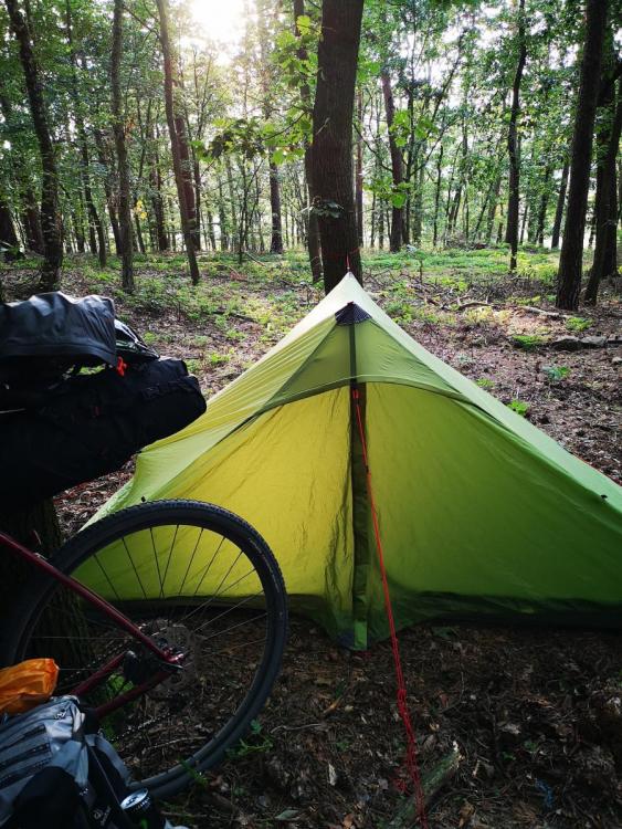 Ich konnte mein Lanshan 2 Pro jetzt auch mal länger testen. Bin eigentlich sehr zufrieden. Wenn die Sache mit dem Kondens nicht wäre... Bei Temperaturen unter 10°C in der Nacht, hatte ich übelst Wasser. Wenn man morgens bei Zeiten los will, ist das nervig. Dauert ewig, bis das Wasser rausgeschüttelt und halbwegs trocken ist. Ok, der Übernachtungsplatz relativ dicht am Wasser war eher suboptimal. Aber man lernt ja aus seinen Fehlern. Austauschen bzw schon ausgetauscht habe ich die original mitgelieferten Heringe. Die sehen 1x nen harten Boden und sind krumm... Bewährt haben sich meine MYOG-Carbonstangen für das Rad. Verpackt wird das Zelt in nem 4l drybag von Vaude. So gestopft und komprimiert, passt es wunderbar in die Frontasche vom Rädle. Aufbau unter 5min machbar.