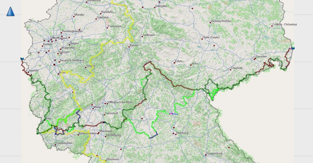 Während @Soulboy seine erste Woche auf dem NordSüdTrail hinter sich hat, war ich nochmal "Schreibtischwandern". Ich präsentiere: Meinen WestOstTrail! ... WestOstTrail Südvariante .... WestOstTrail Südvarianten... ja, ich arbeite an nördlicheren Alternativen ... Wieder: Grün sind zertifizierte Wege, rot nicht zertifizierte. Alternativen diesmal in hellgrün, wenn zertifiziert und blau, wenn nicht. Weglos in pink. Neu in gelb: der NordSüdTrail zur Referenz. Interessant finde ich unsere unterschiedliches Routing ab der Saarschleife. Soulboy läuft da viel unmarkiert - ich frage mich, was er gegen den Veldenz Wanderweg / Remigiuswanderweg / Pfälzer Höhenweg hat Danke fürs Raussuchen; das hat mir den Startschub gegeben, die Punkte zu haben! Mein erster Gedanke zum westlichen Punkt war "ui, so weit im Norden" und der zweite "Ah, grob bei Aachen, da beginnt doch der Eifelsteig" ... beim östlichen dachte ich "na an der Gegend hast du ja schonmal vorbei geplant" Ich musste mal wieder feststellen, wie gut ausgeschildert DE doch mit Wanderwegen ist, die einzigen unmarkierten Strecken sind zu den beiden Termini und durch Bamberg auf der Südlichen der Südvarianten!