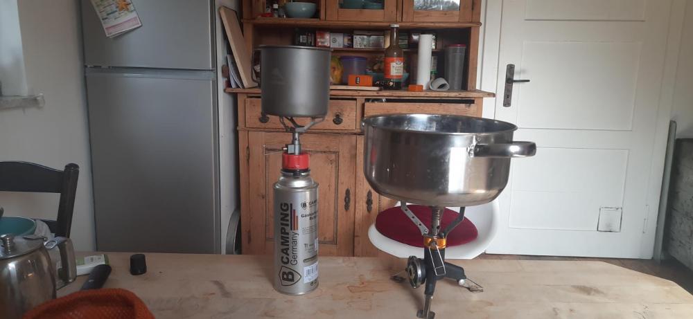 du brauchst jetzt aber keinen Topf Kocher für 3 Jahre zu kaufen. Ich würde mich an deiner Stelle mal an deinen Ausgangspost erinnern, du suchst einen sehr leichten Kocher zum Heisswassermachen für Trekkingmalzeiten und einen entsprechenden Topf. Du machst keine Fehler wenn du so leicht und kompakt wie moeglich anfaengst Andersherum macht es weniger Sinn. Und du wirst dich eher später ärgern nicht doch das leichteste genommen zu haben. Denn das ist unterwegs schwer zu bekommen, oft halt nur online zu bestellen. Titan eignet sich eh nicht so gut fuers richtige Kochen. es brennt seht leicht an. Also wenn es dazu kommt , dass du iel und richtig kochen willst, wirst du dir temporär eh ein anderes Setup besorgen muessen, z.b. fuers Autocamping in Australien holt man sich halt fuer 30 Dollar (oder uebernimmt das Zeug von einem anderen Travellrr) dann einen richtigen Gasherd im Baumarkt oder einen pocketrocket im Campinggeschäftt und einen anstaendigen Kochtopf und ne Pfanne etc fuers Wasserkochen und Ul Trekking aber ist Titan top Für alle Situationen wirst du eh nix finden. Ein Kompromiss ist nie optimal, das kleinste beste Setup aber wird dich am ehesten die ganze Weltreise begleiten und dich dabei am wenigsten stoeren, wenn du es gar nicht benutzt Groesser und stabiler findest du leichter unterwegs als ultraleicht. Pocketrocket aehnliche kocher habe ich z.b. in Australien bekommen, ultraleicht dagegen ist noch gar nicht ueberall auf der Welt angekommen. Teilweisenich nicht mal normales Camping, Trekking. daher waere mein empfohlenes Setup -toaks light titan 650 ml -fire maple 45 g oder 25g brs -foldable Titanspork -mini bic -100 ml Schraubkartusche a la primus -der verlinkten Butangasadapter, denn den brauchst du spaetestens in Asien und ueberall wo sonst noch Schraubkartuschen Mangelware sind Ägypten war ueberigens ein Desaster, was Gaskartuschen betrifft. die einzige Moeglichkeit war da online ueber souq (amazon ableger) trotzdem finde ich Gas einfach am simpelsten und sichersten Erfordert aber auf Weltreisen immer wieder etwas Suche bzw. Vorausplanung hier mal mein "Autocamping"setup, zusammengekauft in Australien aber immer noch transportabel, reisetauglich, dient mir jetzt gut, wenn ich an einem Ort länger campe, wohne. und daneben mein UL setup (eigentlich ja mit 100 ml Schraubkartusche) mit den ensprechenden Butangasadaptern. beim australischen Setup ist der Adapter gleichzeitig ein prima Standfuß und ermoeglicht richtiges Kochen. Eine einzige normale Camping Schraubkartusche kostete 12 AUD und 4 (oder gar 6 Butangaskartuschen kosteten 10 AUD) Im überigen macht es Spass sich manchmal local was suchen zu muessen, das kann ein Abenteuer für sich sein... Wilde Tuktukfahrten durch Kairo auf der Suche nach Camping gas oder mit dem Motorrad durch Pnom Penh wegen eines verdammten Gaskochers da findet man auch sehr interessante Lösungen. Alternativen oder auch gar nichts. Mit o.g. Setup hat man aber was, was in den meisten Ländern funktioniert -