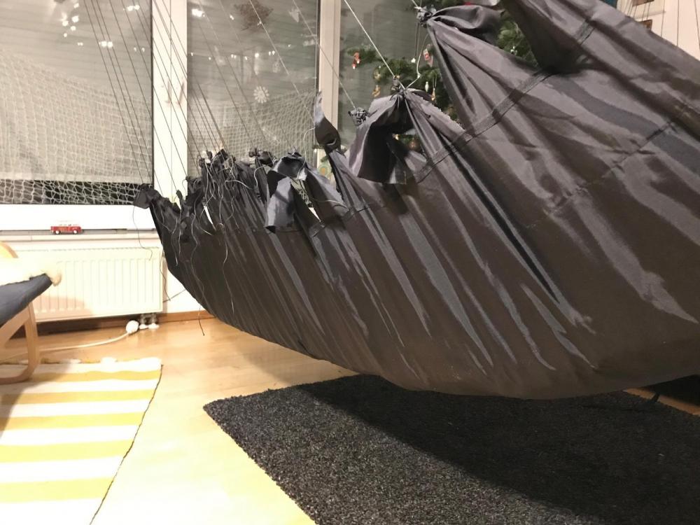 Laut Küchenwaage sind es aktuell ca 420gr. Dabei ist folgendes enthalten: Die Matte aus dem Hammock Nylon von ExTex (volle Stoffbreite) 2 Karabiner die ich noch hatte 2x Ripsband die Kordeln aus 1mm Kanirope Ridgeline aus 3mm Dyneema Da kann man bestimmt noch einiges sparen durch die Karabiner und wenn der "Struwelpeter" zum Friseur geht Andererseits wird aber noch Gewicht für das Kopf- und Fußende hinzukommen. Genau. Ich habe erst das Ripsband aufgenäht und dann die "Zacken", die eigentlich nur Rechtecke sind, bis zum Ripsband geschnitten. Ein Heißschneider habe ich leider nicht, dazu musste mein alter Lötkolben ran. Das funktioniert zwar, gewinnt aber kein Schönheitspreis. Breitere Spitzen oder andere Formen an einer Lötpistole sollen da wohl "ordentlichere" Ergebnisse lieferen. Ich frage mich gerade ob die 30° der Aufhängung, wie man es bei GE Hängematten versucht, hier auch notwendig sind? Da die Leinen relativ lang sind, müsste ich die Matte immer ziemlich hoch aufhängen, wenn ich die 30° erreichen will. Eigentlich steigt bei einem flacheren Winkel doch "nur" die Belastung auf die Ridgeline?