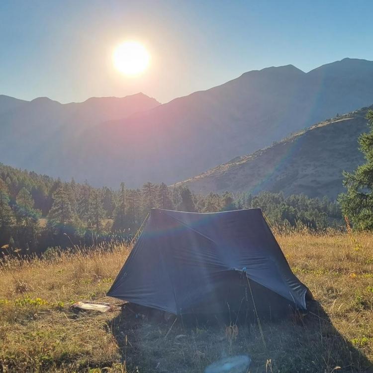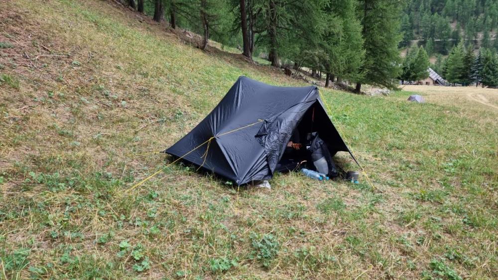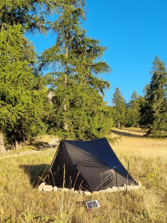Bevor ich es weiter vor mir herschiebe, wollte ich jetzt endlich mal mein selbstgenähtes Zwei-Personen-Zelt vorstellen. Es wurde von mir und meiner Freundin für 16 Tage auf dem GR5 in Frankreich genutzt, und hat sowohl Sonne wie auch Sturm und Gewitter im Hochgebirge (2300hm+) am See (also offene Fläche) überlebt. Vorab: Ich habe vorher nie ein Duplex anschauen können, alles wurde also anhand meiner Beobachtungen aus dem Internet übernommen. Es gibt einiges an Verbesserungsbedarf, mir sind leider einige Fehler bei der Fertigung unterlaufen, da dass Zelt von 0-fertig in 4 Tagen entstanden ist, inklusive Design entwickeln, Zuschnitt, nähen und kleben etc. Auf die Dinge mit Verbesserungspotential gehe ich am Ende noch einmal separat ein. Verwendete Materialien: - 8lfm Cordura Diamond Ripstop Silnylon mit 50gr/m² - 3lfm Ripstop-Nylon mit PU-Beschichtung mit 65gr/m2 - 5lfm Moskitonetz (155 Maschen/cm²) mit 25gr/m2# - Elastosil E43 mit Waschbenzin (funktioniert hervorragend!) - 6m YKK 3C Reißverschluss - Polyesterkordel 2mm 16-fach + Linelocs - Gurtband 10mm (Abspannpunkte und für die Ecken, um das Mesh zu entlasten. Hab leider kein Foto gemacht) - Alterfil S80 Nähgarn Das Design orientiert sich stark am Duplex (bzw. DupleXL), ich habe nur die Dimensionen etwas angepasst. Die Liegefläche ist 117x240cm, um genug Kopffreiheit zu haben und zwei Isomatten nebeneinander platzieren zu können. Hier erfolgt bereits der erste Unterschied: Das DupleXL hat keine Belüftung an der Kopfseite (falls ich das richtig gesehen habe), was ich mir bei Kondensation doof vorstelle (läuft in das Bathtub), deshalb habe ich es hier so wie beim Duplex gelöst und einfach alles vergrößert. Weiterer Pluspunkt: Es sorgt für angenehm viel Platz, sodass auch zu Zweit ein Kartenspiel oder Kochen bei schlechtem Wetter möglich ist. Die Außenmaße bzw. meine Zeichnungen kann ich bei Bedarf für Nachahmer zu einem späteren Zeitpunkt bereitstellen. Bilder habe ich leider nur im Urlaub gemacht, da es zeitlich nicht möglich war, es im Garten der Eltern ausführlich zu dokumentieren. Bilder nachreichen geht auch nicht, da ich das Zelt mittlerweile verkauft habe Aber lassen wir nun die vorhandenen Bilder sprechen: Der Aufbau erfolgt am besten mit 4 Trekkingstöcken, siehe Bild. So erweitert man den Inneren Raum für Kopf und Füße enorm, und die Sturmfestigkeit profitiert auch. 2-Personen-Zelt heißt auch 2 Personen mit je einem Paar Stöcke, eine Nutzung alleine schließt sich ja aus UL-Gründen aus Falls mir hier jemand kommt mit man brauch ja 2 Paar Stöcke, auch alleine: Dann könnte man ja Stöckchen im Wald suchen. Ein Abspannen der Seiten ohne Stöcke geht auch, fördert aber weniger den gewünschten Raumgewinn, sondern eher die Sturmfestigkeit. Man zieht halt das Ganze etwas nach unten, wie man vielleicht im Vergleich sieht. Am ersten Abend habe ich das Zelt trotzdem so aufgebaut, weil ich da noch nicht auf die Idee mit dem zweiten Paar Stöcke gekommen bin, siehe nächstes Bild. Hier wurde ein etwas windiger Platz ausgewählt, da jemand (nicht Ich ) nicht mehr weiter laufen wollte. Mit Steinen wurde die Zugluft minimiert, es stand wirklich sehr gut im Wind. Hier haben auch die Flächenabspanner gute Arbeit geleistet, da sonst die Dachschräge schon deutlich vom Wind eingedrückt worden wäre. Stichwort Flächenabspanner, diese waren geklebt. 10mm Gurtband auf Patch genäht, dann den Patch aufgeklebt. Hält 1A, zumindest im Testzeitraum. Die Problematik der Türhalter habe ich versucht, mit Magneten zu lösen. Diese habe ich leider zu schwach gewählt (oder den Stoff zu dick ), somit hat das nicht funktioniert. Diese waren übrigens auch geklebt, ein Patch auf der Innenseite der Türe und einer auf dem Fly. Nächstes mal löse ich das mit einer kleinen Wäscheklammer und Schnur, das ist deutlich einfacher und sollte zuverlässiger funktionieren. Das Moskitonetz ist mit der Verbindungsnaht der Türen zum Dach vernäht, quasi alles in einem Rutsch. Oben habe ich jedoch das Dreieck nicht vernäht, sondern einen Streifen Silnylon angenäht und anschließend angeklebt, damit die Trekkingstöcke Platz haben und das Mesh nicht zerstören. Dies kann man hier an den Schrumpel-Linien erkennne, dort verläuft die Klebestelle und somit sind Zwei Lagen Stoff weniegr elastisch und werden sichtbar. Bei meinem 1P-Zelt ist das Mesh leider doch mehr als erwartet in Mitleidenschaft gezogen worden, somit habe ich mir das überlegt. Ich hätte auch das gesamte Mesh kleben können, wie bei meinem 1P-Zelt auch. Dies wäre aber mehr Arbeit und mehr Gewicht gewesen, also nö. Der Bereich, in dem der Stock aufliegt, wurde natürlich von innen mit einer zweiten Lage, ebenfalls geklebt natürlich, verstärkt. Dann das Gurtband angenäht, später alles abgedichtet. Abgedichtet wurden alle äußeren Nähte mit meinem Gemisch aus Elastosil E43 und Waschbenzin. Abgedichtet wurde von außen. Wir haben innen nicht einen Tropfen Wasser gehabt, obwohl wir doch öfters mal regnerische Nächte hatten. Die Türen wurden wie bei meinem 1P-Zelt wieder mit Schlaufen versehen und konnten mittels eines Prusik-Knotens an der Abspannleine auf Seiten der Apsiden verstellt werden. Alle Abspannpunkte an den Ecken und Türen wurden natürlich ebenfalls mit einer zweiten Lage (aufgeklebtem) Stoff verstärkt. Nun zu den Fehlern: - Ich habe mich einmal bei den Türen verschnitten bzw. in der Planung einen Zeichenfehler gemacht, weshalb ich am Ende leider nur wenige Zentimeter Überlappung bei der Öffnung hatte. Dies war bei Sturm und Regen nicht so toll, da ich aber zusätzlich noch einen Knopf und eine Schlaufe, wie beim Duplex auch, auf die Türen geklebt hatte, ging dies. Ich finde leider gerade kein Foto davon, reiche ich aber nach wenn ich es finde. - Durch den Zuschnitt-Fehler waren die Türen auch nicht so tief, wie ich es mir gewünscht habe. War tatsächlich nie problematisch auf Tour, wird aber fürs nächste Zelt auch angepasst. - Die Apsiden 