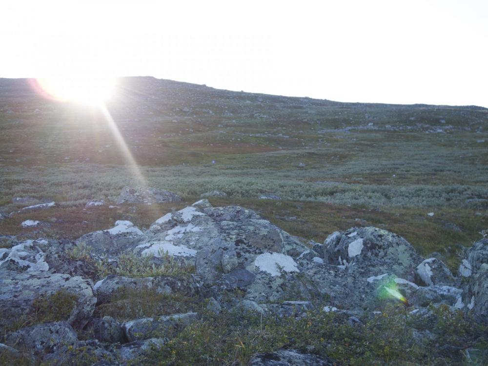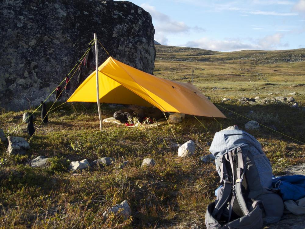 Vielen Dank für die bisherigen Los-Käufe; im Augenblick ist die Gewinnchance sehr hoch! Und ich muss betonen: das Ding macht Spaß! Natürlich verlangt so ein Tarp ein bisschen Erfahrung und Vorausplanung, aber in den letzten 7 Jahren bin ich nur in einer einzigen Nacht an die Grenzen gekommen! (darüber habe ich einen thread bei "Ausrüstung" gestartet, Thema "Mit Tarp in den Sarek"). Hier zum Beispiel der Einsatz im Sarek bei stärkerem Wind ohne Niederschläge: der große Stein schützt vor den schlimmsten Böen, die kleinen Steine beschweren die Heringe. (Die aufgehängten Socken sind allerdings über Nacht nicht getrocknet, sondern waren morgens steif gefroren...)