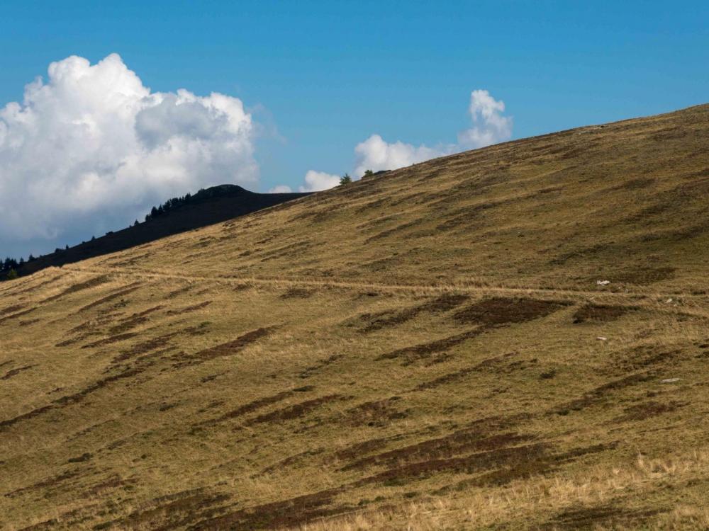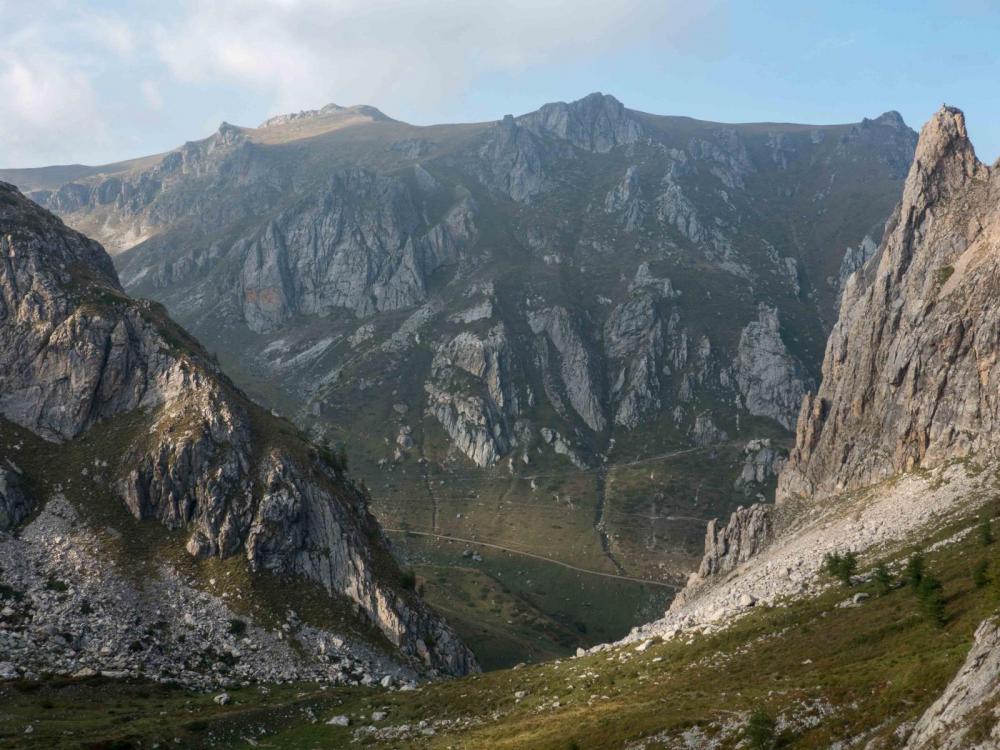 Vielen Dank für deine nette Rückmeldung! 30. Tag - 08.09.2020 oder auf alten Pfaden Oberhalb Lago del Laux - Colleto delle Fontane 23.2 Kilometer, + 1306 hm, -1962 hm, 8 Stunden, 26 Minuten Nach wenigen Minuten laufen. Im Aufstieg zum Colle dell`Albergian So! Nachdem meine Partnerin und ich die GTA am 2.9.2021 gemeinsam beendet haben wird es Zeit auch hier vorwärts zu kommen. Nach einer guten Nacht kam ich für meine Verhältnisse früh (oder sagen mir mal etwas zeitiger) los und konnte mich alsbald an der Sonne wärmen. In der Nacht spürt man teilweise bereits den einziehenden Herbst und die Höhe tat ihr übrigens dazu. Aber ich will nicht jammern, tat mein Comforter seine Arbeit doch ausgezeichnet. Auf dem gut ausgebauten Wanderweg kam ich gut und schnell voran in Richtung Colle dell`Albergian. Doch schnell einmal wurde mein Trott von zahlreichen Murmeltieren unterbrochen welche wie wild pfiffen. Das alleine wäre noch kein Grund zum Anhalten, pfeifen doch die ganze Zeit Murmeltiere rum. Die kleinen Vieher waren aber nicht wirklich scheu und genossen wie ich die Sonne. Dabei erspähte ich in einiger Entfernung noch eine alte Militärkaserne (Caserma dei Laghi dell`Albergian). Mich interessieren solche alten Ruinen und die Geschichte dahinter immer sehr. Ich überlegte noch kurz auch diese Ruine zu besuchen, verwarf den Plan aber da es ein zu grosser Umweg gewesen wäre. Ich sollte auch so noch zu meinen Losplaces kommen und die Anlagen sind leider so gut wie nie beschrieben. Ab und an finden sich mal alte Jahressteine oder ähnlich. Caserma dei Laghi dell`Albergian Edelweiss am Wegesrand. Leider etwas unscharf. Abstieg vom Colle dell`Albergian Der anschliessende Abstieg via einer anderen Militärruine zog sich dann ganz schön in die Länge. Immerhin konnte ich diesen auf dem ersten Stück auf einem alten, gut erhaltenen Militärpfad zurücklegen. Zu meiner Überraschung kamen mir auf diesem auch noch vier andere Wanderer entgegen. Es sollten nahezu die einzigen Menschen sein die ich heute sehe. Dafür wurde ich weiter unten Zeuge eines beeindruckenden Schauspiels. Ein Schaf leckte gerade sein neugeborenes Lamm ab. Dieses war noch sichtlich unsicher auf den Beinen und der Mutter war meine Anwesenheit, selbstverständlich aus einiger Distanz vom Wanderweg, offenbar nicht so ganz geheuer. Ich entfernte mich etwas und schaute noch eine Weile aus der Ferne zu. Schon bald stiess ich aber auf die nächsten Tiere (Azzinos oder Mulas - ich kann die nie unterscheiden). Ich weiss nicht ob die Tiere für den Herdenschutz eingesetzt wurden oder einfach so auf der Weide sömmerten. Jedenfalls waren auch die ab dem Wanderer nicht so begeistert und beäugten mich misstrauisch. Vielleicht stinke ich mittlerweile auch einfach wie ein toter Marder. Dann lasse ich die Tiere mal ihrer Tätigkeit nachgehen und ziehe weiter unter/ neben dem schönen Wasserfall durch. Wenig später sah ich aus einiger Entfernung noch den Hirten der Tiere. Irgendwann erreichte ich dann endlich Balsiglia. Der lange Abstieg ging ganz schön in die Beine und ich war etwas erschöpft. Ich machte es mir beim Picknickplatz unterhalb des PT gemütlich und schaufelte Wildschweinwurst, Nutella und Piadina rein. Offenbar übertrieb ich es etwas oder die Kombination war selbst für meinen Magen zu abentuerlich. Jedenfalls hatte mein Magen keine Freude daran und rebellierte etwas. Auch wenn ich keine wirkliche Freude am nun zusätzlichen Abstieg auf der Strasse hatte, wird aber jeder Meter zu Fuss bewältigt. Anfänglich wie vom Rother beschrieben auf der selten befahrenen, steilen Strasse. Bald aber zweigte die GTA auf Bergwanderwege und später auf breite Pisten ab und so erreicht man entgegen der Buchbeschreibung (auch die Karte im Rother ist falsch) die Foresteria auf schönen Wegen. Ich beschloss mir in der Foresteria einen Kaffee zu gönnen und vorallem die Toilette aufzusuchen. Der weitere Weg von Masello nach Didiero war dann kein wirkliches Highlight und jeder der hier den Shuttle (im Rother beschrieben) in Anspruch nimmt verpasst nichts. In DIdiero war dann zu meiner Überraschung einiges los was mir nach dem heutigen Tag etwas zu viel war. So liess ich die vorgenommene Besichtigung des Örtchens bleiben und bestaunte nur kurz einige der schönen Murales (Wandbilder). Ich nahm noch den letzten Anstieg zum Colleto delle Fontane unter die Füsse und beschloss es für heute gut sein zu lassen. Der schöne Picknickplatz mit Brunnen war einfach perfekt für ein Nachtlager. Dazu die ideale Gelegenheit mich und die Kleider mal wieder richtig zu waschen. Weiter war es mal wieder Zeit etwas Planung für den weiteren Tourverlauf zu machen. Zu Beginn hatte ich mir mal Ghigi di Prali als mögliches Ziel ausgesucht. Nun hatte ich noch acht Tage und es galt ein neues Ziel mit ÖV-Anschluss zu bestimmen. Leben unterwegs- 59 Antworten