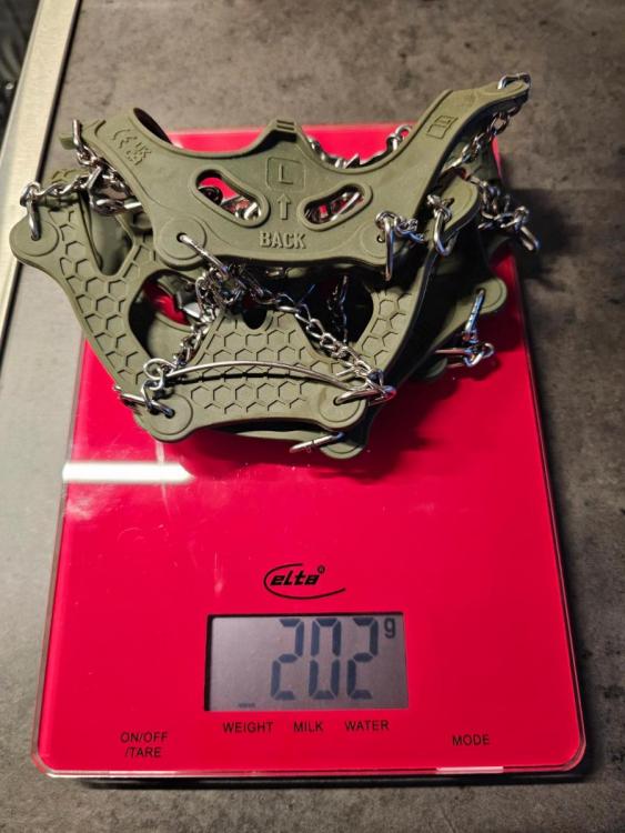 Ich habe die 500 light, die wiegen in Größe L 202g das Paar. Schuhgröße ist 44.5 in Inov8-Trailrunnern. Zum Vergleich: Die klassischen Kahtoola Mikrospikes in M wiegen 359g/Paar. Auf den Fotos sieht man, wie filigran die 500 light im Vergleich sind. Bei einem kurzen Test (30 Minuten, also nicht überbewerten!!) in den letzten Tagen auf Eis, lockerem und überfrorenem Schnee (auch bergauf bergab) war aber erstmal nicht so viel Unterschied zwischen den beiden zu merken, da war ich echt positiv überrascht.