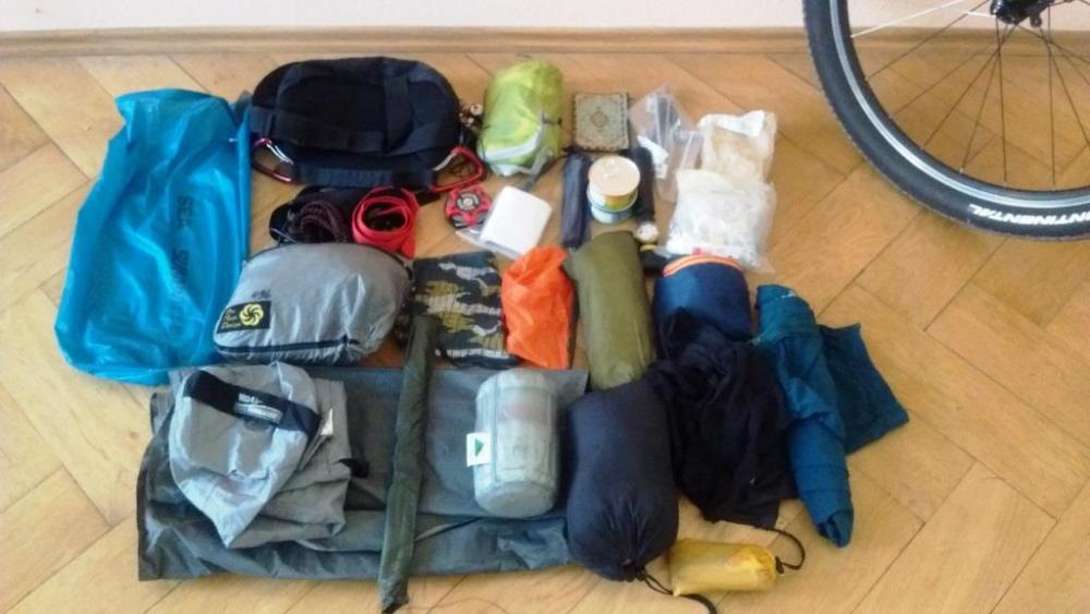 Hallo Für die Befestigung der Packtasche habe ich folgendes genäht: Mit Packsack sieht das so aus: Dadurch dass ich die Spannriemen zwischen Lenker und Gabel gespannt habe schwingt die Sache ein wenig. Es wird sich erweisen ob die Lösung praktikabel ist. Wallfahrer