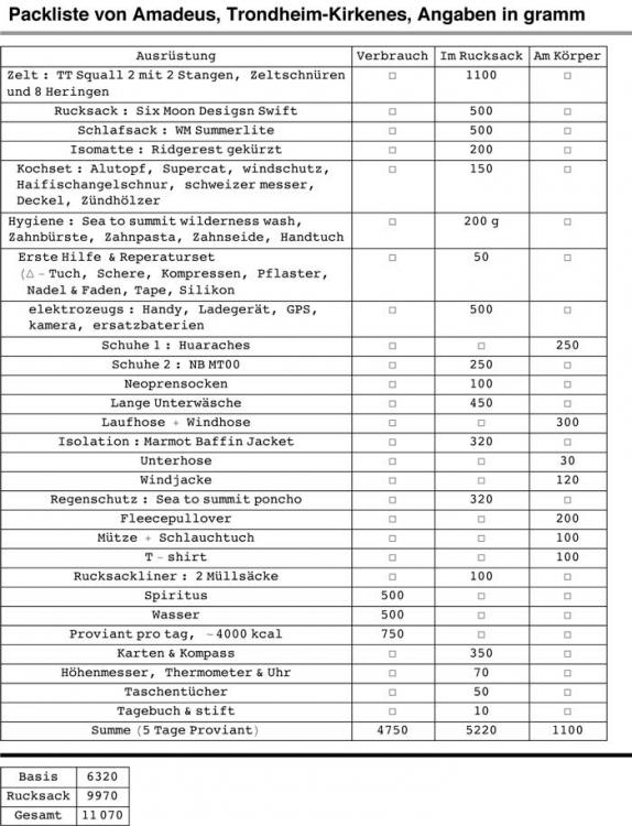es gibt eine, leider nur als pdf, was man hier offenbar nicht hochladen kann! ich hab aber alles so ungefähr in dem einen faden viewtopic.php?f=7&t=171 beschrieben. EDIT: ich hab sie jetzt konvertiert und noch gepostet. packliste zu finden in dem oben genannten faden.