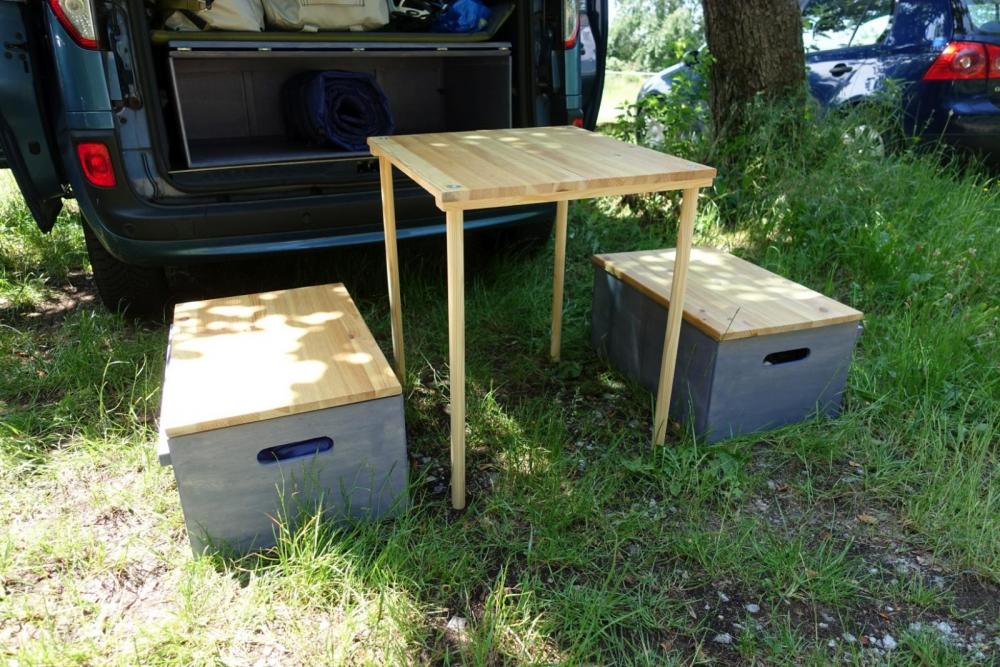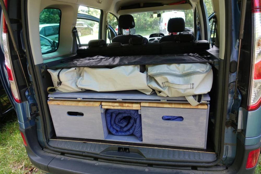 Wir konnten endlich am Wochenende unseren neuen Micro-Camper einweihen: Basis ist ein gewöhnlicher Kangoo, im Kofferraum steht (nicht festgeschraubt) eine Box die den Kangoo zum Camper macht. Die Box ist ca. 110x63x30cm groß. Ich habe sie hauptsächlich aus 10mm Pappel-Sperrholz gebaut, daher ist sie relativ leicht. Im Kofferraum verstaut, es sind alle 5 Sitzplätze nutzbar: (in der Mitte über der Isomatte ist die zusammengeklappte Tischplatte) Outdoormodus: Indoor-Modus bei Regen, Platz für 2 Personen. In der Box oben sind alle Kochutensilien, die andere Box ist die 2. Sitzgelegenheit: Nachtmodus: -