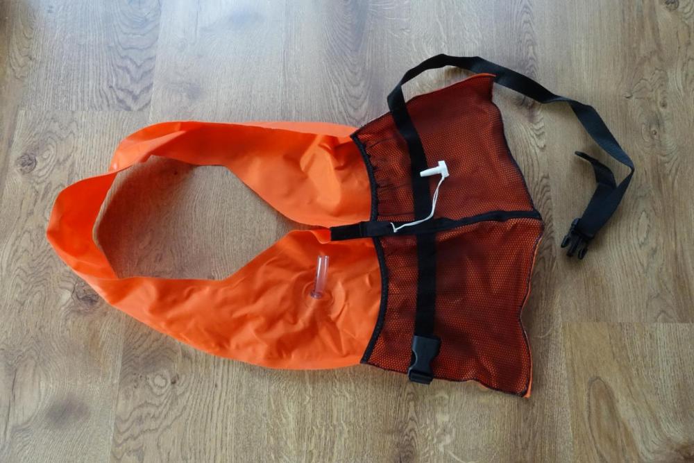 Dieser Prototyp ist an dem MYOG Wochenende bei Andi entstanden. Vielen Dank nochmals an dich Andi, dass wir die Möglichkeit hatten bei dir zu basteln und zu feiern! Die Schwimmhilfe ist ein Prototyp, ich wollte testen ob das Konzept so funktioniert. Die Schwimmhilfe sollte aufblasbar sein, um das Packmaß zu verringern. Meine feste Schwimmweste ist einfach zu sperrig. Als Material habe ich das einseitig beschichtete TPU von Extremtextil verwendet, aus dem ich auch meine Packrafts gebaut habe. Da ich nur einen schmalen Streifen Restmaterial hatte, habe ich folgendes Schnittmuster verwendet: Dadurch knickt der Schlauch, der um den Hals geht zwar ab, das stört aber nicht wirklich. Besser wäre aber ein Schnitt, der in etwas so aussieht: Der Rest ist einfach: 1. Ventil einkleben bzw. wenn es möglich ist einschweißen (bei TPU-Ventilen) 2. Kanten rundum verschweißen 3. Gurtband aufnähen 4. Vordere Kanten verbinden 5. Netztaschen aufnähen Fertig! Gewicht exakt 200g!