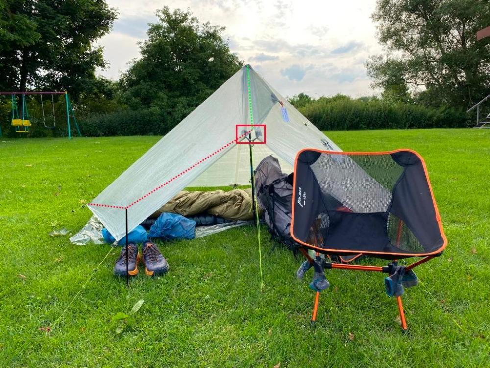 Ein UL-Kumpel und ich haben am Wochenende mit seinem Borahgear Solo Tarp gespielt. (Danke an @basti78 für den problemlosen Verkauf und sehr schnellen Versand.) Dabei haben wir eine simple Modifikation vorgenommen, die vielleicht euer Interesse findet. Hintergrund: Wir bevorzugen den Aufbau als Mid. Dabei bleibt eine Seite weitestgehend offen. Hier im Forum findet man verschiedene Vorschläge, wie ein Beak (eine Art Walmdach an der offenen Seite) realisiert werden kann, z.B. durch Annhähen von Dreiecken, Drüberlegen eines Regenschirms oder Anbinden einer Jacke etc. Das Boragear Solo Tarp ist aber schöne 165×272 cm groß. Es bietet es genug Breite für einen Mid-Aufbau mit integriertem Beak, der entsteht, wenn man die Tarpstange/den Trekkingstock nicht vor, sondern unter das Tarp stellt. Zur Verdeutlichung vorab die Geometrie in der Seitenansicht: Es ist für die abgedeckte Fläche ist also egal, ob man das Tarp gestreckt zum Stock führt (blaue Variante A) oder über den Stock abwinkelt zu einem Beak (blaue Variante B). Die abgedeckte Fläche ist gleich groß. Wenn man aber den Stock weiter nach innen schiebt (rote Variante C), steht die Rückwand steiler und der nutzbare Raum in der Höhe verbessert sich signifikant, obwohl die Bodenhöhe hB und die Eintrittshöhe hE dieselbe wie bei Variante B ist. Das sind keine neuen Erkenntnisse, dient hier nur als Hintergrundinfo. Da wir an der Rechteckform des Tarps nichts ändern wollten, haben wir uns gefragt, wie wir den Beak flexibel, aber einfach konfigurierbar halten, um im Camp frei aus den unterschiedliche Mid-Geometrien respektive Beak-Tiefen auswählen zu können. Unsere Lösung: Ein Tanka, aufgenäht auf der Vorderkante, ca. 40 cm seitlich der Mittelschlaufe. Ein Stück starke Shock-cord, an der Mittelschlaufe eingeknotet. (Die Stockfixierung auf den Fotos ist vorläufig, es ging um den Test des Beak-Befestigung.) (Fast) egal, wie hoch und tief wir den Beak beim Aufstellen konfigurieren: Es genügt nun, das herunterhängende Material an der Mittelschlaufe seitlich um die Abspannschnur zu legen und das lose Shock-cord-Ende in den Tanka zu schieben. Dann steht der Beak passend zur gewählten Geometrie. Da ich Ähnliches bei der Suche nicht gefunden habe, poste ich es einmal hier, denn es ist eine einfache Modifikation, die an praktisch jedem ausreichend breiten Rechtecktarp vorgenommen werden kann. Anmerkungen: Man könnte selbstverständlich auch eine lange Leine von der Mittelschlaufe zu einem der Eckheringe führen. Wir haben uns bewusst für die Lösung mit der starken Shock-cord entschieden. Denn die Verbindung muss beide Vorderkanten des Tarps gestrafft halten, ohne die Kräfte der Eckheringe zu überfordern. Eine dicke Shock-cord erreicht die Maximaldehnung bei ca. 3,5 kg Zugkraft. Bereits mit unter 3 kg hängen die Vorderkanten nicht mehr durch. Der Tanka hält das gut und die zusätzliche Zugkraft auf die Heringe hält sich noch in Grenzen. Eine dünnere Shock-Cord würde bei ca. 2 bis 2,5 kg maximal gedehnt werden und damit schneller ausleihern und nicht mehr federn können (Zugentlastung der Heringe; Aus-dem-Tanka-Rutschen bei Wind). Die Befestigungslösung ist nicht so richtig hübsch. Evtl. fällt ja jemand noch etwas Geschickteres ein.