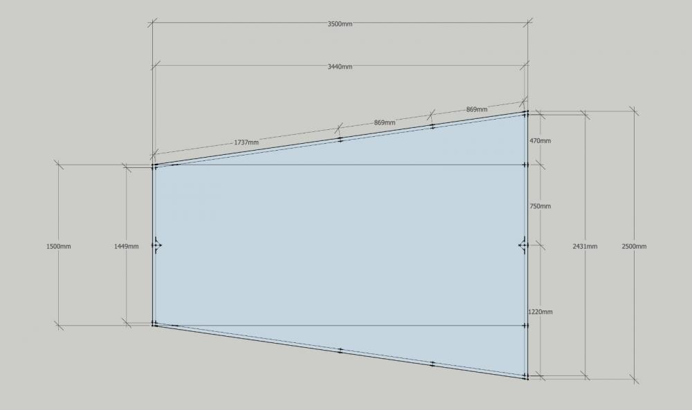 Kann man, sowas klappt sogar bei mir als Grobmotoriker. Hier ein Beispiel (ohne Mesh) der fortschreitenden Evolution vom Flat-Tarp zu einem Tarp/Tent mit Beak, das war mein erstes Projekt in der Richtung: Thread zum Tarp selbst: An der Längsseite des Tarps habe ich dann ein Stück von der Mitte Abspanner angebracht (roter Kasten), um einen Beak zu formen, und weiter innen eine Verstärkung für den Wanderstock aufgeklebt. Theoretisch müsste ich nur noch die vordere Ecke einrücken und da einen Saum nähen (rote Linie), und natürlich den Beak verkleben (grüne Linie) um so etwa die Form des Abode zu bekommen. Da alles gerade Kanten sind, halten sich die handwerklichen Anforderungen in Grenzen. Das Einkleben des Meshgewebes dürfte das fummeligste daran sein, aber da finden sich im MYOG-Bereich hier im Forum mit Sicherheit Erläuterungen bei den DCF Single Wall Zelten. Zum Ausprobieren kannst du einfach mit einer billigen 3x4m Baumarkt-Gewebeplane experimentieren. Für die Abspannung Löcher rein machen und Stöckchen dahinter, um die die Schnüre gebunden sind, dann kannst du auch etwas Zug drauf geben ohne dass es ausreißt, und dann mit den Abmessungen spielen und alles so lange versetzen, bis die Dimensionen passen. Naht- und Saumzugaben dazu, und du hast ein Schnittmuster.