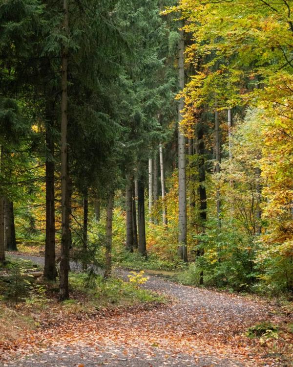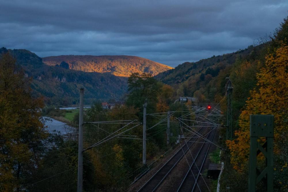 Tag 4: Endspurt mit Abkürzung Spitzsteinbiwak–Bad Schandau / 31 km GPS (mein Weg), ~36 km Karte? (offizieller Weg) / 1014 HM / 8:10 h Ich bin früh wach, aber nicht früh auf: Es regnet. Als es um halb sieben nur noch gemächlich tropft, schäle ich mich aus dem Schlafsack und kletter aus dem Zelt. Langsam stopfe ich alles in den Rucksack, schnüre das nasse Zelt oben drauf, wärme noch meine Hände am Kaffee und ein Stündchen später geht es dann los. T ist mir kurz voraus, wir planen beide, den Weg in Königstein zu beenden. Mit dem Regen hat der Weg heute noch eine Neuigkeit parat: ein bisschen Nebel. Ideal für die Landschaft, die immer mystischer wird: Die Felsen ragen nicht länger weit empor und sind von Wind und Regen glatt gewaschen, sondern tief im Wald versteckt und moosbewachsen. Man könnte sagen, es ist märchenhaft – die Art von Märchen, in denen böse Hexen nach Kräutern für ihre Tränke suchen ... wie passend, ist heute doch Halloween! Der Lampertstein bietet den ersten weiten Blick von vielen, das bedeutet: viele kleine Aufstiege. Da der einzige Regen nun alter Tropfen von den Bäumen ist, darf die Regenkleidung glücklicherweise weichen. Ein weiterer Stein, der Bernhartstein, dann folgt ein Highlight der Route: das Labyrinth. Die Sammlung von Felsen ist am Feiertag ein großer Familienspielplatz, die Kinder rennen, hüpfen und klettern durcheinander. Auch ich laufe alles einmal ab, dann geht's weiter durch die Nikolsdorfer Wände zur Pause beim nächsten Biwakplatz. Es ist noch nicht einmal Mittag, Königstein nicht mehr weit. Möchte ich wirklich dort schon aussteigen? Ganz nach Bad Schandau wird zu weit und knapp, aber mit einer kleinen Abkürzung hier und da … könnte klappen! T kommt nach und segnet den Plan ab (damit ich nicht wieder fast das Beste verpasse). Er lädt mich noch auf eine Scheibe Brot und Käse ein, dann verabschiede ich mich und ziehe von dannen. Der Endspurt steht an. Wieder Wald, dann ein Stück Straße, da der Pfad wegen Waldarbeiten umgelenkt wird. Kurz darauf der Aufstieg zum Quirlbiwak, ich überspringe die Quirl-Schleife und mache Fortschritt auf dem Forstweg zum Gohrisch. Schnaufend geht es steil hinauf, dann – was ein Ausblick! Auf dieser letzten Etappe geht es von Stein zu Stein und damit auf und ab. Als nächstes steht der Papststein an, mich lockt die Gastronomie und ein warmes Getränk, also hetze ich hinauf. Mit dem ersten Regentropfen komme ich oben an, genieße ein Radler (ok, doch ein kühles Getränk – die heiße Zitrone war aus!) und einen Apfelstrudel mit Vanilleeis. Viel länger verweile ich nicht, denn die Blicke kenne ich mittlerweile, das Licht ist fad, die Dunkelheit naht. Oder seien wir ehrlich: Meine Beine sind müde. Kurzerhand überspringe ich den Kleinhennersdorfer Stein und ersetze den Forststeig für ein Kilometerchen auf dem Malerweg, dann gehe ich geradewegs nach Bad Schandau hinab. Als ich die Gleise erreiche, kann ich meinen Augen kaum glauben. Die Felswand auf der anderen Elbseite erstrahlt zum Abschluss in tiefem Orange, das erste schöne Abendlicht der ganzen Reise! Toll war‘s! Abends im Bett schaue ich durch meine Bilder und stelle fest, dass der Weg noch viel schöner war als in meiner direkten Erinnerung. Zwischendurch gab‘s immer mal schönes Licht, ständig schöne Blicke, immerzu schönen Wald und kaum eine Sekunde ohne bunte Bäume. Ich war noch nie so lange durchgehend im Wald unterwegs oder habe den Herbst so intensiv erlebt. Danke, Forststeig! -