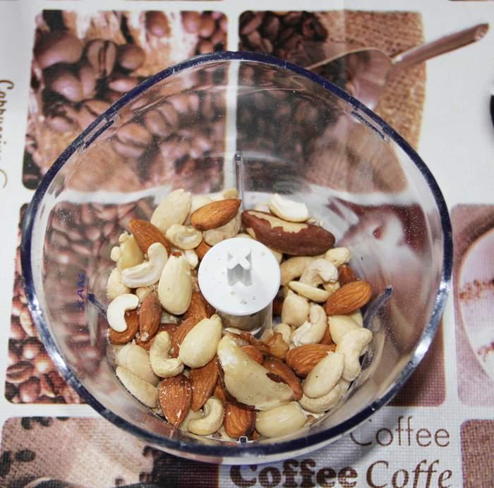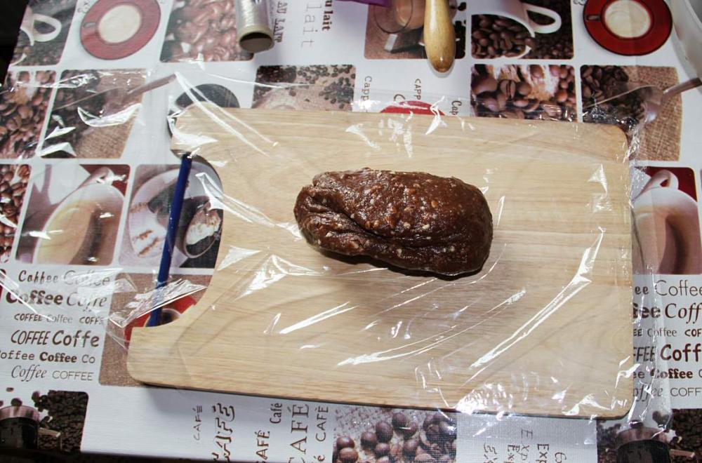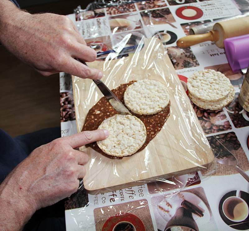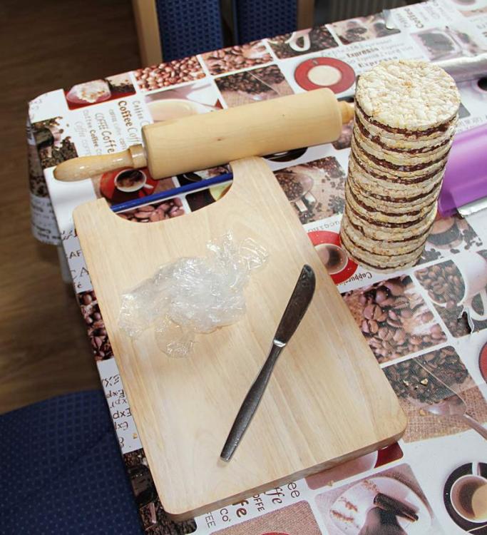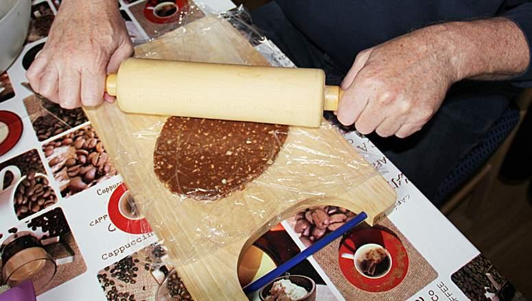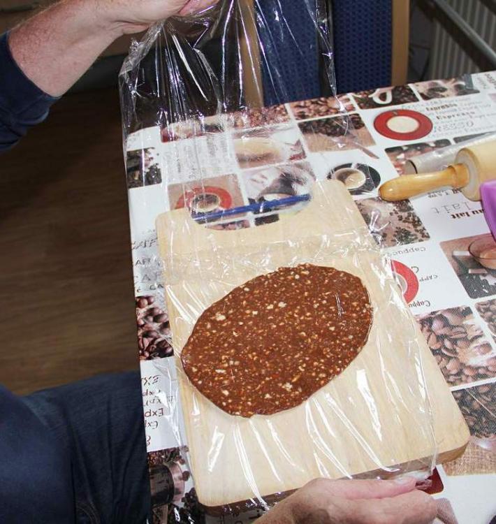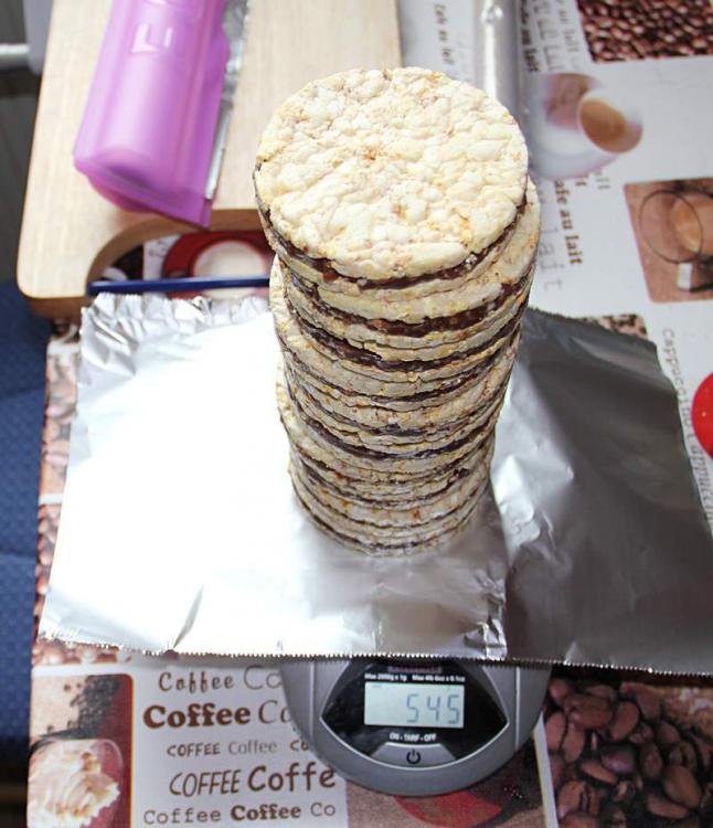 Waffel vs. Snickers Snickers kennt ja Jeder. In den Trekking-Foren findet man jedoch eine Unzahl von leckeren Rezepten, mit denen man Snickers einfach links liegen lassen kann. Mein Favorit sind "Trail-Kekse" aus Maiswaffeln mit Meersalz, wie sie bei Rossman erhältlich sind. Nicht so bröselig wie Cracker und sehr lange haltbar. Dazu kaufe ich mir noch eine Nuss-Mischung. Man kann natürlich auch nur die Nüsse seiner Wahl verwenden. An Geräten werden benötigt: Küchenwaage größere Schüssel Alufolie Klarsichtfolie Nudelholz Holz- oder Kunststoffbrett als Unterlage Zerkleinerer für die Nüsse Zuerst gebe ich die Nüsse in den Zerkleinerer. Die Nüsse zerkleinern. Darauf achten dass die Nussstücke nicht zu groß bleiben, da die Waffeln dann nicht so gut zusammenhalten. Wie fein die Nüsse gemahlen werden, ist allerdings Geschmackssache. Wer in der Waffel noch ein bischen Biss will, sollte die Nussstücke nicht zu Puder zermahlen. Hier gilt: experimentieren. Wir geben in die Schüssel 100 Gramm normales Weizenmehl. Auch hier gilt: Wer Vollkorn-Mehl oder was auch immer verwenden will: experimentieren ! Dazu gibt man 100 Gramm Honig. Auch hier haben wir wieder die freie Wahl, welchen Honig wir verwenden. Also: experimentieren ! Jetzt folgen 75 Gramm NUTELLA. Ich habe auch schon Versuche mit Erdnussbutter gemacht, aber bei mir kommt nichts an Nutella ran !. Im Original-Rezept heißt es jetzt, 50 Gramm Nüsse hinzuzugeben. Ich bin hier jedoch der Meinung, dass ab jetzt nach Herzenslust weiter experimentiert werden darf. Ich gebe hier beispielweise die ganze Tüte gemahlene Nüsse hinzu. Es dürfen nur nicht so viel sein, dass der Honig und Nutella die Masse nachher nicht mehr zusammenhalten können. Gerne gebe ich an dieser Stelle ebenfalls eine Handvoll Cranberrys oder Rosinen hinzu (je nach gusto). Wie gesagt: experimentieren. Jetzt das Ganze etwa 15 Minuten lang durchkneten, bis eine braune homogene Masse daraus wird. (Nicht vergessen, vorher ggf. den Ehe- Verlobungs- Freundschafts- oder was auch immer Ring, abzulegen). Hände waschen braucht hier wohl nicht extra erwähnt zu werden. (Als ich das Rezept das erste Mal ausprobiert habe, hatte meine Frau Tränen gelacht, als ich in die Schüssel greifen mußte. Ich, der schon bei einem Tropfen Marmelade auf dem Finger mit angewidertem Gesicht zum Wasserhahn rennt.....) Jetzt das Holz- oder Kunststoffbrett mit Frischhaltefolie überdecken und zwar soviel von der Folie abreißen, dass die doppelte Fläche des Brettes an Folie in einem Stück zur Verfügung steht. Die Folie so auf das Brett legen, dass das Brett komplett bedeckt ist und die restliche Folie an einer Seite des Brettes übersteht. Im Bild zu sehen: Das Brett ist komplett mit Frischhaltefolie bedeckt und der gleiche Teil steht nochmals links über. Warum machen wir das ? Wir können natürlich die Masse auch direkt auf den Tisch legen und ausrollen. An sich kein Problem wenn man eine Arbeitsplatte verwendet. Allerdings.... die Nussstücke in der Masse werden beim Ausrollen mit dem Nudelholz auf einem Tisch, der Tischdecke schöne kleine Löcher versetzen, was gleichzeitig die beste Ehefrau von Allen in Rage versetzen wird. Also Vorsicht ! Beim Arbeiten auf einem Tisch lieber ein Holz- oder Kunststoffbrett unterlegen. Ohne Frischhaltefolie ist das Brett innerhalb kurzer Zeit, samt Nudelholz, mit Masse verklebt. Der Abwasch gestaltet sich entsprechend aufwändiger. Mit der Folie kommt die Masse weder mit dem Brett, noch mit dem Nudelholz in Kontakt – alles bleibt sauber ! Jetzt von der ganzen Masse ein größeres Stück abreißen und auf das Brett (die Folie) legen. Die überstehende Folie über das Brett zurückklappen, so dass die Masse zugedeckt ist. Aber die Folie darf nicht am Rand der Masse anstehen, da sonst beim Ausrollen nicht genug Platz bleibt. Jetzt die Masse so ausrollen, wie es die Größe der Folie zuläßt bzw. wie dick man die Masse zwischen den Waffeln haben will. Hier gilt auch wieder: experimentieren ! Wer viel Masse zwischen den Waffeln haben will – logischerweise nicht so stark ausrollen. Wer weniger zwischen den Waffeln haben will – dünner ausrollen. Hat man die gewünschte Dicke ausgerollt, die obere Hälfte der über der Masse geklappten Folie nach der Seite abziehen (aber nicht abreißen !) Jetzt auf die gleichmäßig ausgerollte Masse die Maiswaffeln so legen, dass möglichst wenig „Abfall“ entsteht und mit einem stumpfen (!) Messer die Waffeln umschneiden. (Nimmt man ein scharfes Messer, schneidet man durch die Folie und versaut so wieder seine Unterlage.) Dann löst man die Masse samt Waffel ab, legt eine weitere Waffel auf die abgelöste Masse und drückt diese vorsichtig zusammen. Etwaige Unebenheiten am Rand kann man mit den Fingern glätten, bzw. ggf. ein kleines Stück Masse hineinschmieren, falls man bei Ausrollen Unebenheiten „eingerollt“ hat. Vorsichtig zusammendrücken Jetzt räumt man die Reste wieder zu einem Ballen zusammen, reißt wieder etwas von der Hauptmasse ab, deckt den Ballen wieder mit der Folie zu und beginnt das Ganze wieder neu auszurollen. So wird weitergemacht, bis die ganze Masse verarbeitet ist. Ist man fertig, braucht nur die Frischhaltefolie entfernt zu werden und ausser einem etwas schmierigen Messer, einer gebrauchten Schüssel und dem Zerkleinerer, braucht kaum etwas gespült zu werden. Man schlägt die fertigen Kekse in Alufolie ein und hat so für jede Tour „sein Päckchen zu tragen“ (im Bild immer 2 Kekse). So erhält man etwa 550 Gramm "Trail-Kekse", die es jederzeit mit Snickers aufnehmen können. Voilà ! Viel Spaß beim ausprobieren ! Grüße Tumurbel