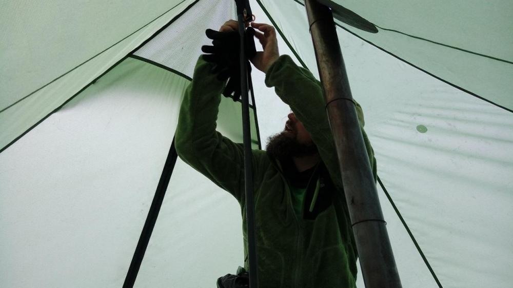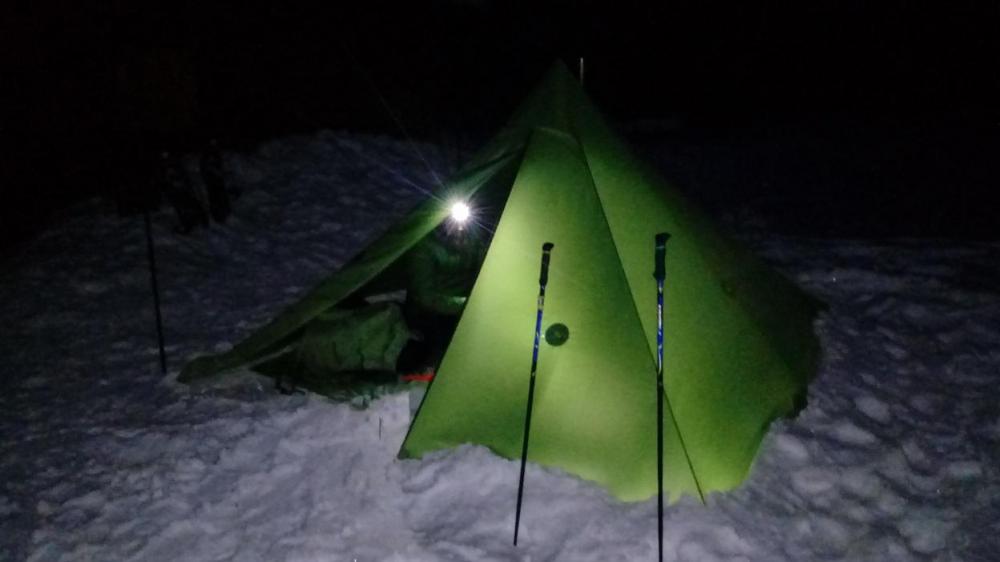 Wurde letzte Woche spontan für 3 Tage Schneeschuhwandern im Fichtelgebirge eingeladen. Beim Packen wahr auch an die Wasserversorgung durch Schneeschmelzen zu denken. Hier kahm mir der 1200 ml Snow peak den ich am Forumstreffen von Norweger bekam sehr gelegen. Er diente außerdem als Schneeschaufel für Hüft- loch , und zum Zelt abdichten. Um effizient an mehr Wasser zu kommen , hatte ich eine spontane Idee. Da sich in der Zeltspitze des Lavu die Wärme vom Ofen sammelt , macht es sinn , diese zu nutzen. So nahm ich den Überzieher meines Regenschirmes , und knipste 3 Löcher in den Rand. Noch 3 Karabiener und 3 / 1 Liter Zipperbeutel , fertig war die " Schmelzapparatur " . Es braucht Zeit , bis sich der Aggregatszustand vom Schnee bei -13 C° Außentemperatur ändert . aber man schührt ja fleißig für Essen und Tee . Letztendlich , hat man den Schnee , für die Wärmflaschen , alleine durch die sonst ungenutzte Abwärme verflüssigt . Das ganze wiegt 30 g , und lässt sich leichter machen . Auch zum Trocknen von Handschuhen , Socken , und Daunen Jacke kahm es zum Einsatz. Leider kein Foto mit den Schneebeuteln gemacht , aber Andi beim Handschuhe aufhängen.