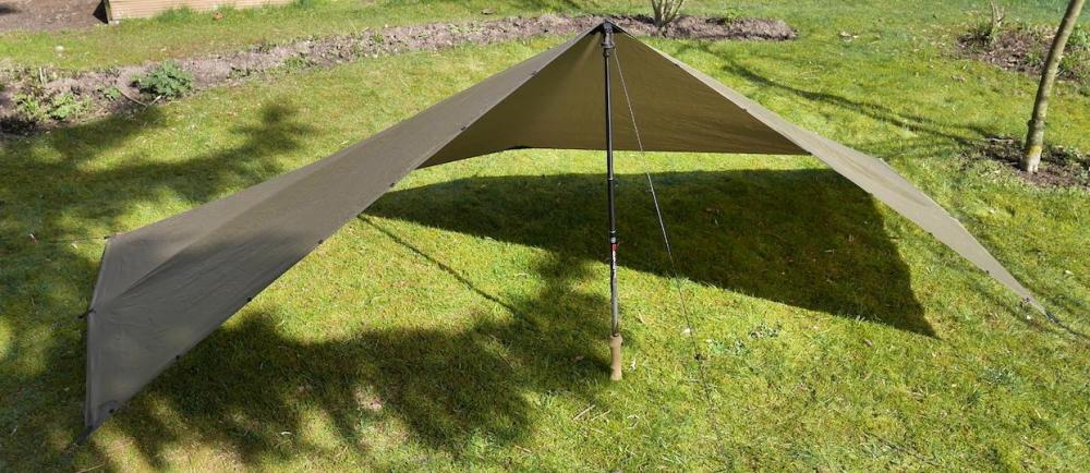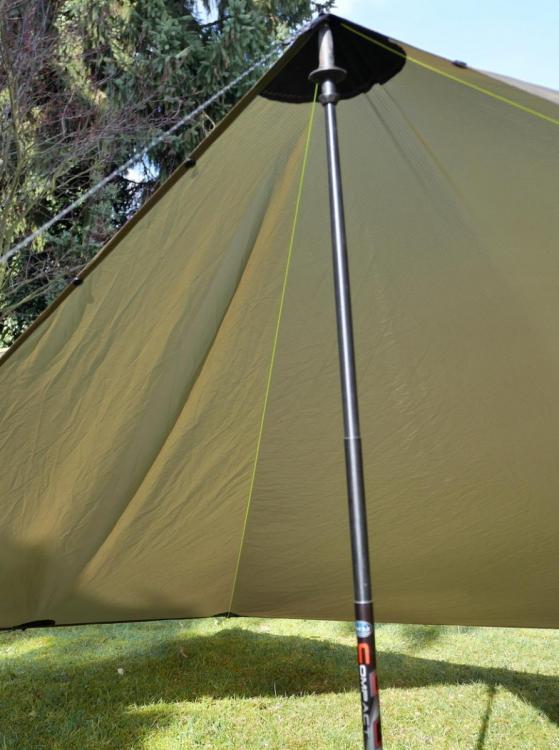 Ein UL-Kumpel und ich haben am Wochenende mit seinem Borahgear Solo Tarp gespielt. (Danke an @basti78 für den problemlosen Verkauf und sehr schnellen Versand.) Dabei haben wir eine simple Modifikation vorgenommen, die vielleicht euer Interesse findet. Hintergrund: Wir bevorzugen den Aufbau als Mid. Dabei bleibt eine Seite weitestgehend offen. Hier im Forum findet man verschiedene Vorschläge, wie ein Beak (eine Art Walmdach an der offenen Seite) realisiert werden kann, z.B. durch Annhähen von Dreiecken, Drüberlegen eines Regenschirms oder Anbinden einer Jacke etc. Das Boragear Solo Tarp ist aber schöne 165×272 cm groß. Es bietet es genug Breite für einen Mid-Aufbau mit integriertem Beak, der entsteht, wenn man die Tarpstange/den Trekkingstock nicht vor, sondern unter das Tarp stellt. Zur Verdeutlichung vorab die Geometrie in der Seitenansicht: Es ist für die abgedeckte Fläche ist also egal, ob man das Tarp gestreckt zum Stock führt (blaue Variante A) oder über den Stock abwinkelt zu einem Beak (blaue Variante B). Die abgedeckte Fläche ist gleich groß. Wenn man aber den Stock weiter nach innen schiebt (rote Variante C), steht die Rückwand steiler und der nutzbare Raum in der Höhe verbessert sich signifikant, obwohl die Bodenhöhe hB und die Eintrittshöhe hE dieselbe wie bei Variante B ist. Das sind keine neuen Erkenntnisse, dient hier nur als Hintergrundinfo. Da wir an der Rechteckform des Tarps nichts ändern wollten, haben wir uns gefragt, wie wir den Beak flexibel, aber einfach konfigurierbar halten, um im Camp frei aus den unterschiedliche Mid-Geometrien respektive Beak-Tiefen auswählen zu können. Unsere Lösung: Ein Tanka, aufgenäht auf der Vorderkante, ca. 40 cm seitlich der Mittelschlaufe. Ein Stück starke Shock-cord, an der Mittelschlaufe eingeknotet. (Die Stockfixierung auf den Fotos ist vorläufig, es ging um den Test des Beak-Befestigung.) (Fast) egal, wie hoch und tief wir den Beak beim Aufstellen konfigurieren: Es genügt nun, das herunterhängende Material an der Mittelschlaufe seitlich um die Abspannschnur zu legen und das lose Shock-cord-Ende in den Tanka zu schieben. Dann steht der Beak passend zur gewählten Geometrie. Da ich Ähnliches bei der Suche nicht gefunden habe, poste ich es einmal hier, denn es ist eine einfache Modifikation, die an praktisch jedem ausreichend breiten Rechtecktarp vorgenommen werden kann. Anmerkungen: Man könnte selbstverständlich auch eine lange Leine von der Mittelschlaufe zu einem der Eckheringe führen. Wir haben uns bewusst für die Lösung mit der starken Shock-cord entschieden. Denn die Verbindung muss beide Vorderkanten des Tarps gestrafft halten, ohne die Kräfte der Eckheringe zu überfordern. Eine dicke Shock-cord erreicht die Maximaldehnung bei ca. 3,5 kg Zugkraft. Bereits mit unter 3 kg hängen die Vorderkanten nicht mehr durch. Der Tanka hält das gut und die zusätzliche Zugkraft auf die Heringe hält sich noch in Grenzen. Eine dünnere Shock-Cord würde bei ca. 2 bis 2,5 kg maximal gedehnt werden und damit schneller ausleihern und nicht mehr federn können (Zugentlastung der Heringe; Aus-dem-Tanka-Rutschen bei Wind). Die Befestigungslösung ist nicht so richtig hübsch. Evtl. fällt ja jemand noch etwas Geschickteres ein.