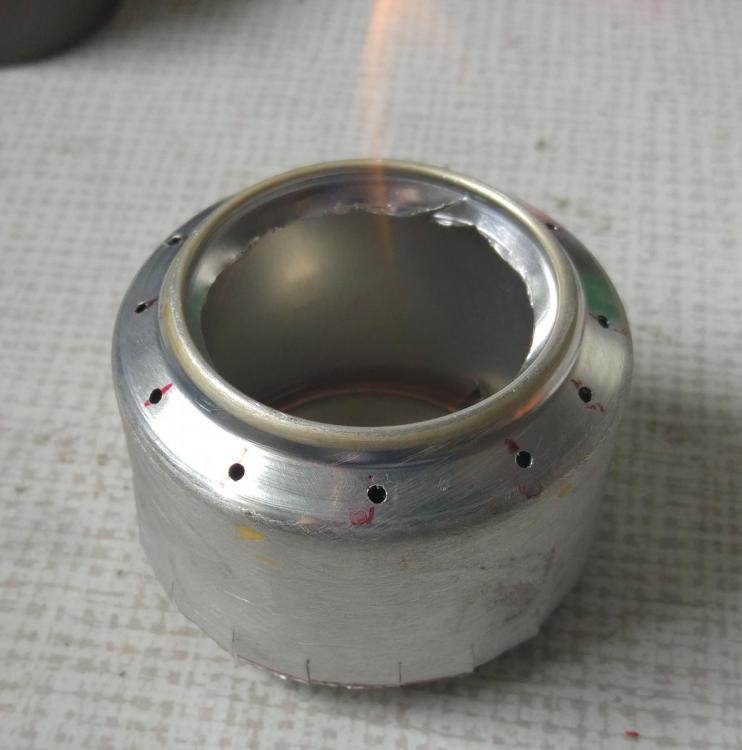 Ich bin ja eigentlich der absolute Hobonutzer, will mir aber jetzt doch mal für "besondere Situationen" einen Spirituskocher zulegen. Einen uralten Trangia habe ich zwar, klar, der ist natürlich sauschwer im Gegensatz zu den überall vorgestellten Bierdosenkochern ... also den heutigen Sonntag mal dafür benutzt ... was soll ich sonst machen ... mir war ja sooooo langweilig ! Nach vielen Youtubevideos gefiel mir dann das Prinzip der Brennraumtrennung mittels einem zentralen Blechrohr, das oben und unten in der ohnehin vorhandenen Vertiefung eingeklemmt wird. Fand ich besser als die Variante mit den "Wellen" im Blech, die man "reinknicken" muss. Habe mich exakt an diese Anleitung gehalten, da es im Video ja auch super funzt: Auch an die Masse habe ich mich exakt gehalten, ist ja mein erster Versuch. War auch alles nicht schwer ... nur leider brennt das Teil (siehe Bilder) zwar im Innenraum, die Düsen zünden aber leider nicht. Die Düsen habe ich erst mit 1mm Durchmesser gebohrt, als es nicht ging wurden sie auf 2mm erweiteret (in den Bildern 2mm). Da ich mir dachte, die Gase werden zum Zünden nicht heiß genug (Anfassen des Brenners geht nicht), habe ich die Höhe des Brenners um 1cm gekürzt, Düsen zünden aber trotzdem nicht ... hm !!?? Der Spiritus kann unten definitiv in den äußeren Bereich fliessen, also sollten auch Spiritusgase nach oben zu den Düsen verdunsten. Oben ist der Zwischenraum auch dicht zum Innenraum. Einzigste Erklärung die ich sehe ist eben, dass die Spiritusdämpfe nicht heiss genug aben raus kommen ... aber warum ? Hat jemand Lust auf eine Analyse oder sieht ein Spirituserfahrener von Euch einen offensichtlichen Fehler ? Bin für jeden Tip zu haben !