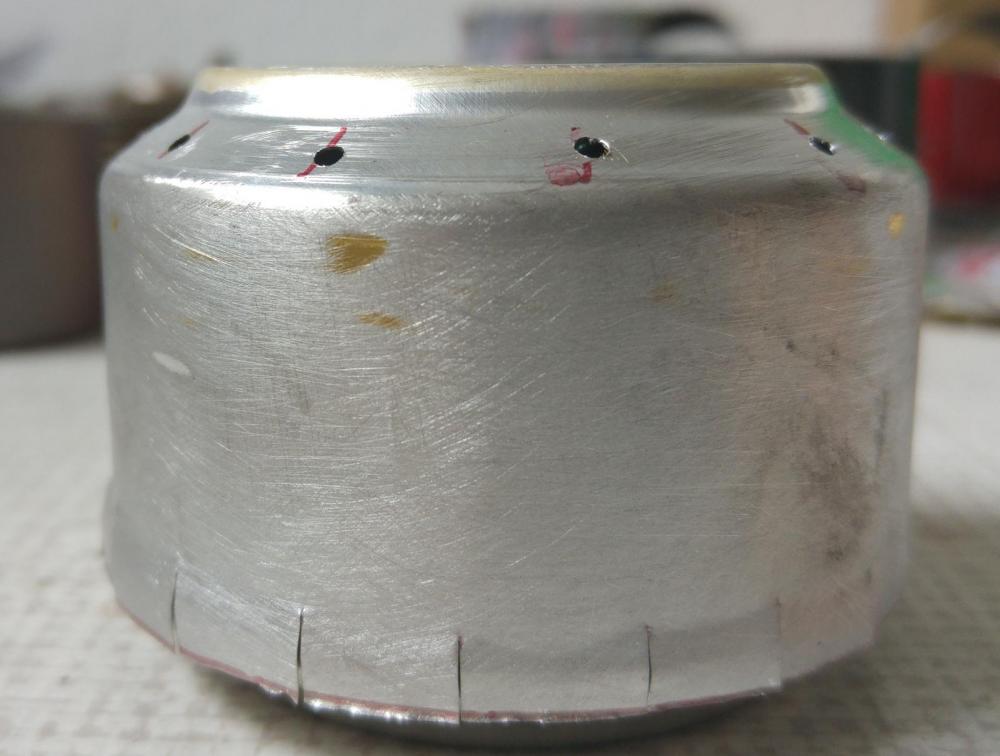 In den vergangenen zwei Monaten habe ich mich intensivst mit unterschiedlichen Bauarten von Spiritusbrennern beschäftigt. Bei der Konstruktion waren mir neben einer kompakten Bauweise, die Leistung, die Rußbildung, der Verbrauch, aber auch das Gewicht, wenngleich untergeordnet, wichtig. Bei meinen Versuchen haben sich vier Kochertypen mit unterschiedlichen Vorzügen herauskristallisiert, die ich dann jeden für sich optimiert habe und die ich in gleichbleibender Qualität reproduzieren kann. Im Folgenden möchte ich die Brenner in Wort, Bild und Video vorstellen, und am Schluß untereinander und mit einem Vergleichbaren kommerziell erhältlichen (Toaks Syphon) in einem Test gegenüberstellen: (Basis aller Kocher waren jeweils eine Proseccodose (Lidl) und eine Deo-/ Haarspray-/ Rasierschaumdose mit Ø52,9 mm, die von Haus aus perfekt miteinander harmonieren. Die Abmessungen der Kocher sind mit Ø53,1 mm x 28,0 mm klar definiert.) Doppelwand Typ 1 - „Fegefeuerle“: Einlage Graphitfilz 3 mm 8 Jets á Ø 1,1 mm Neigung (Jets) 15° (Bezug Mitte Querschnittsfläche Brennerring) 17 g Dopelwand Typ 2 - „Beelzebübchen“: Einlage Aluring gekantet (Kapillaren) 12 Jets á Ø 0,7 mm Neigung 15° 21 g Kapillar offen - „Luzifeuer“: Einlage Aluring gekantet (Kapillaren) 12er Teilung Querschnitt Kapillaren = Ø 3,5 mm 8 g Kapillar geschlossen - „Satansbräter“: Einlage Aluring gekantet (Kapillaren) 12er Teilung (längs) plus Brennerring geschlossen (quer) 12 Jets á 0,7 mm, auf Brennerring 15° versetzt (Bezug Längskapillaren) Neigung 50° 18 g Leistungsmerkmale, Vergleich der Kocher und persönliche Wertung im Test: